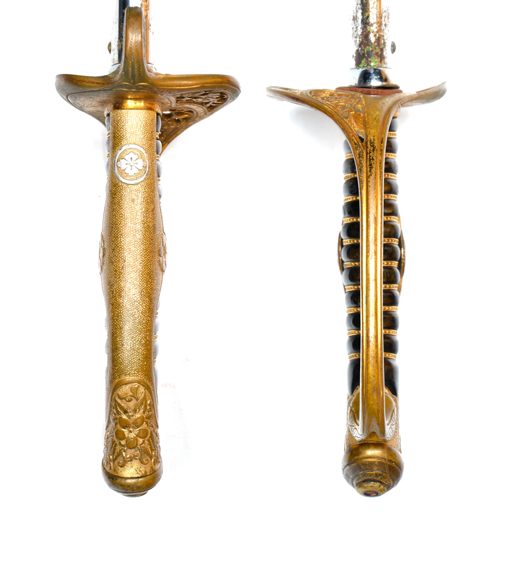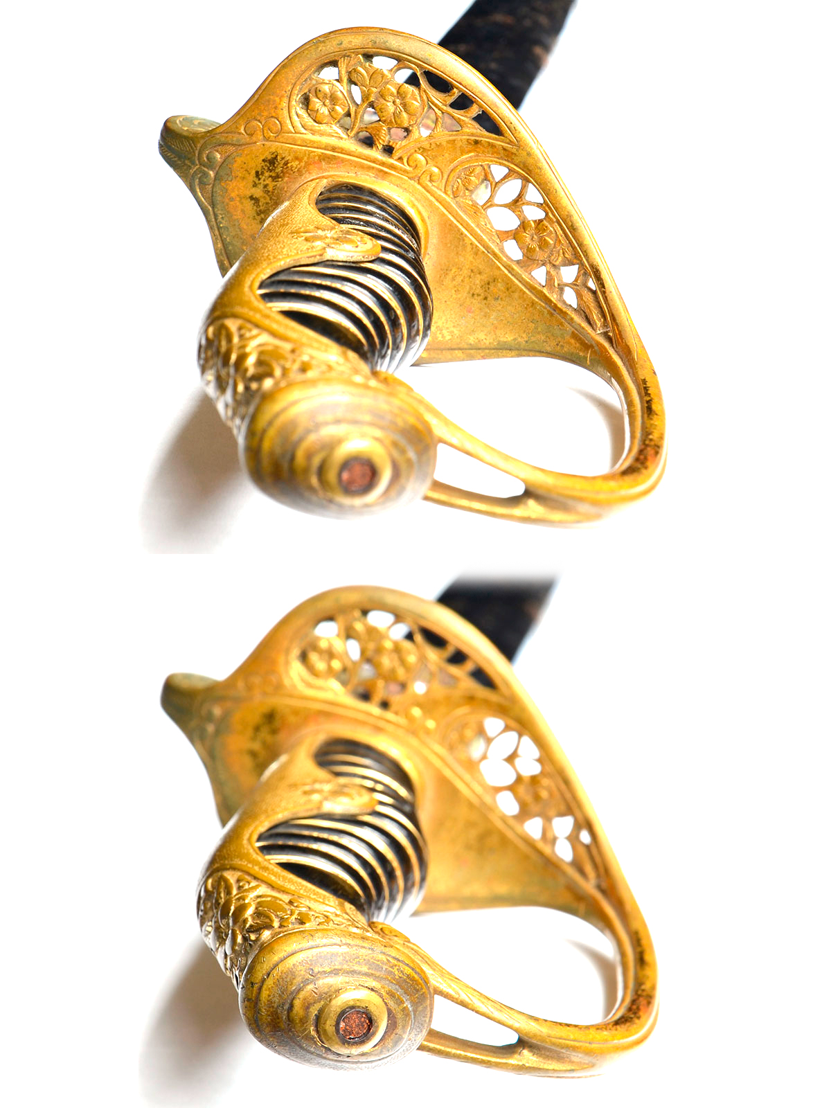 柄の金線の切れは無く、背金には丸に花菱紋が据えられており、刀身は当時のメッキ仕上げ模擬刀身で、メッキの状態は良い方です。
