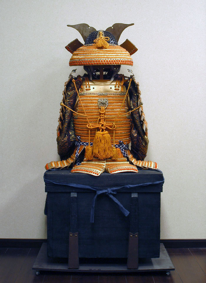 本品は、昭和30〜40年代頃に本歌甲冑から型を採り、当時の技術で精巧に仕上げられた美しい甲冑です。金地に緋縅がよく映え、華やかさと力強さを合わせ持つ絢爛豪華な一領で、床の間に飾れば場の格をぐっと高めてくれます。