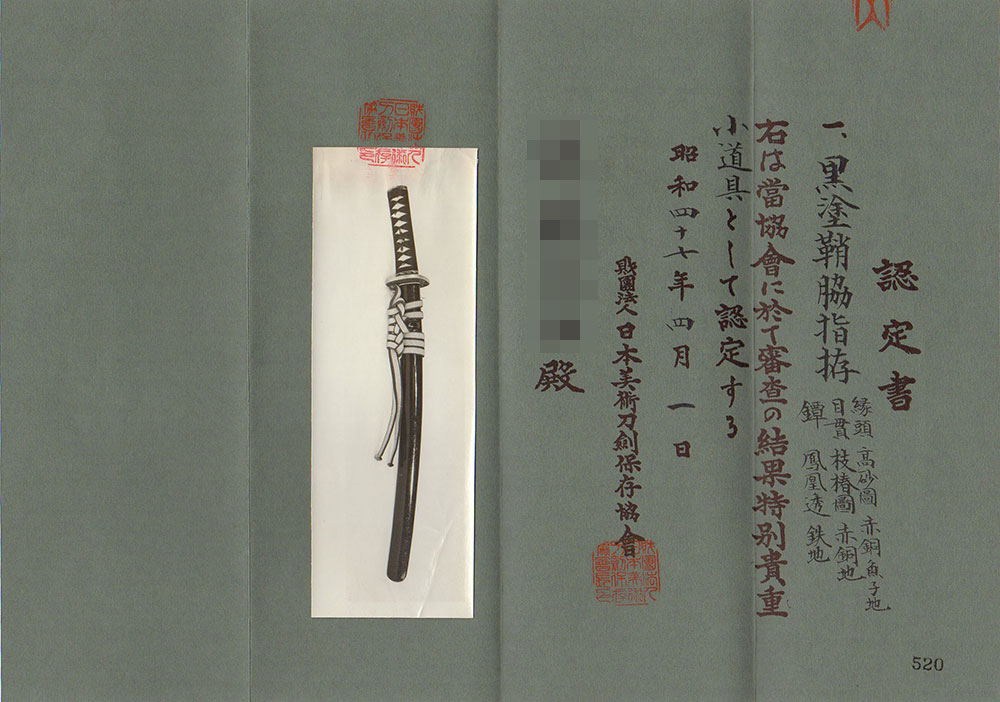 附属する拵は、高砂図の縁頭に、長州金工の名門である河治家の手に成る桐と鳳凰の透鐔が添えられ、金色の良い金覆輪がかけられています。目貫は梅図で小柄袋も桐に鳳凰図。柄巻きは上等な蛇腹巻きで、切羽は素銅地に金着せの豪華な品。はばきも往時の金着せで、名家で大切に伝来してきた様が窺がわれる名品です。