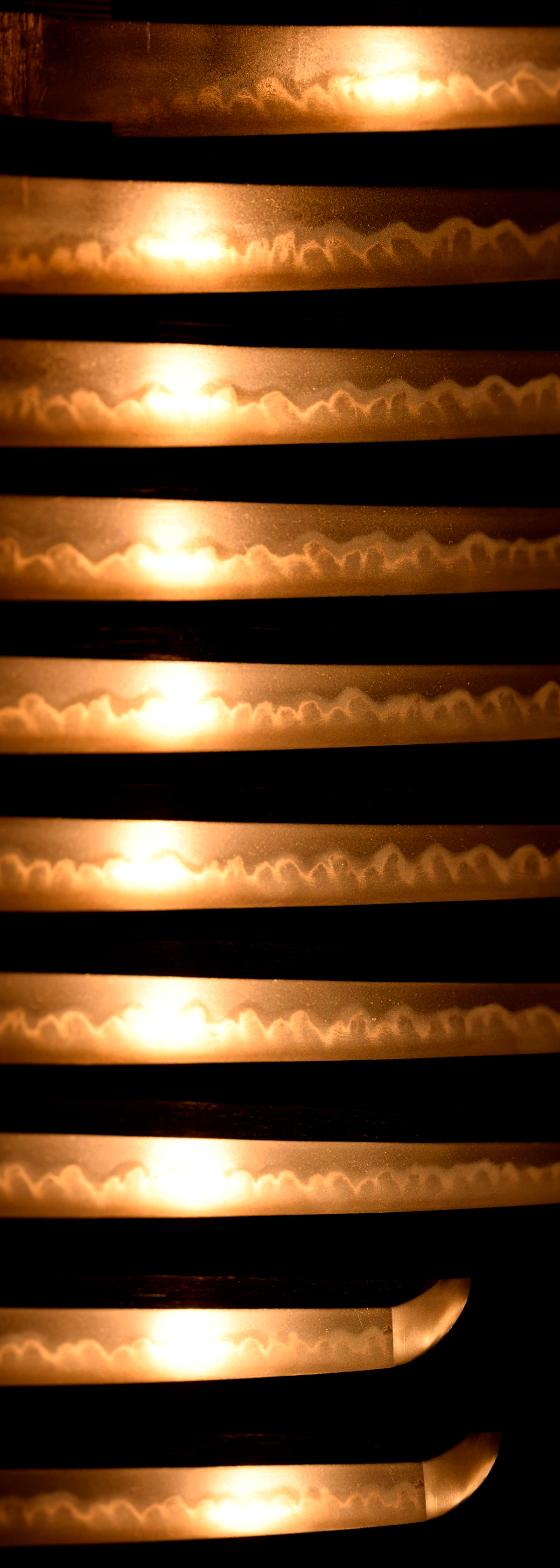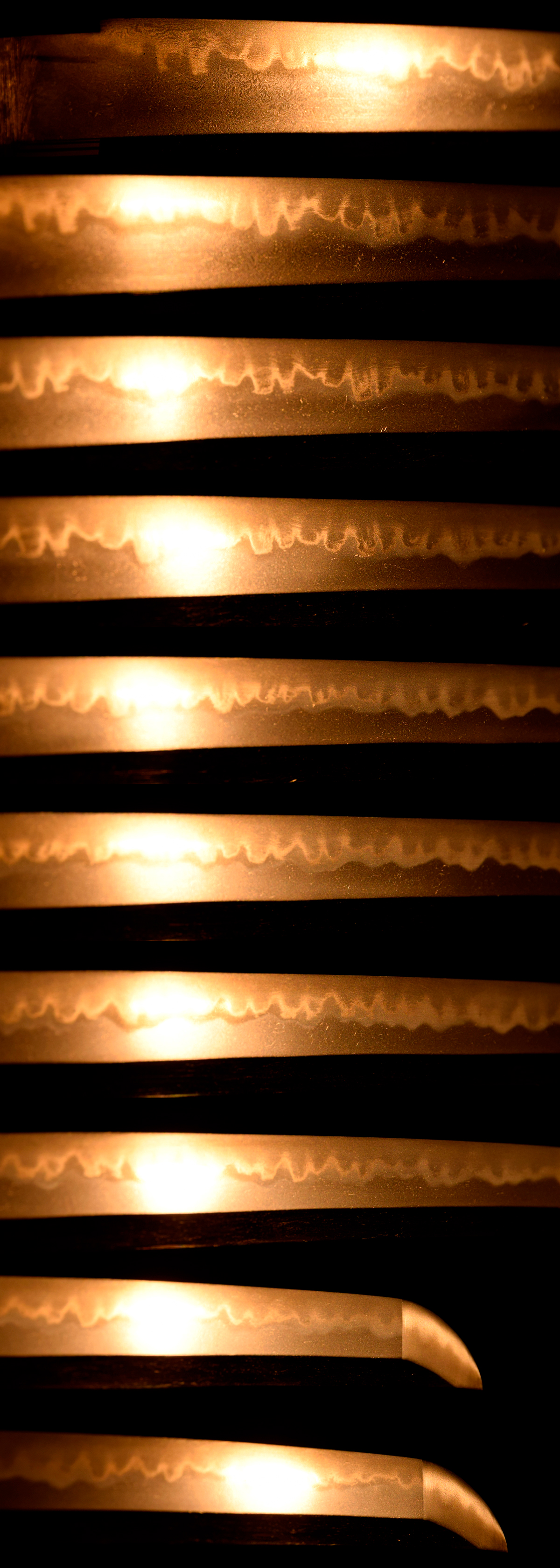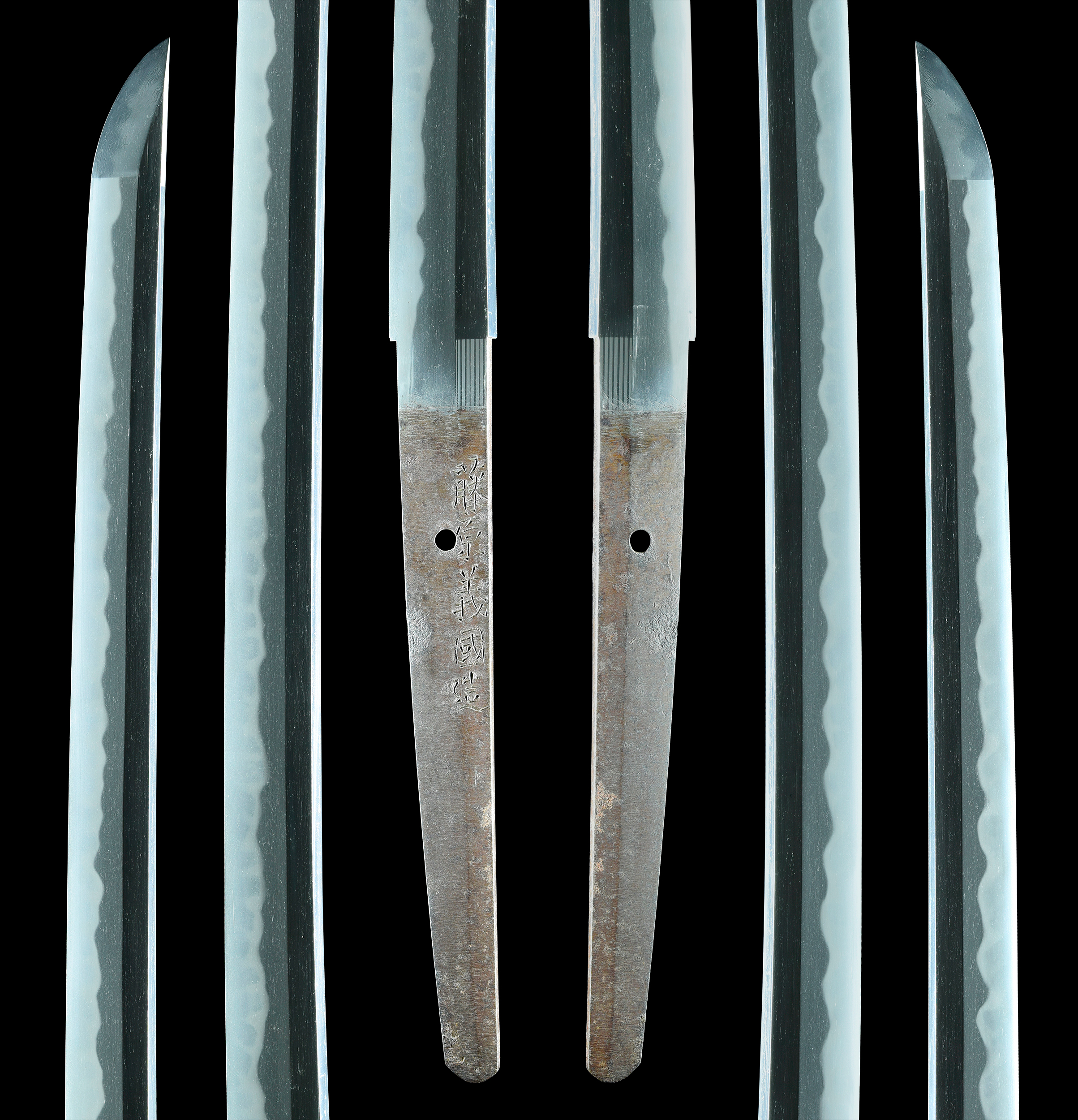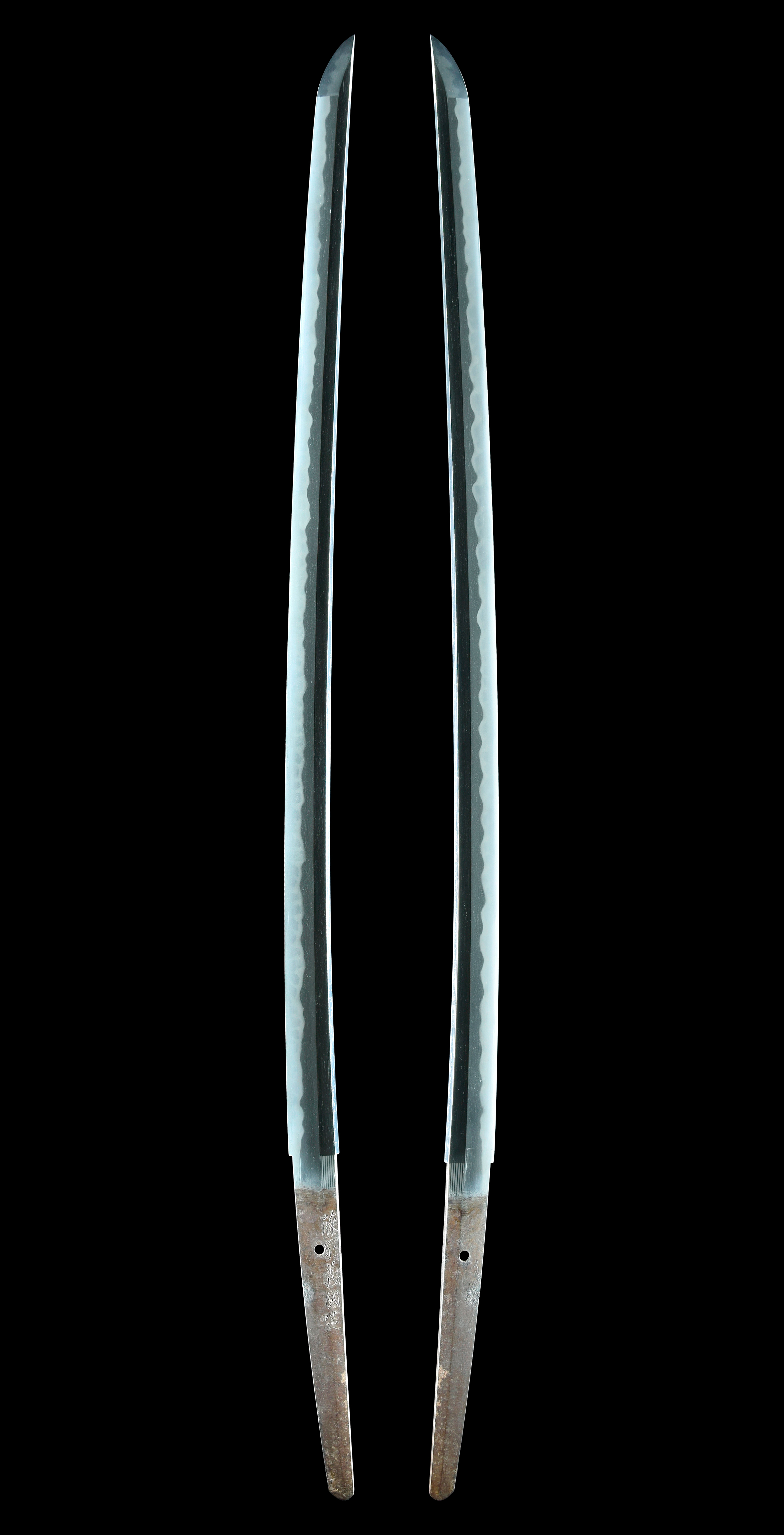 特筆すべき疵欠点は皆無で、杢目肌が緻密に練られ、少しく肌立ち、刃縁柾がかり、匂口明るい互ノ目丁子乱れを巧みに焼き上げ、刃縁には地鉄に絡んだ様々な働きと景色を見せ、覇気に満ちた出来口を示す作品です。