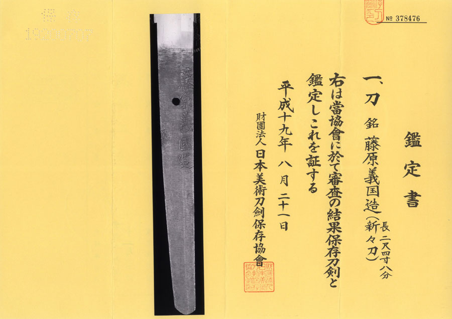 銘鑑によると新々刀期に義國を名乗る刀工が七名確認できますが、加藤姓や源姓を切っており、藤原姓を切る者が見当たらないため、日本美術刀剣保存協会もいずれの義國の作によるものかまでは判断できていないようです。場合によっては銘鑑漏れの刀工作かもしれません。