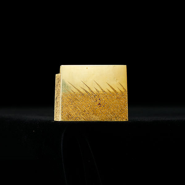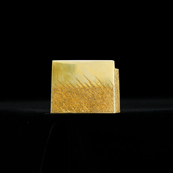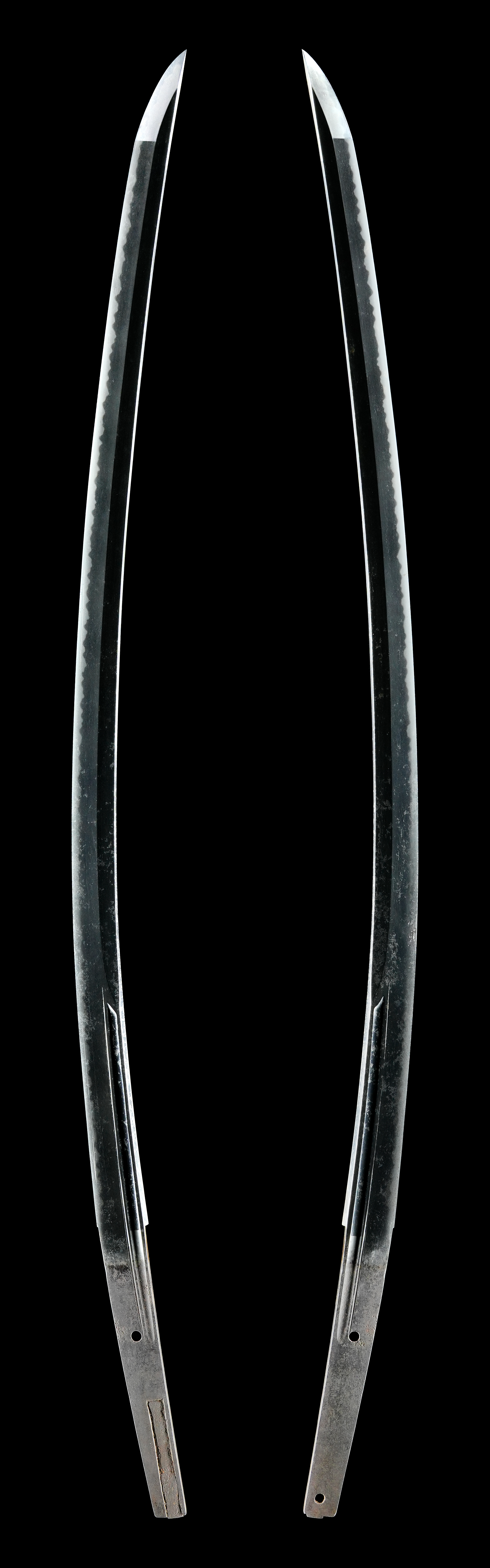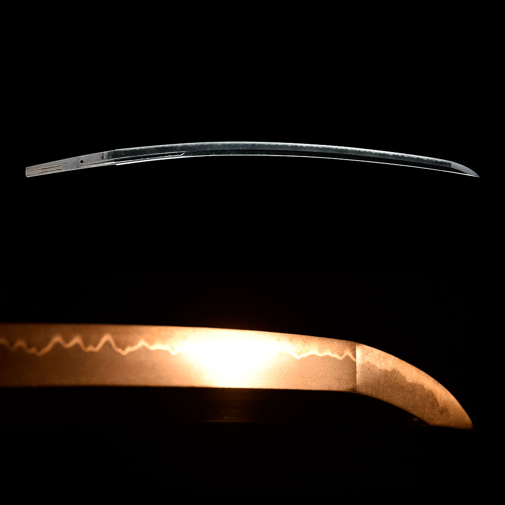 下平造で薙刀樋を掻き、その上からは冠落造とし、切先大きく延び、反り深く、豪壮な姿が印象的。地鉄は小板目杢交じり、よく錬れて詰んで地沸付き、刃文は匂口明るく冴えた互ノ目乱れで、互ノ目を二つ乃至三つ一山に刃取り、足よく入り、鋩子は乱れ込んで先丸く返る。