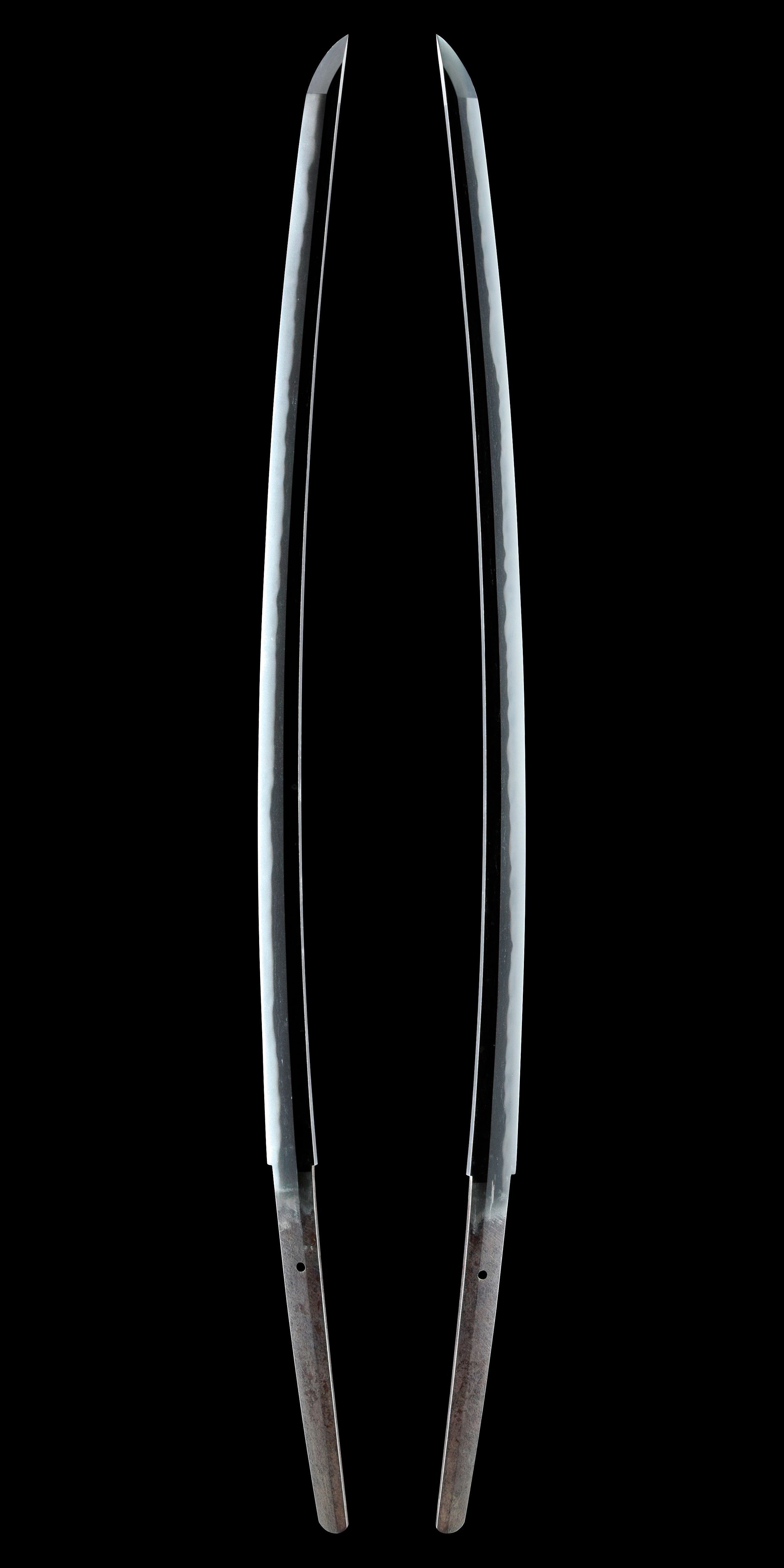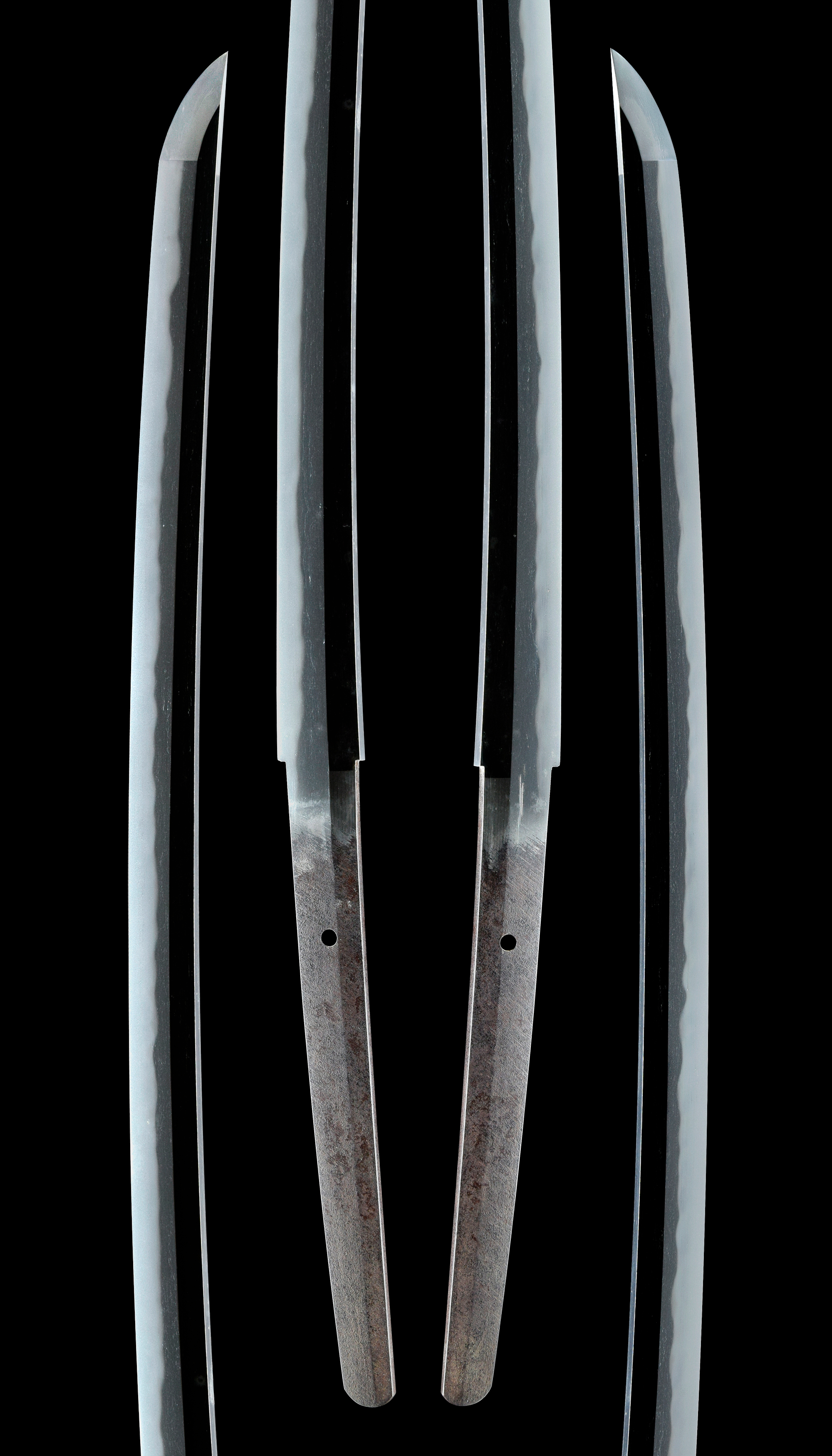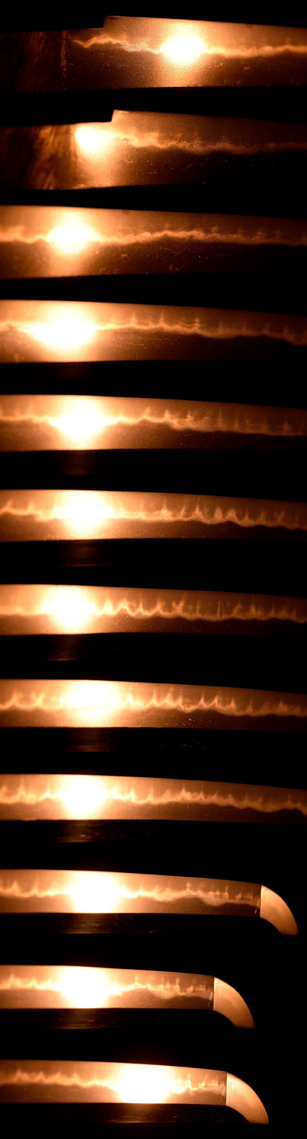 この刀は元先の幅差頃好く開いて切先延び、重ねやや厚目の力強い造り込み。地鉄は小板目柾流れ、地沸付いて地景入り、少しく肌立ち、刃文は匂口明るく冴えた互ノ目乱れで、刃中には葉入り、刃先に抜けんばかりの長い足が頻りに入り、砂流かかり、金筋、稲妻を呈し、刃縁にはやや大粒の沸が取り巻く。鋩子は表裏共に直ぐに先丸く返る。