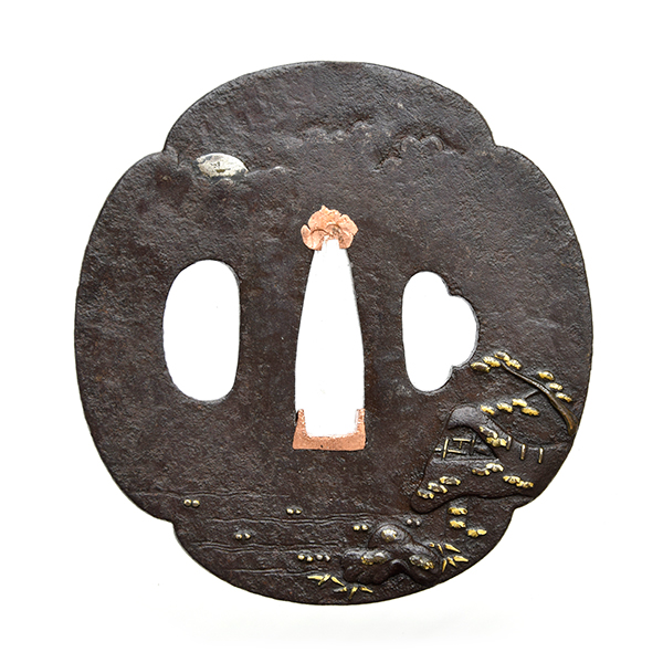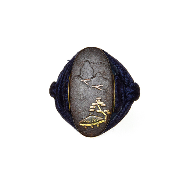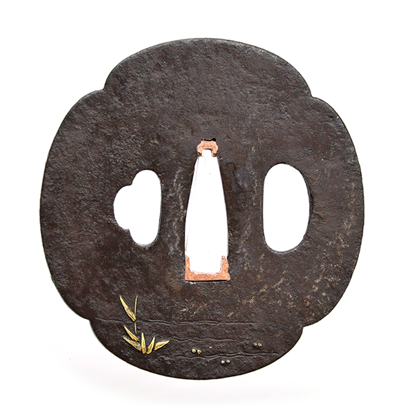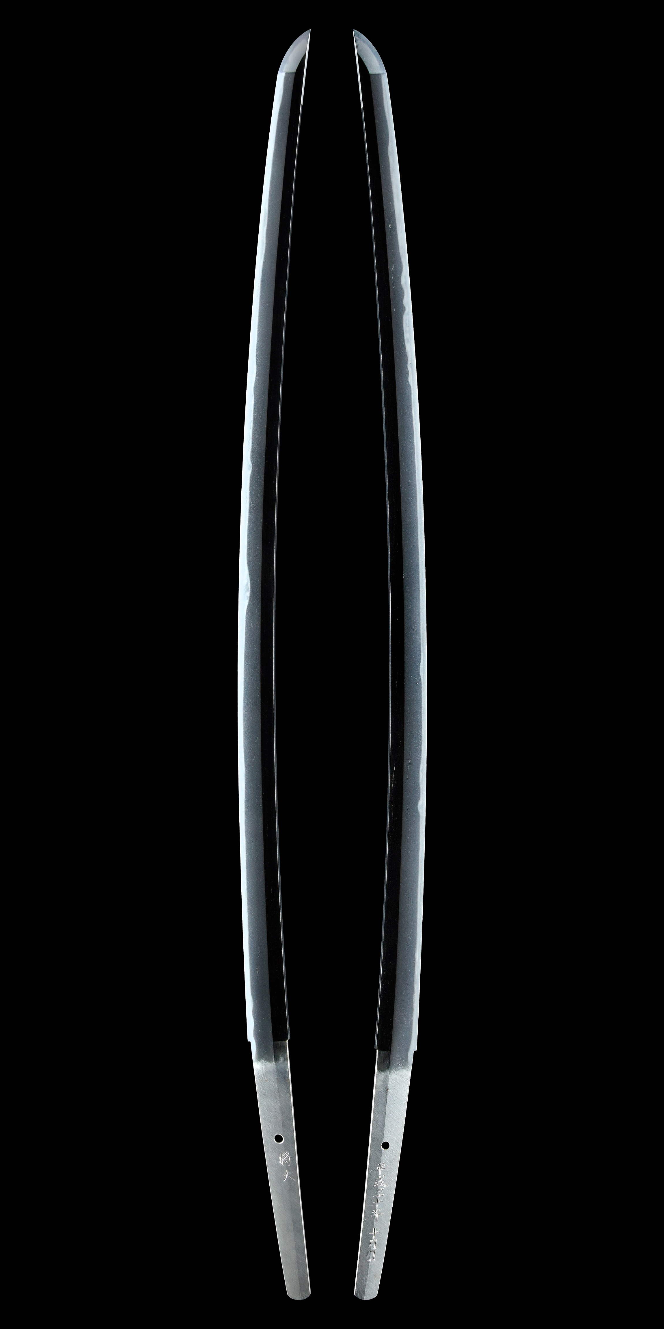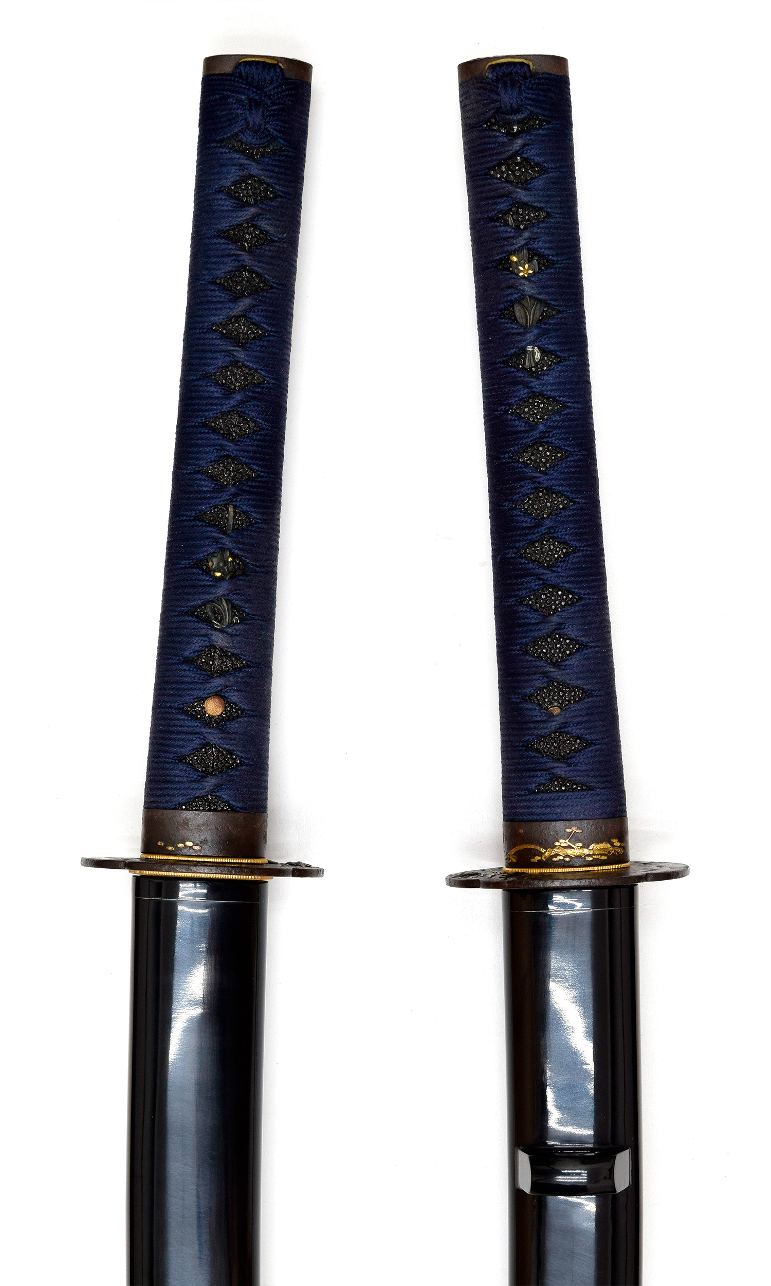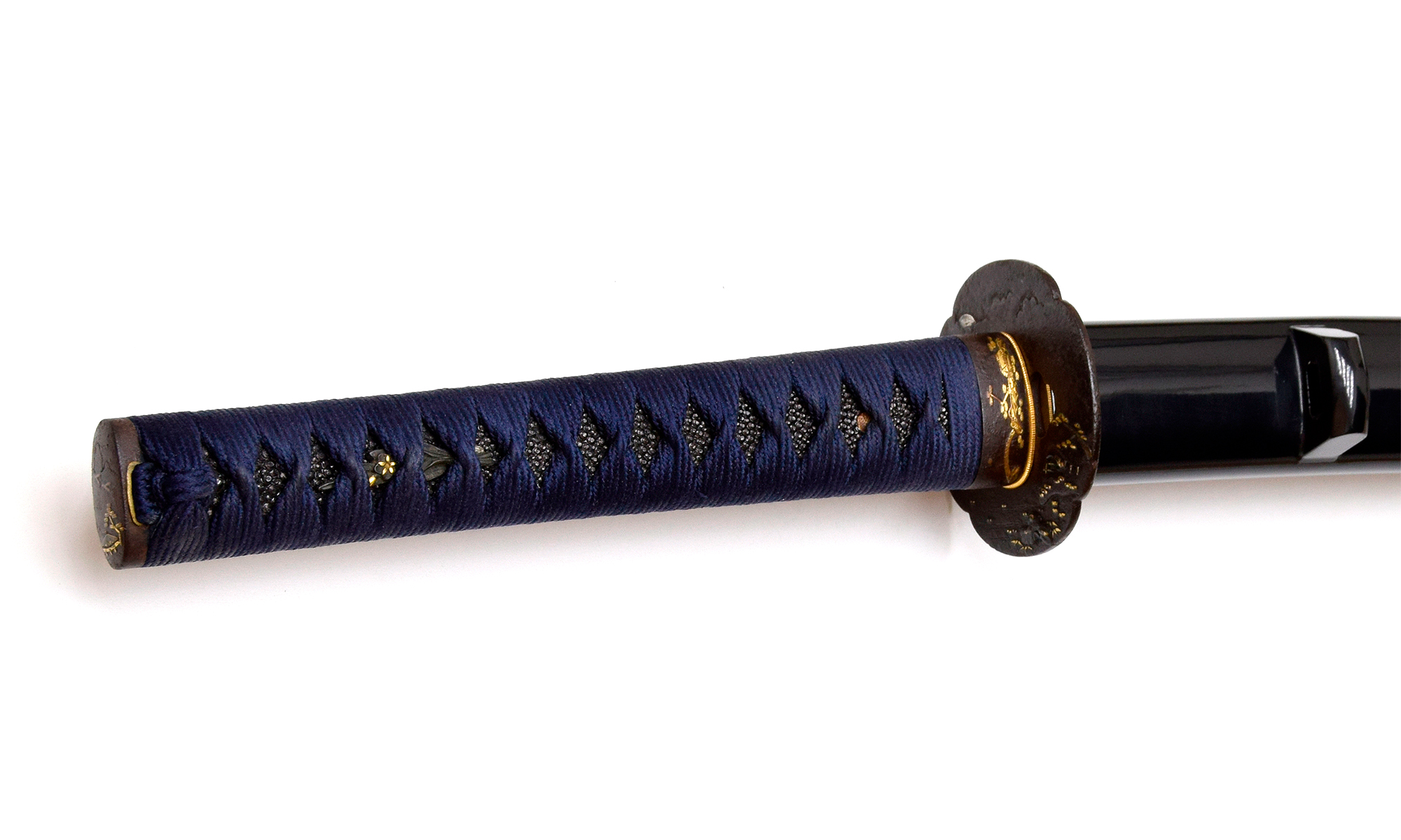 当然ながら拵はこの刀のために誂えられた特注品で、柄は現在一般的になっている八寸五分より短め。鐔は刃長の割に小振りなものが添えられ、柄木には親粒が付いた鮫皮を贅沢に一枚で着せ、黒塗で仕上げられています。金具は全て時代物を使用しています。