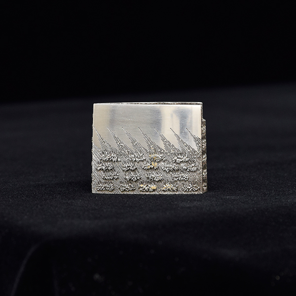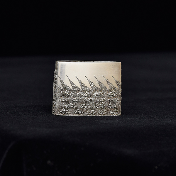 この刀は岩手県で発見された古い時代の玉鋼を用いて作刀されたもので、刃文の構成等はまだまだ研究の余地が感じられるも、小板目肌が少しく肌立ち、地景入り、判然たる映りが立っています。刃文は匂口ふわりと柔らかい感じで細かな砂流かかり、金筋、小足入り、打除、湯走を交えた古雅な雰囲気を醸し出しています。