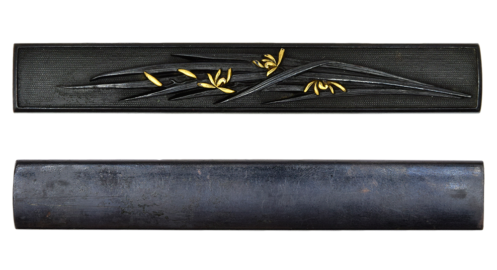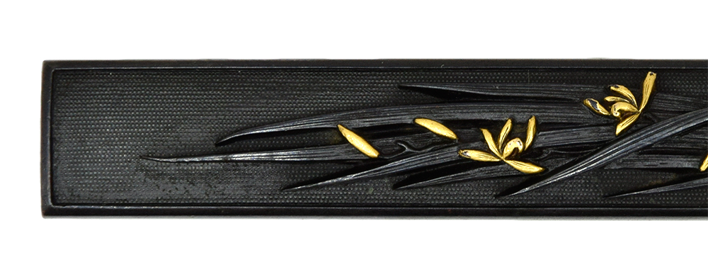 色味良い赤銅に細かな魚子を打ち、かなり肉高な菖蒲を据え置いた逸品。菖蒲図は勝負と語呂が同じということもあり、昔から武辺者に好まれた図柄です。