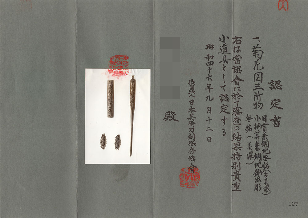 赤銅地。古美濃極めの目貫と共に三所物として特別貴重小道具認定書が交付されていますが、現在は目貫が失われており、小柄笄の二所物となっております。