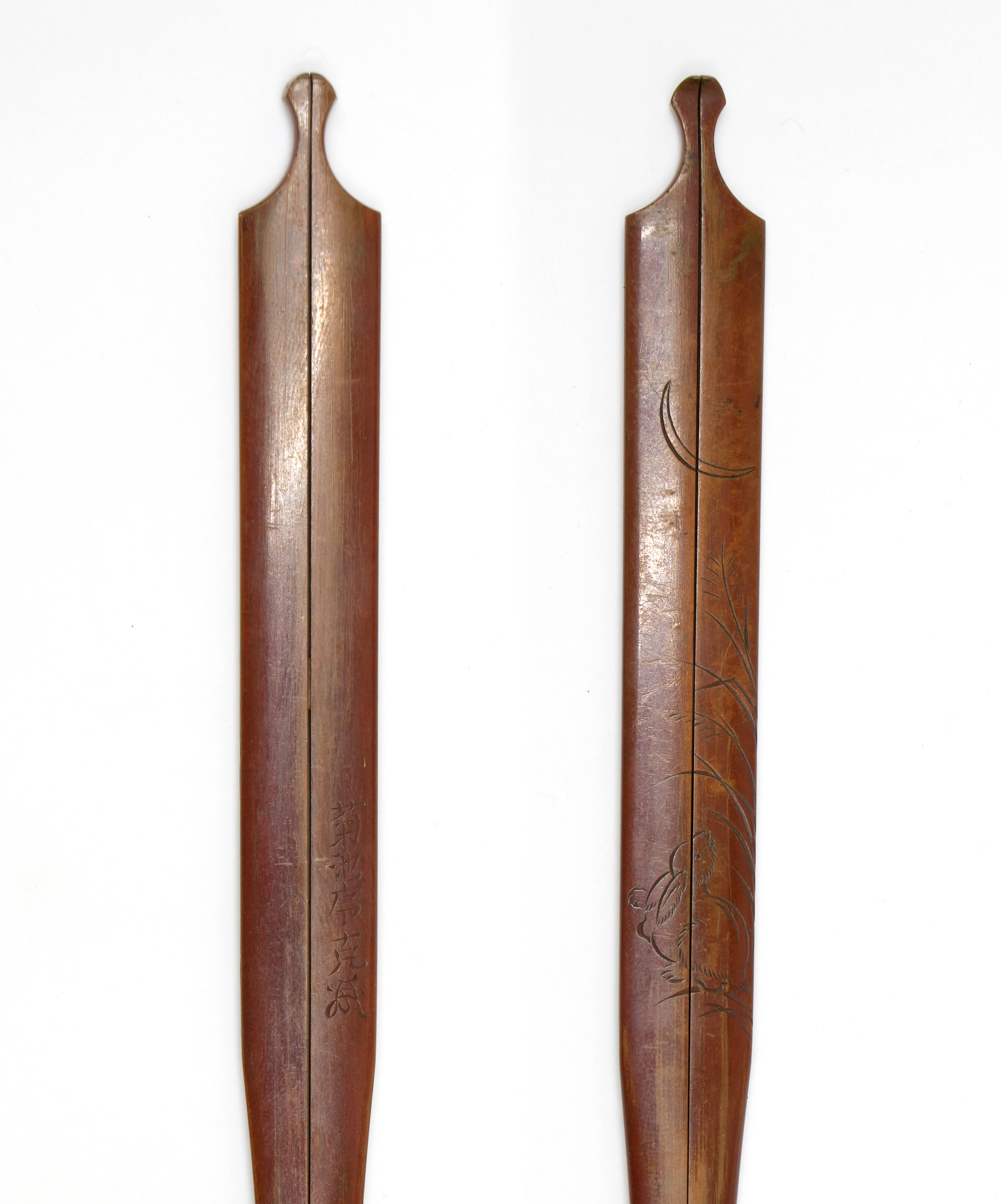 この割笄は、素銅磨地に序克得意の片切彫りにて、三日月を見上げる兎をなんとも愛らしく表した作品で、飾り気がない素朴な中に気品を漂わせる逸品です。