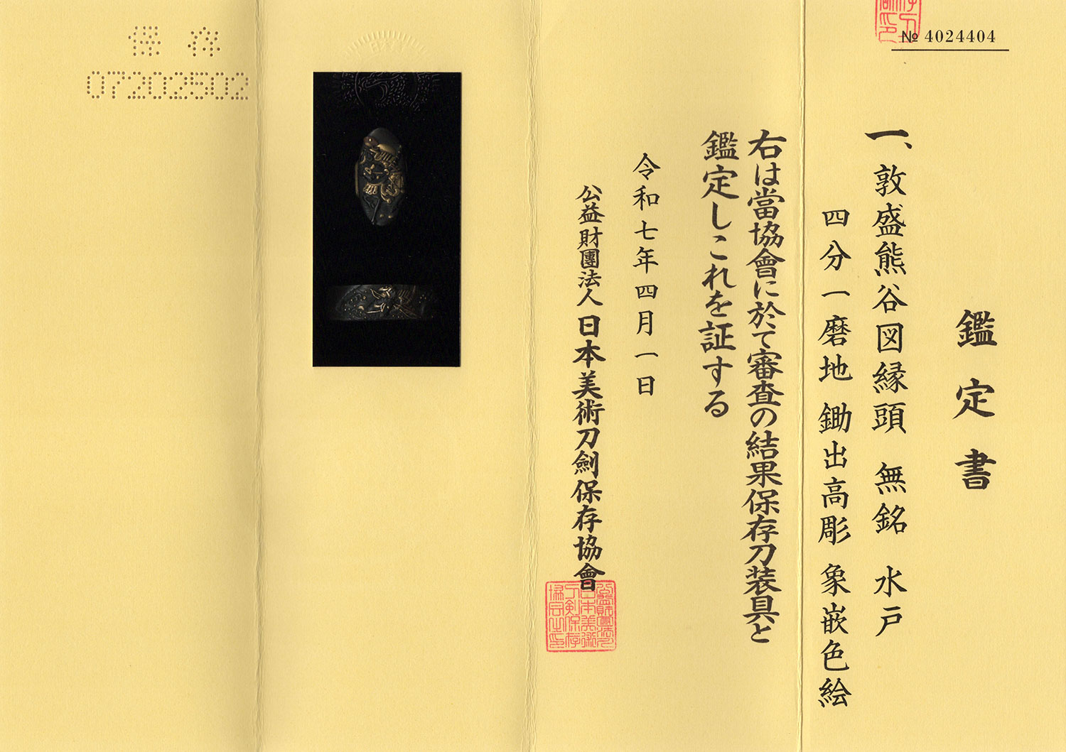 この縁頭は、四分一地に『平家物語』屋島合戦での平敦盛最期の場面を、卓越した彫金技法によって見事に表した作品です。頭には、扇を掲げて敦盛を呼び止める熊谷直実の姿を、縁には、その呼びかけに振り返る敦盛の瞬間を写実的かつ躍動感あふれる描写で表現しています。物語性と造形美が見事に融合した、まさに逸品と申せましょう。
