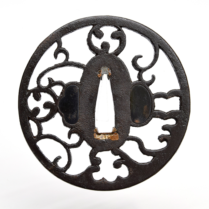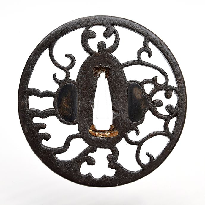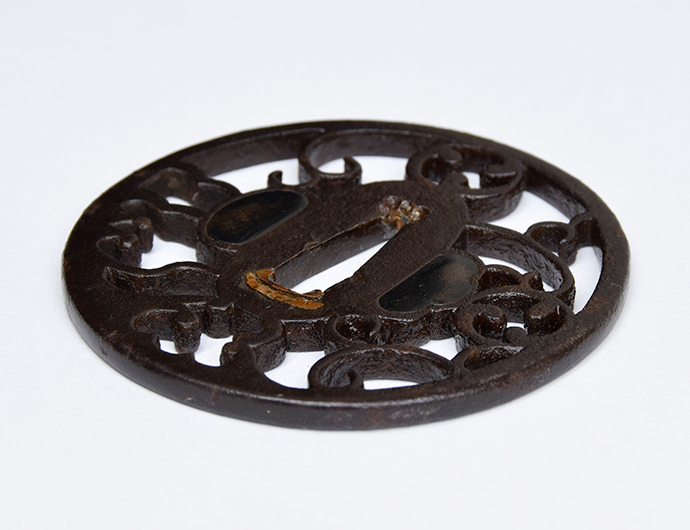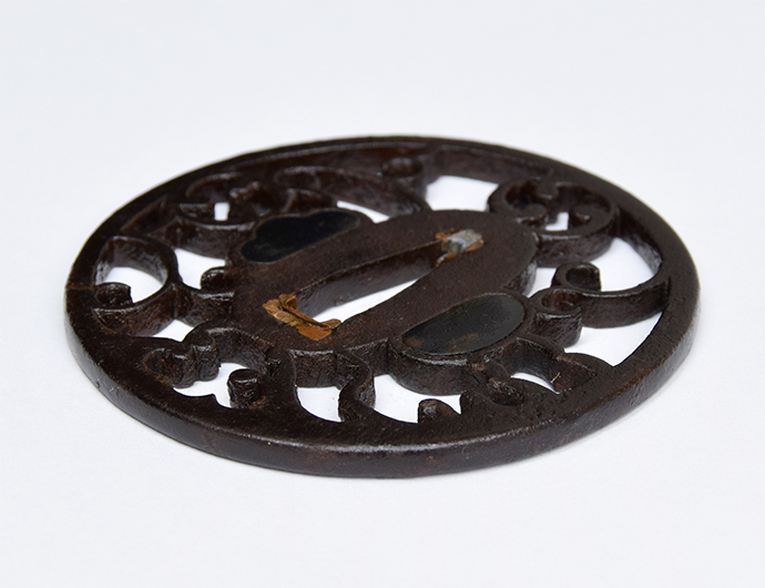 鉄地に左三つ巴と唐草を透かし彫りにした一枚。寸法的に刀の拵に向いています。