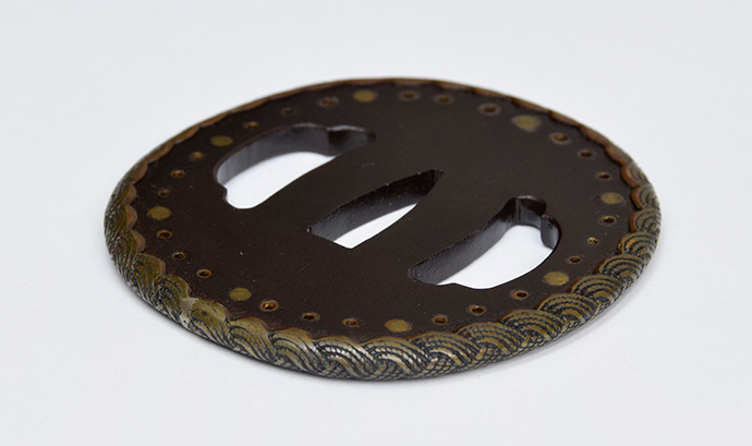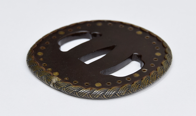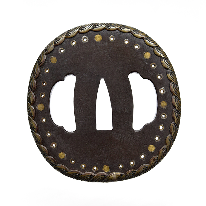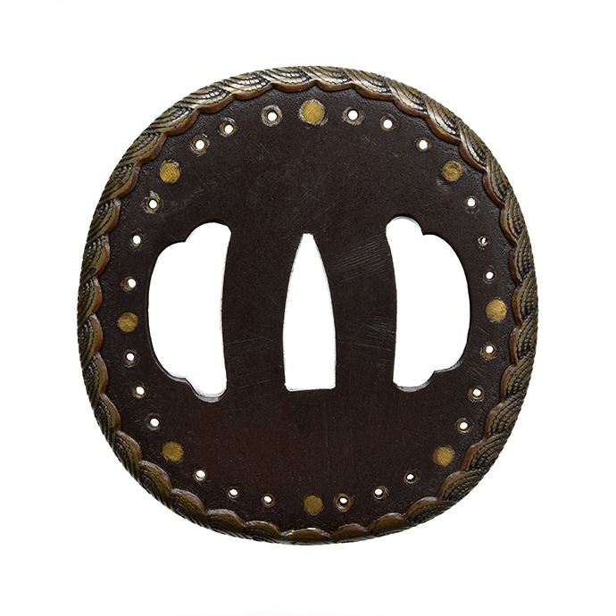 縄目模様の異形な宣徳地覆輪と、その下に小さく多数開けられた穴が印象的。鉄味も良く脇指から短寸の刀迄幅広く合う一枚。