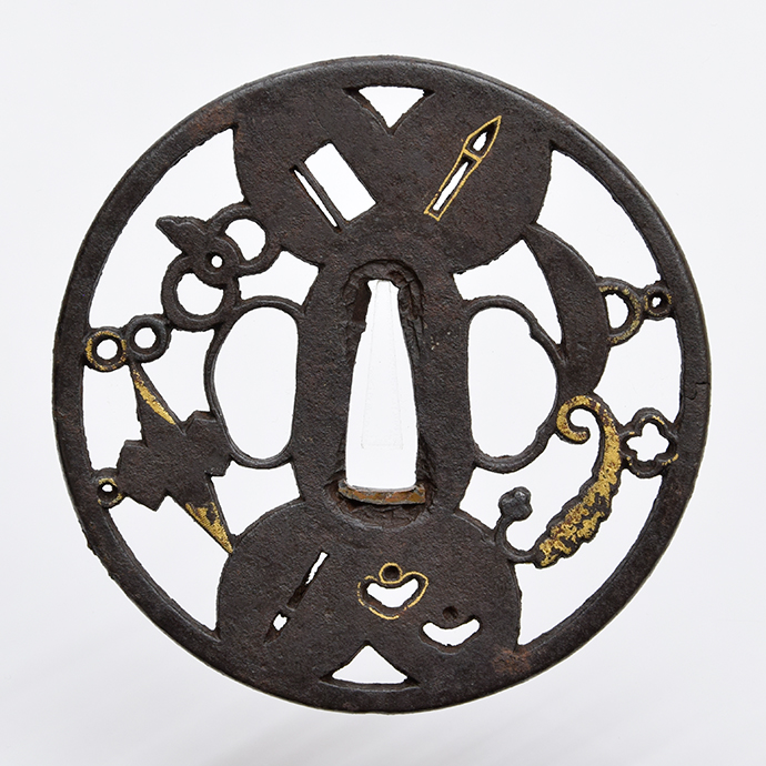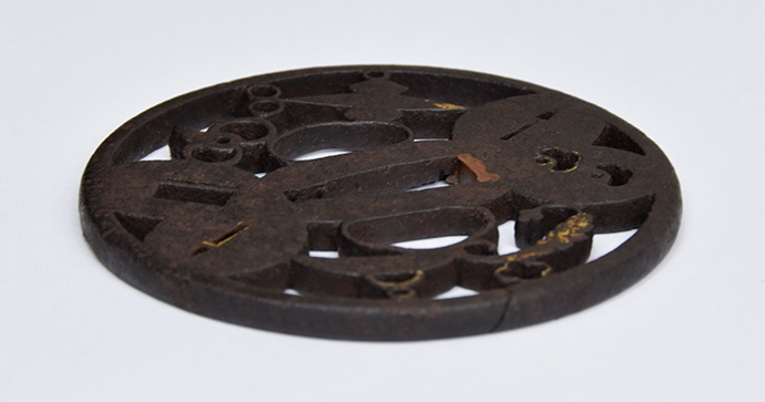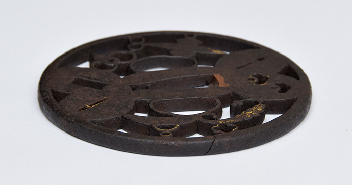 鉄地の大振りな透かし鐔。耳の一部に皹割れが一箇所あるのが惜しまれます。