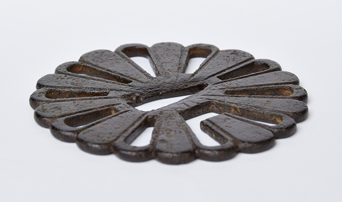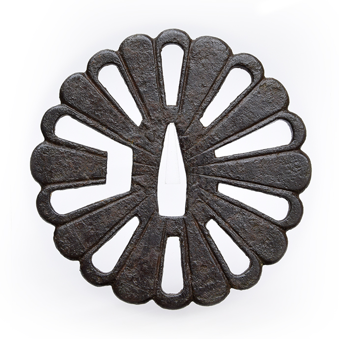 95ミリを超えるかなり大振りな鐔。菊花弁を陰陽で透かし彫りに仕上げている。三尺を超える長寸刀にもお使い頂けます。