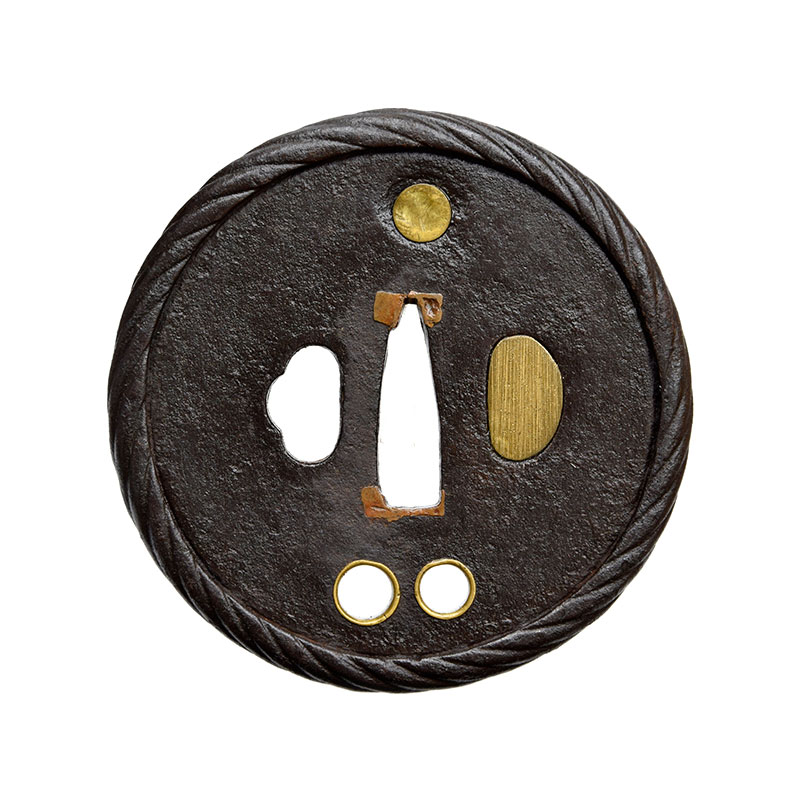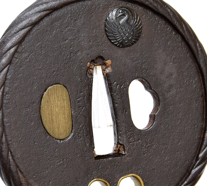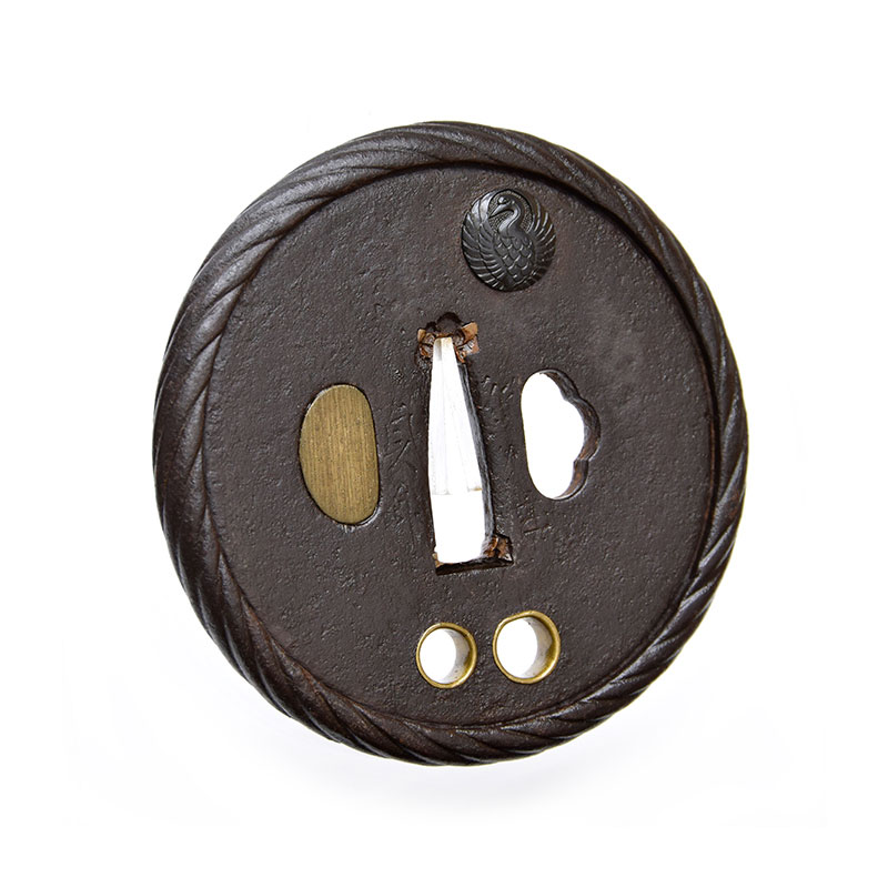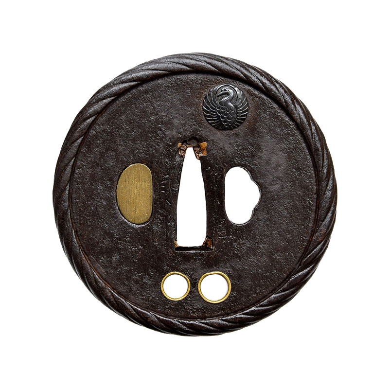 この鐔は、耳を厚く綱模様に仕立て、手貫緒の穴を穿いて真鍮覆輪をかけ、武骨な感じを強く漂わせる一枚。赤銅で造られた漆黒の鶴丸紋が武骨一辺倒な造りの中に華を添えた名品。