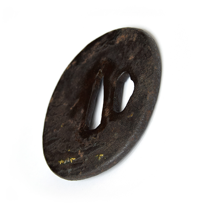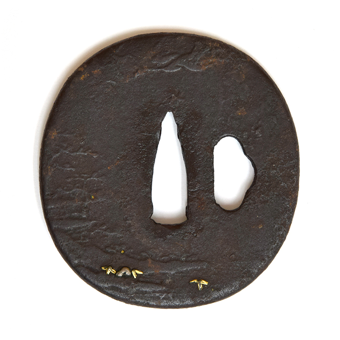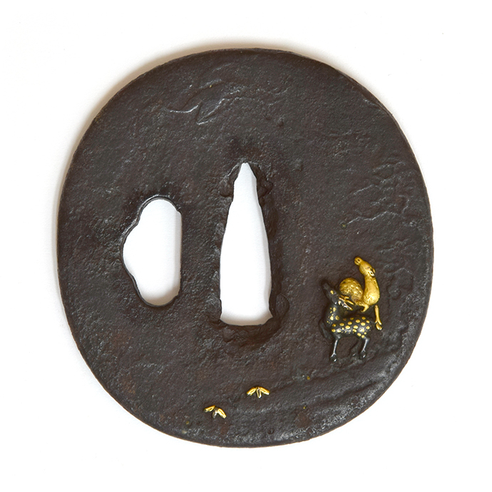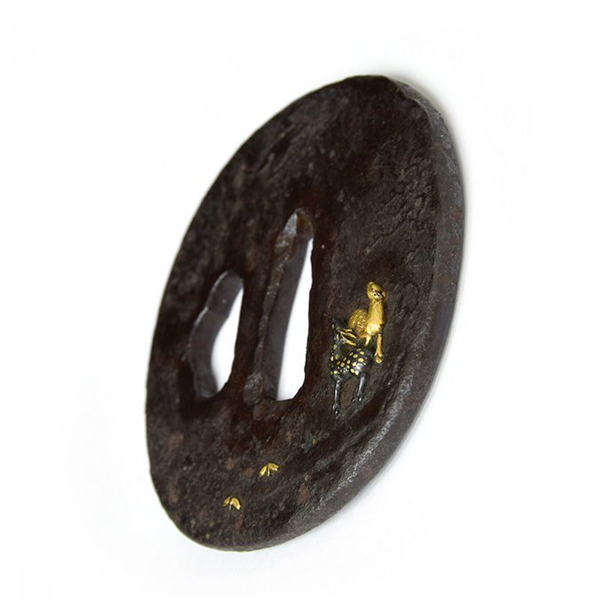 薄肉彫りで薄らと表現した背景に、躍動感溢れる雌雄の鹿を姿彫にて象嵌することで、奥行きを感じさせ、広大な春日の自然を一枚の鐔に収めた作品。