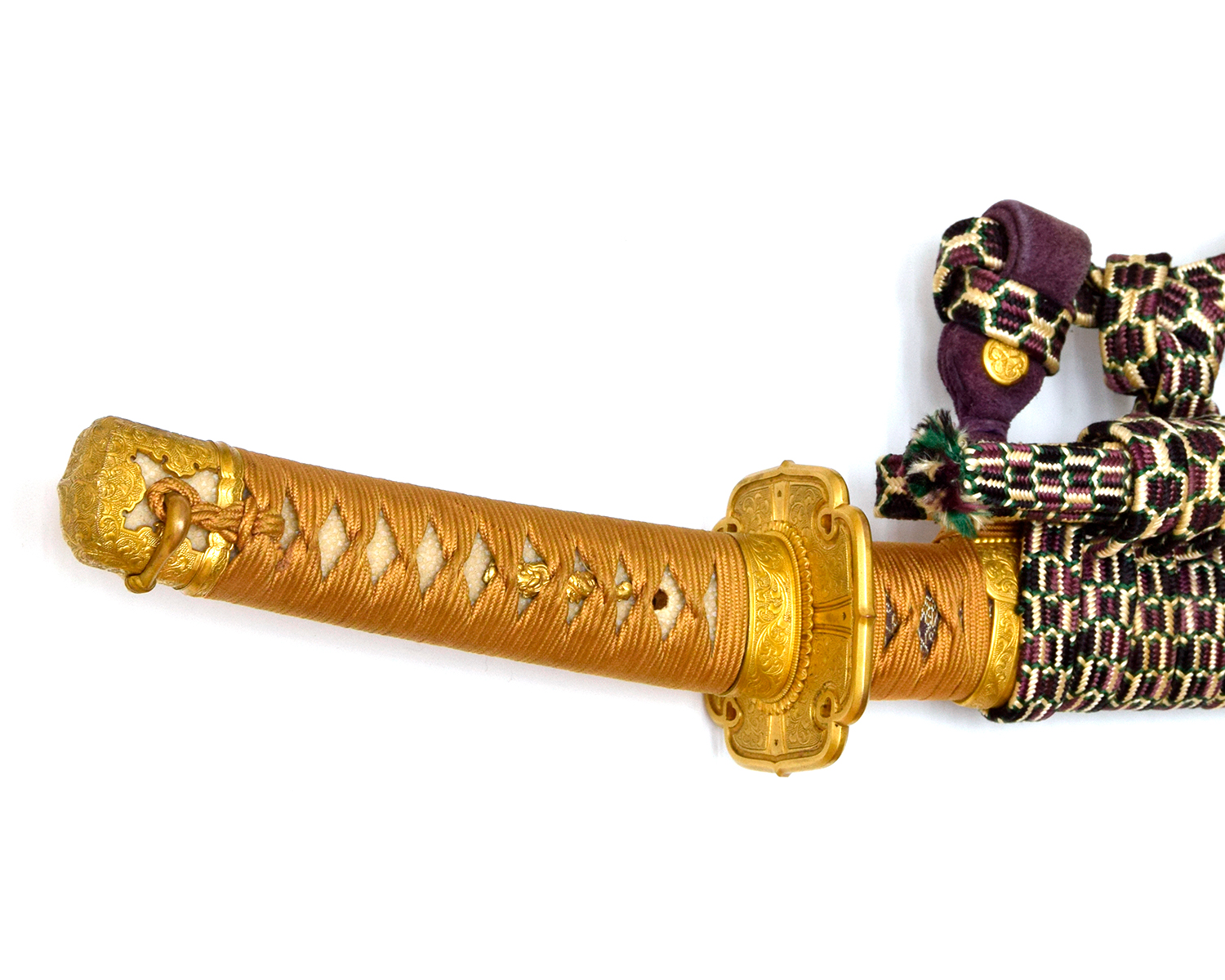 | 付属 | 銀はばき、金梨地塗葵紋蒔絵鞘糸巻稚児太刀拵、白鞘 / 継木 |
