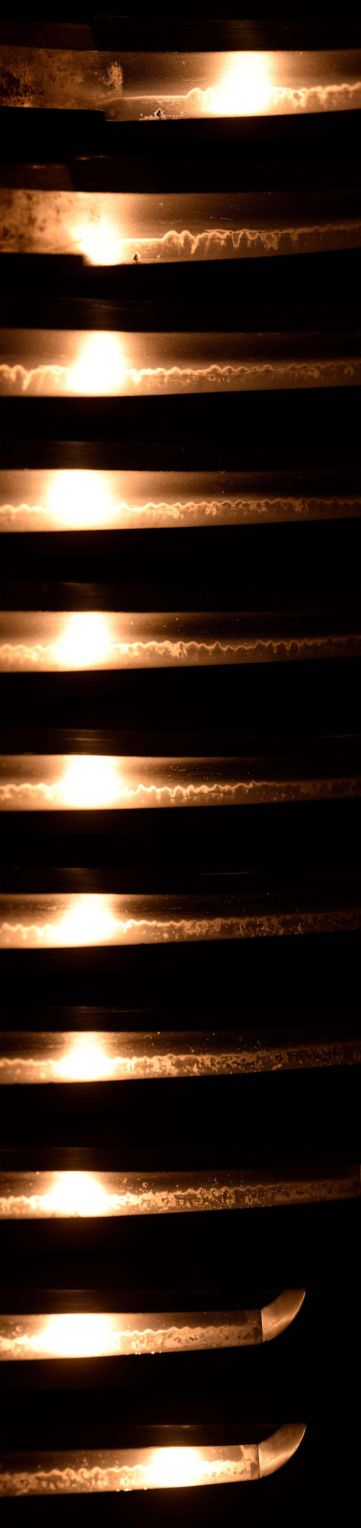 元先の幅差目立っては開かず切先やや延びる。地鉄は純然たる柾目鍛えでよく錬れており、地沸付いて地景入る。刃文は匂口明るく冴えた互ノ目乱れに互ノ目丁字を交え、足、葉頻りに入り、鋩子は直ぐ調に先焼詰風に極短く返る。