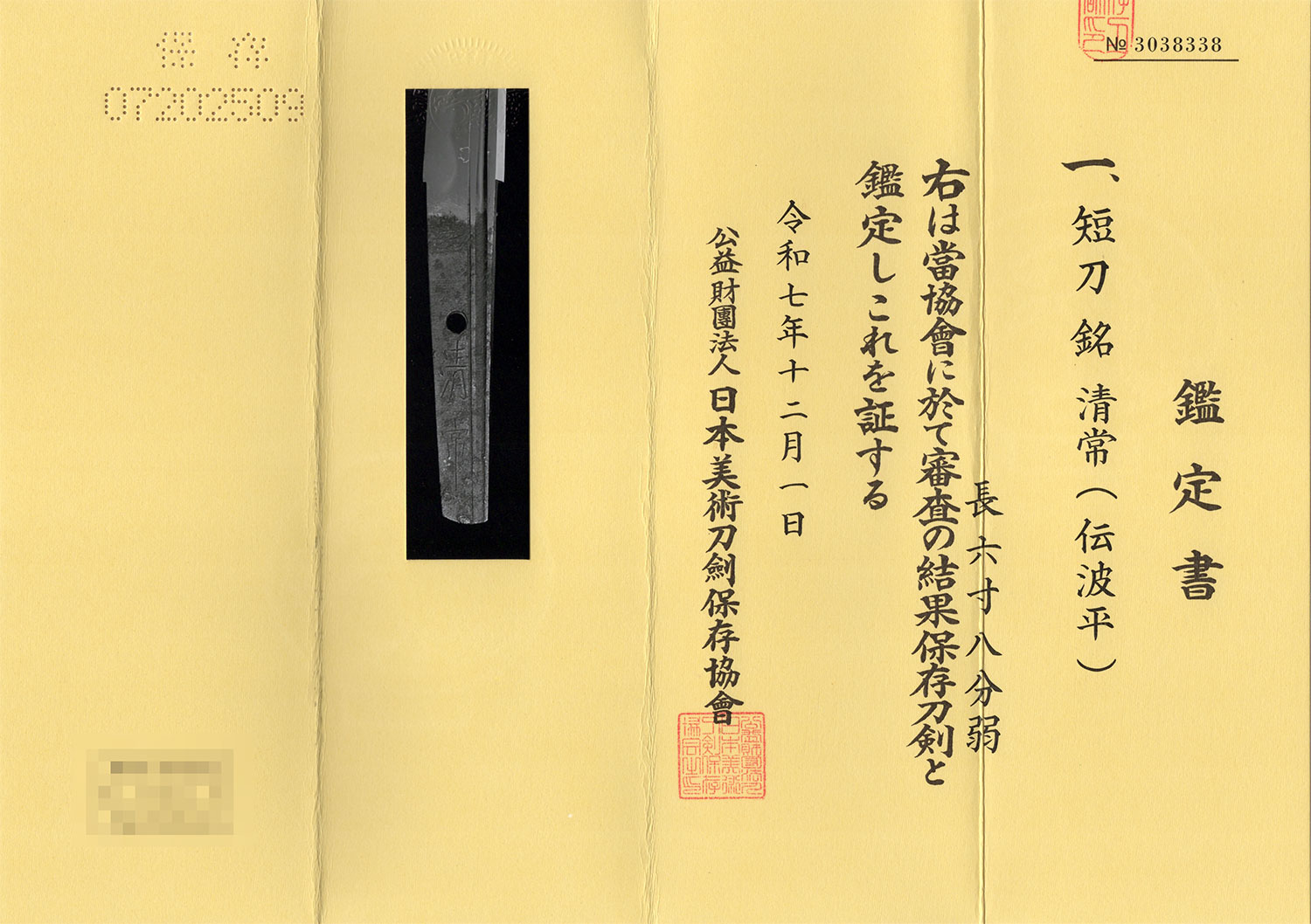 本短刀は、日本美術刀剣保存協会に於いて波平派の常清であろうと極められた一刀です。銘鑑を繙くに、同派には室町中期・応仁頃と室町後期・天文頃の二名の常清が確認されております。