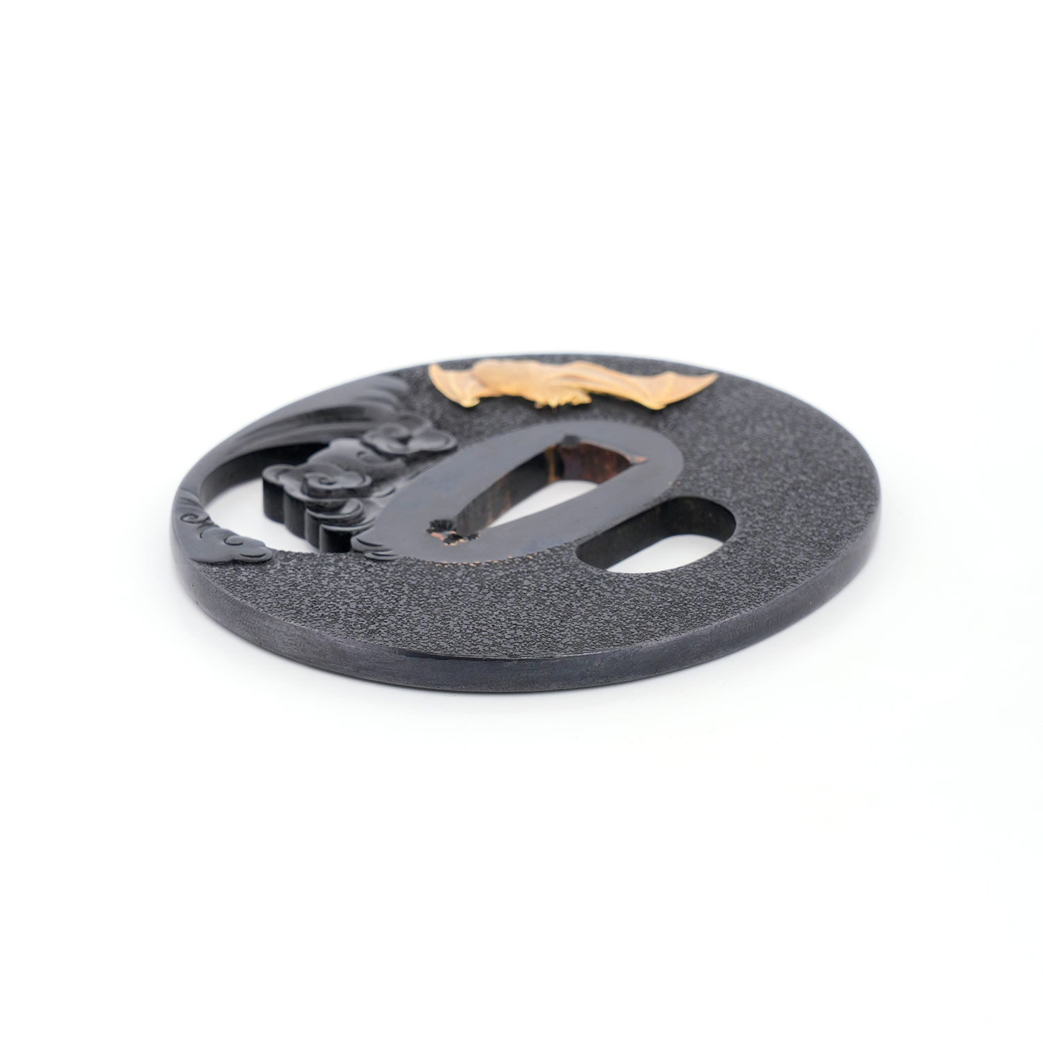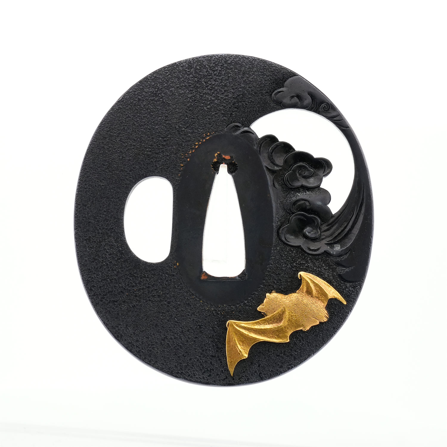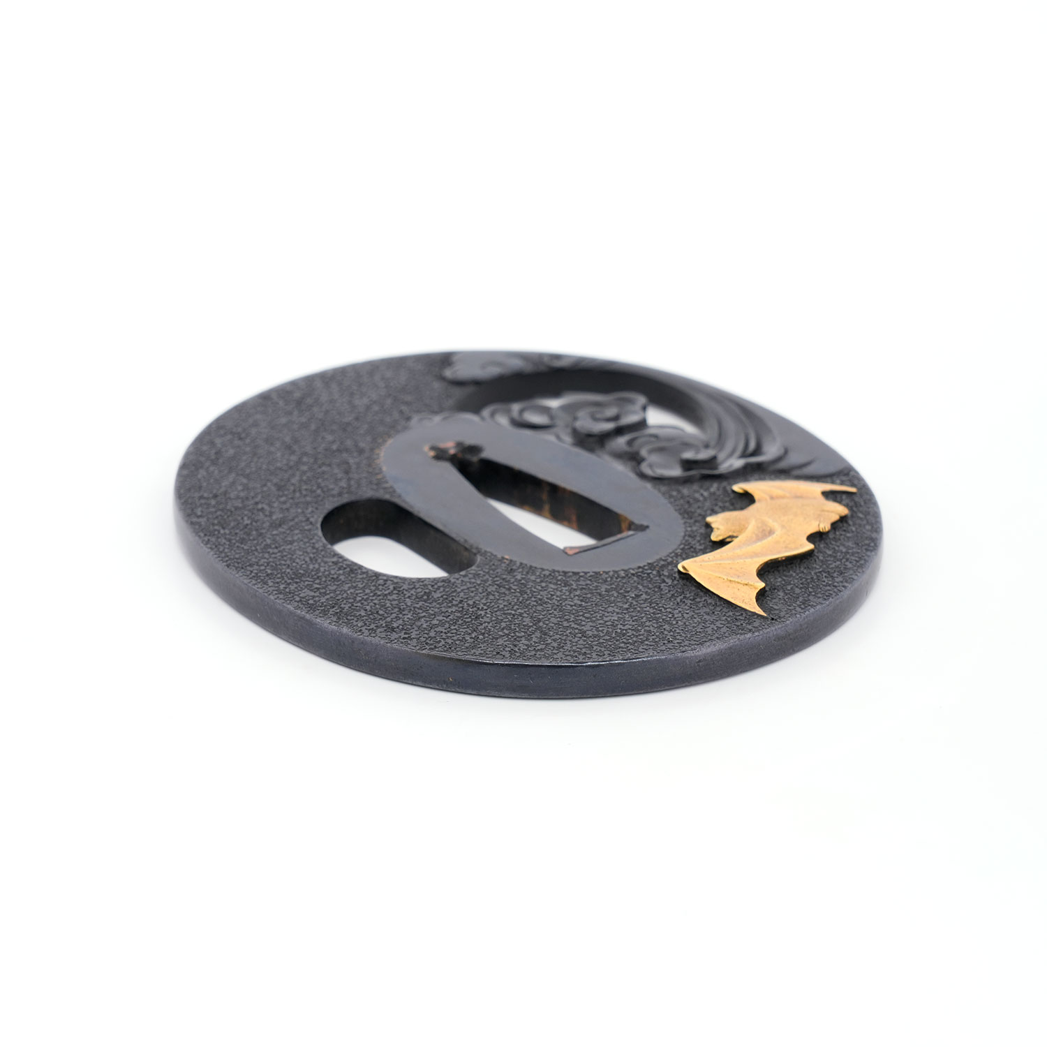 蝙蝠の毛並みは繊細に刻まれ、羽には細やかな槌目を打つことで質感を巧みに表現。写実性に富みながらも、幻想的な情景を併せ持つ、まさに名工の冴えを堪能できる鐔でございます。