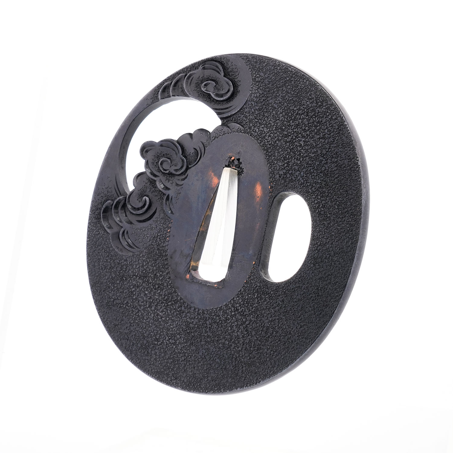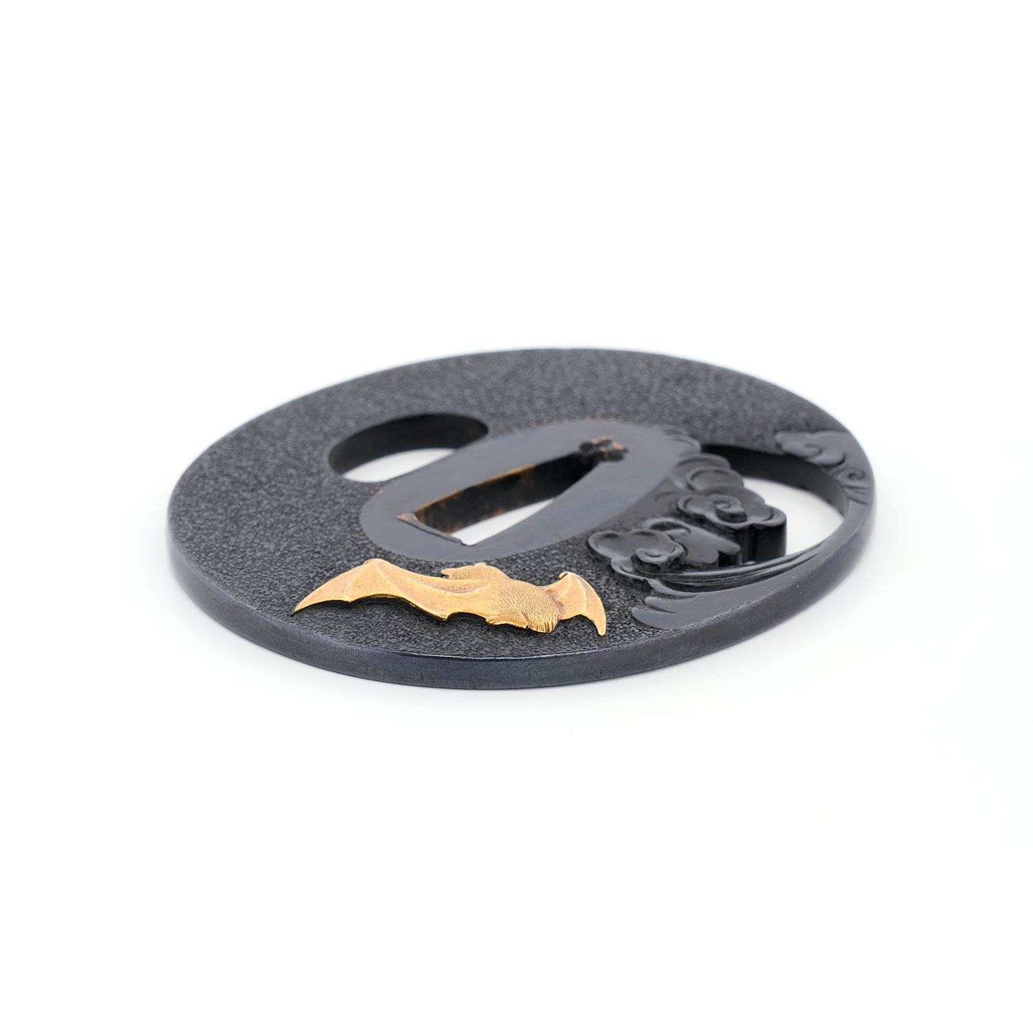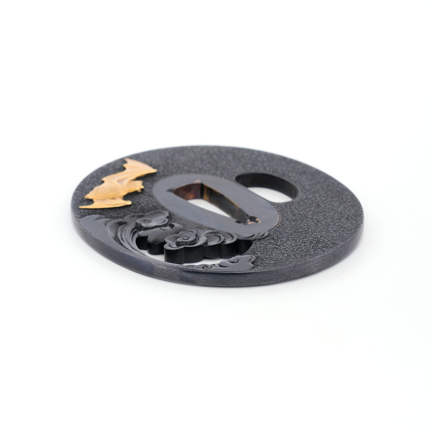 蝙蝠の毛並みは繊細に刻まれ、羽には細やかな槌目を打つことで質感を巧みに表現。写実性に富みながらも、幻想的な情景を併せ持つ、まさに名工の冴えを堪能できる鐔でございます。