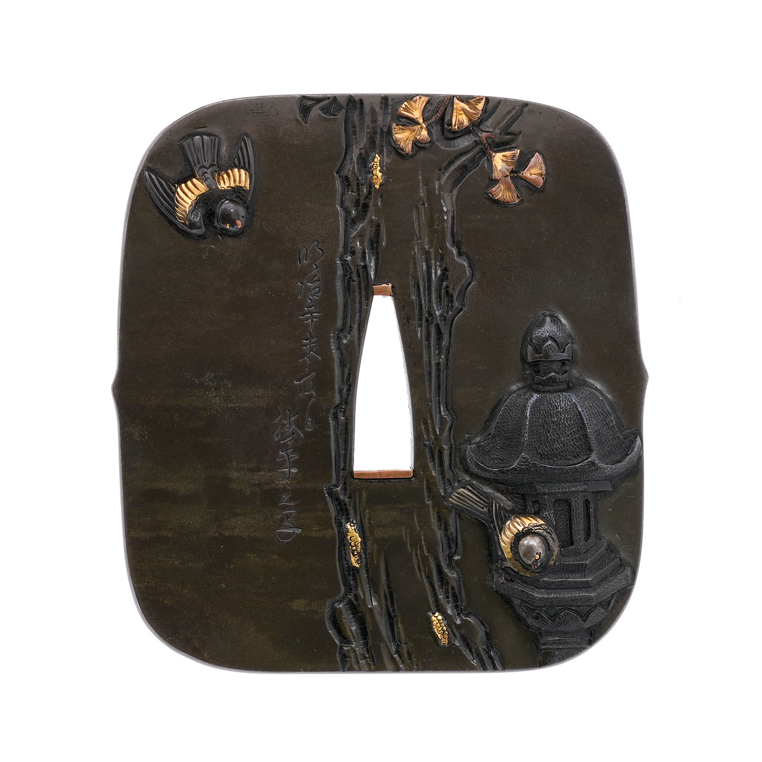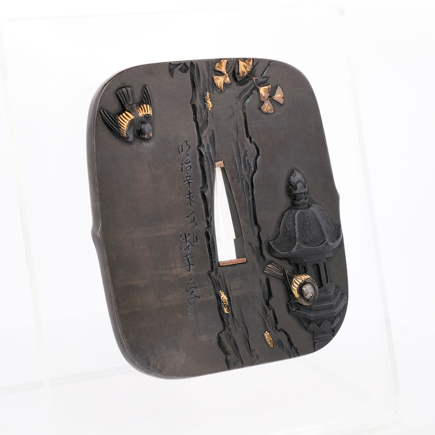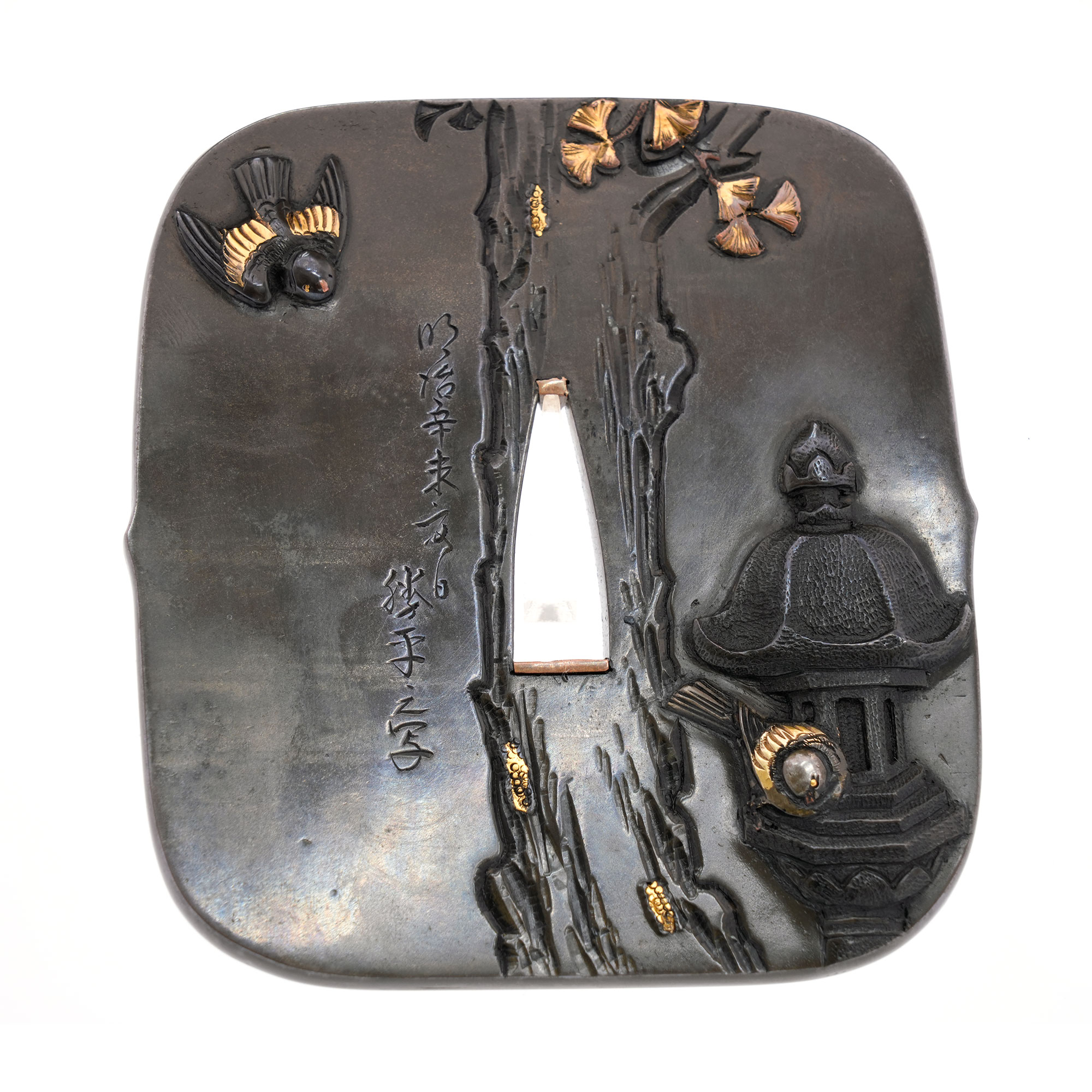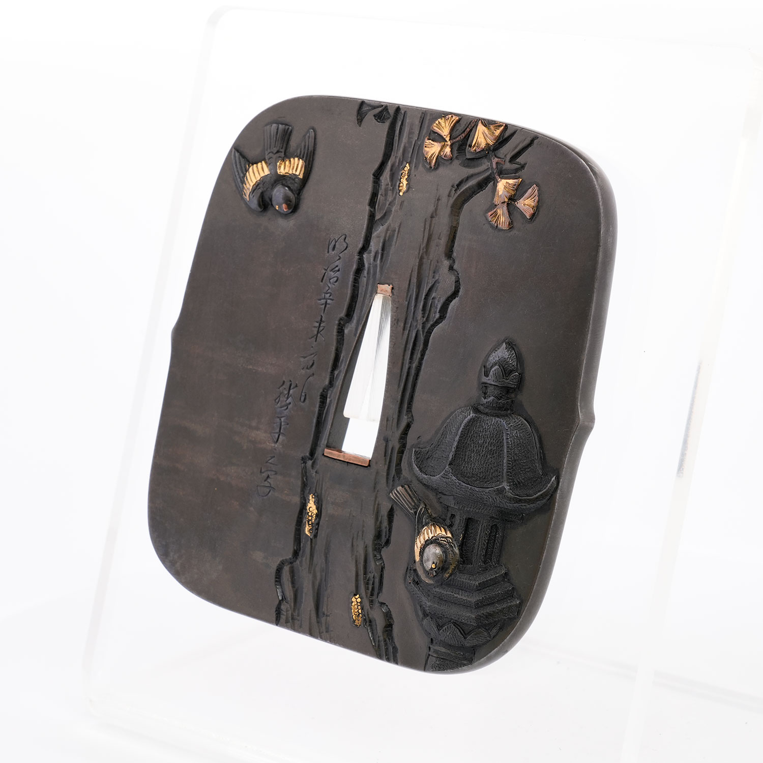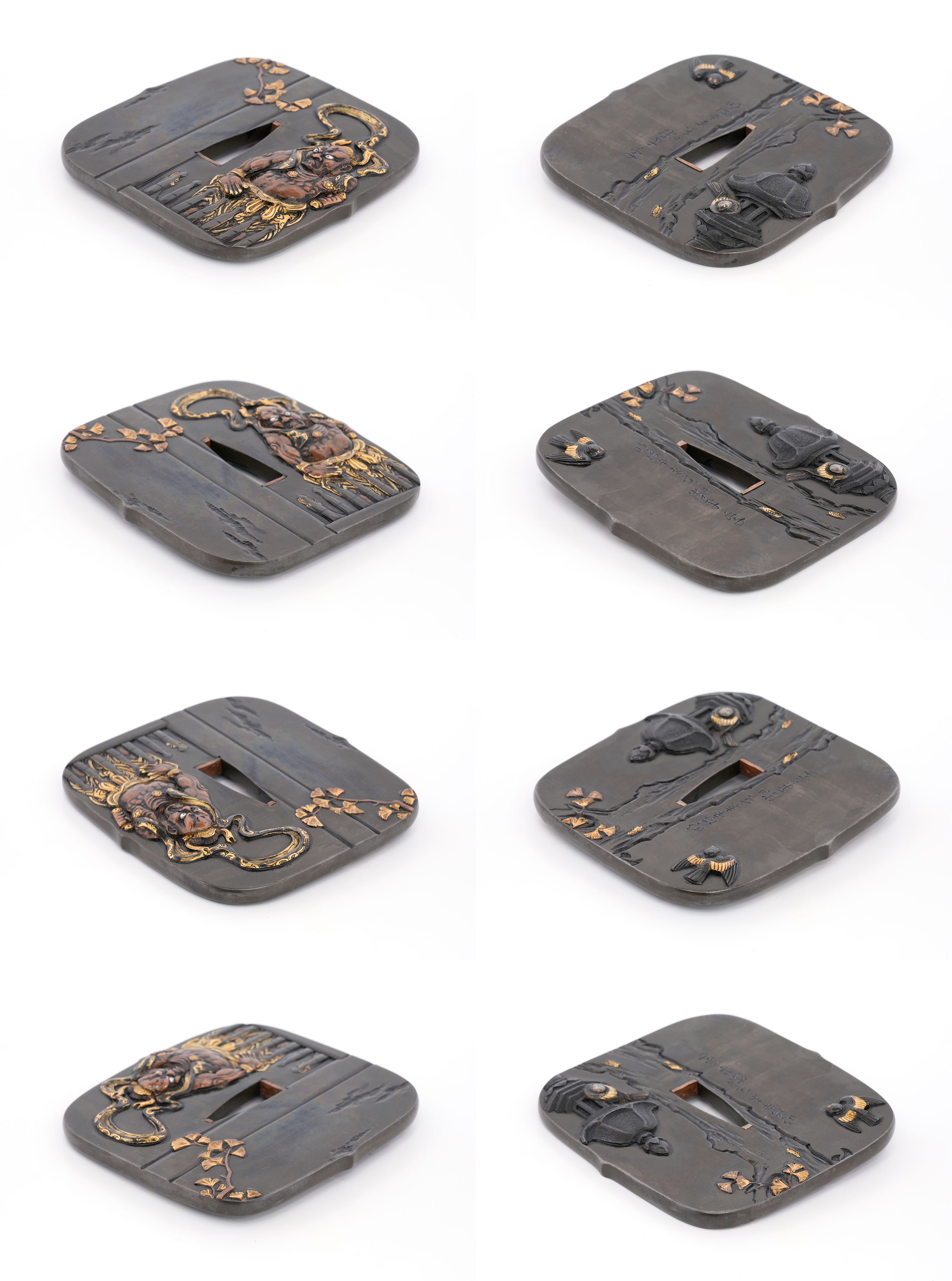 本作は、黒味を帯びた四分一を惜しみなく用いた豪壮なる一枚であり、手にした瞬間、そのずっしりとした重量感に驚かされます。