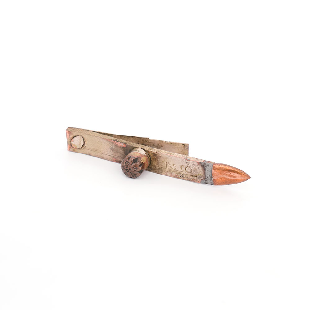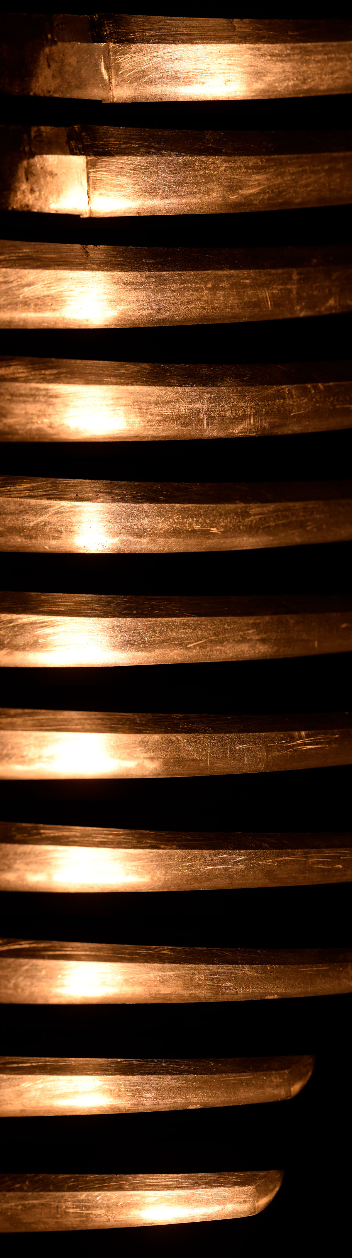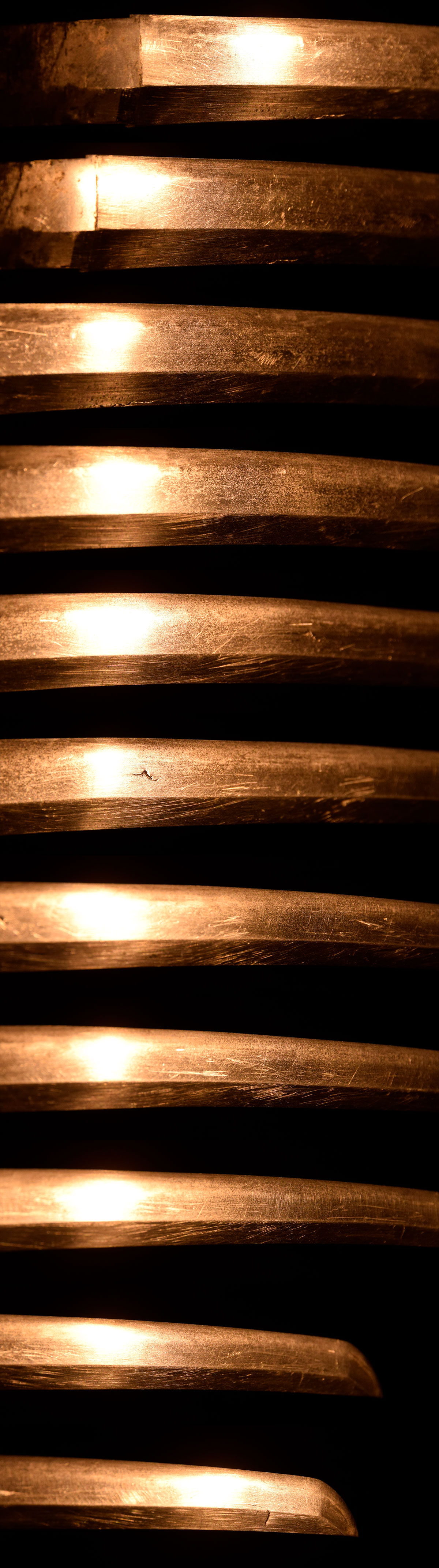 刀身は元先の幅差が開き、中切先の姿。反りはやや深めで、地刃は研磨状態のため判然としませんが、刃文は直刃調に小互ノ目を交えている様子が一部から看取できます。鋩子は直ぐに先丸く返っており、落ち着いた体配は、江戸前期の肥後の刀らしい風格を備えています。
