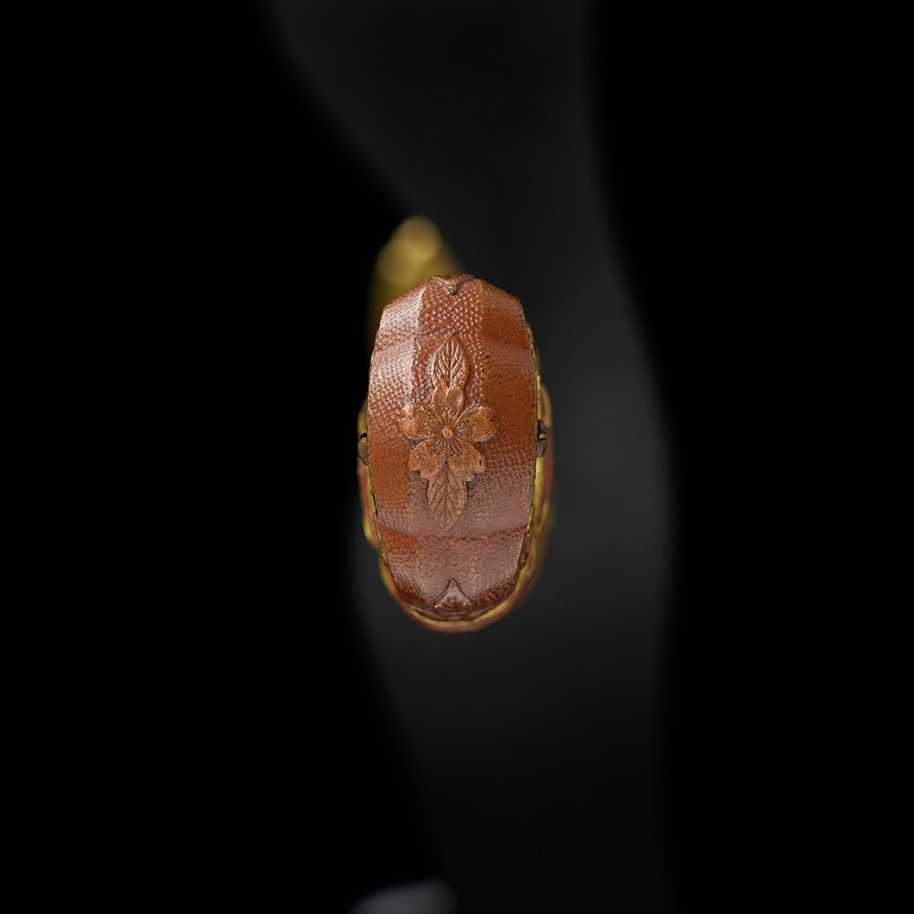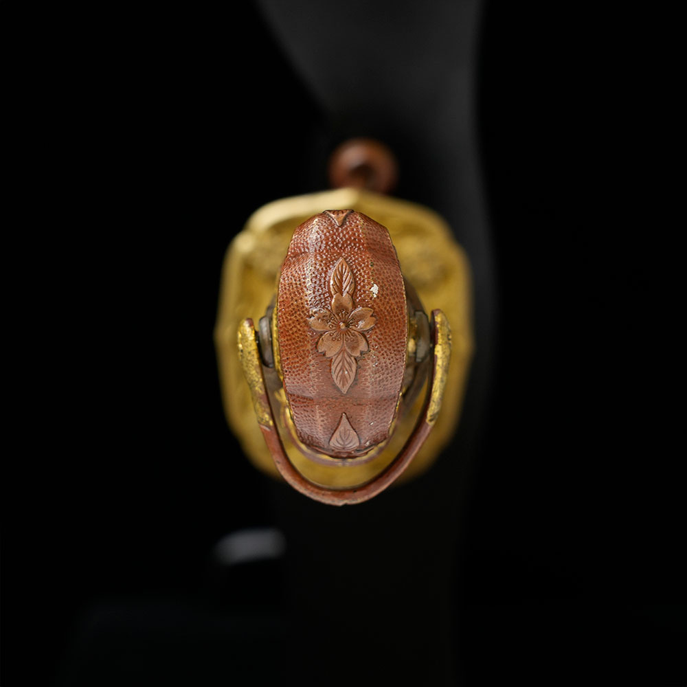 附属の 陸軍九八式軍刀拵 は、鉄鞘やアルミ鞘ではなく、木鞘に本漆で石目塗りを施した高級仕様。鐺の桜花葉も健全で、材質と塗りから察するに、戦地ではなく 内地勤務の上級将校 所有の品であったことが伺え、鐔の黄金色も美しく残り、柄もがたつきなくしっかりとしていて、全体的に保存状態が非常に良好です。なお、僅かに鐔鳴りがございます。