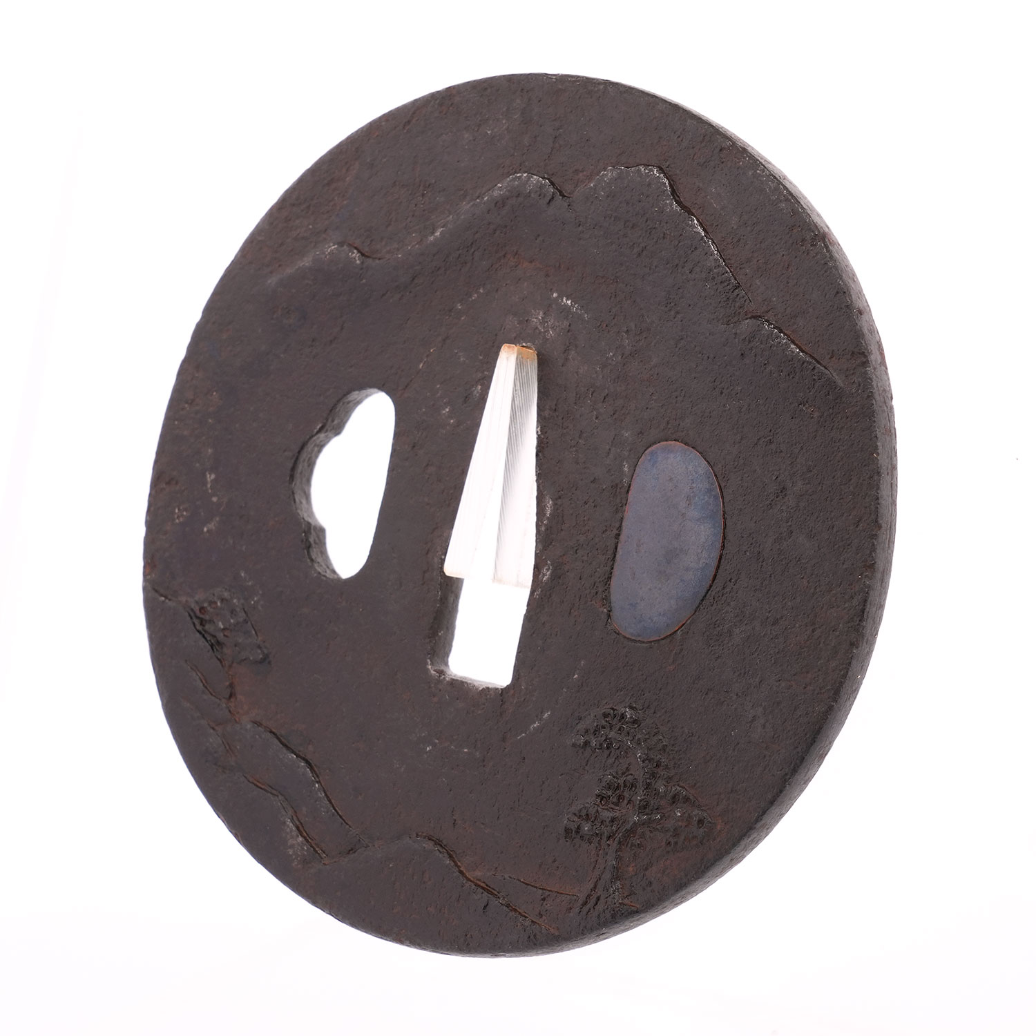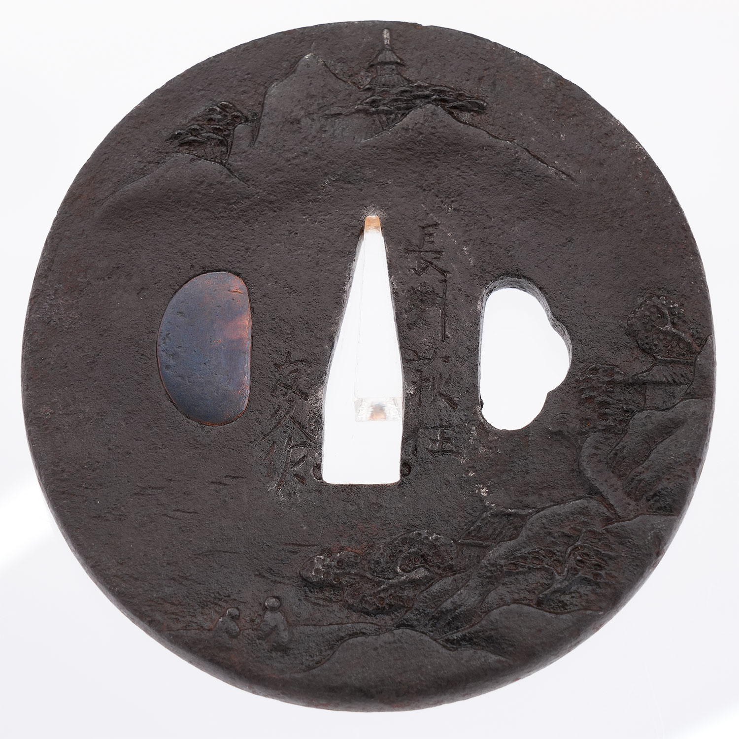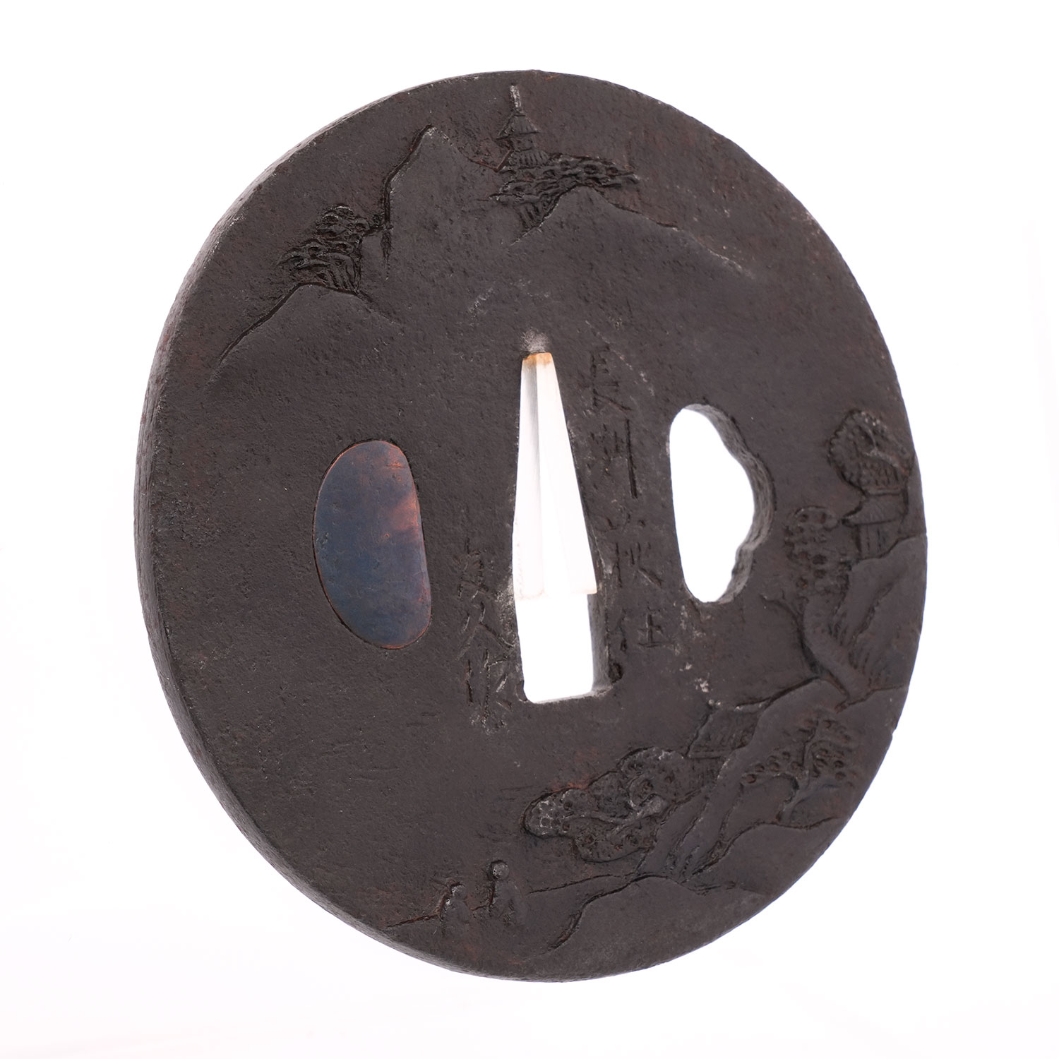 この鐔は、よく鍛えられた鉄地に、中国画を思わせる山水風景を見事に彫り表しており、雄大な自然と静謐な趣を、一枚の鐔に凝縮したその表現は、まさに幽玄の境地。眺めるほどに新たな情景が浮かび上がり、まるで絵画の世界に誘われるかのようです。