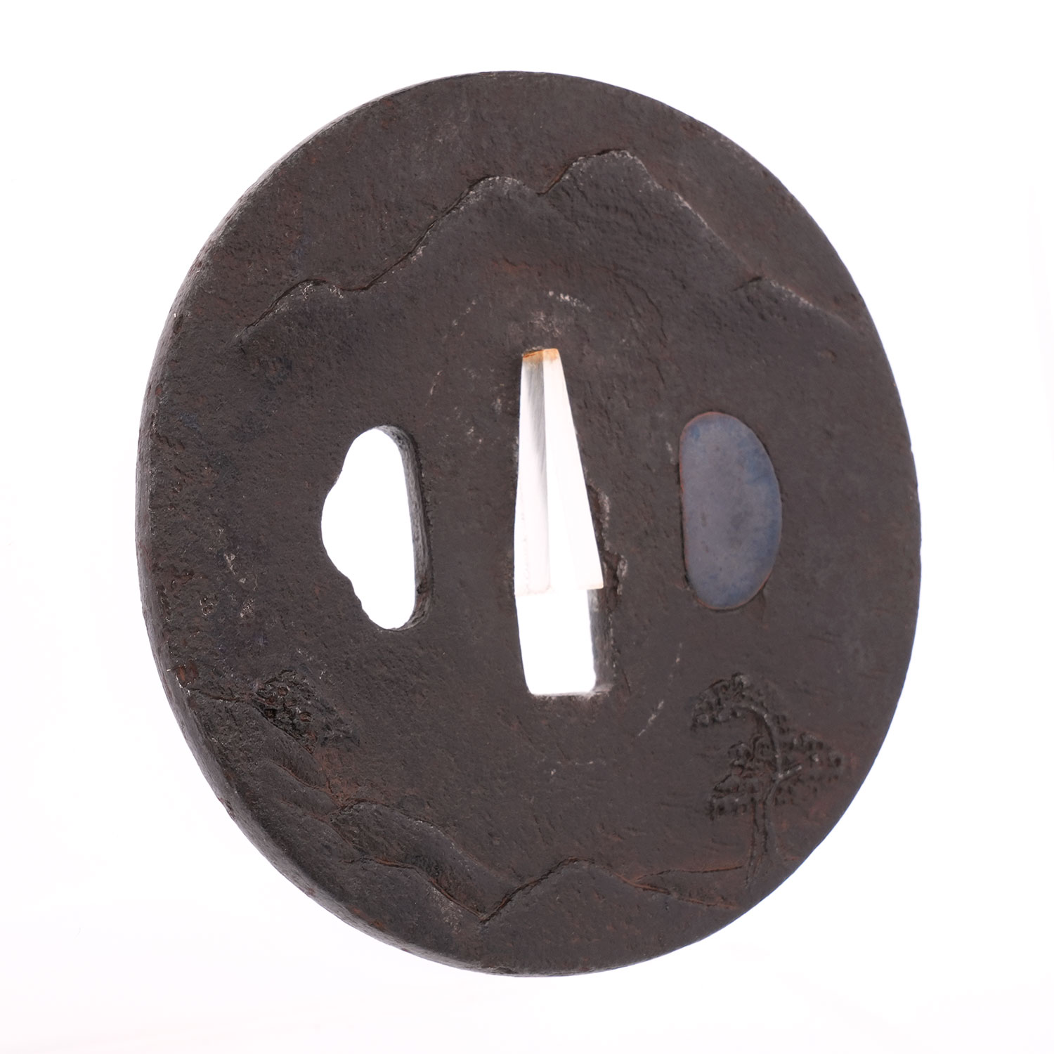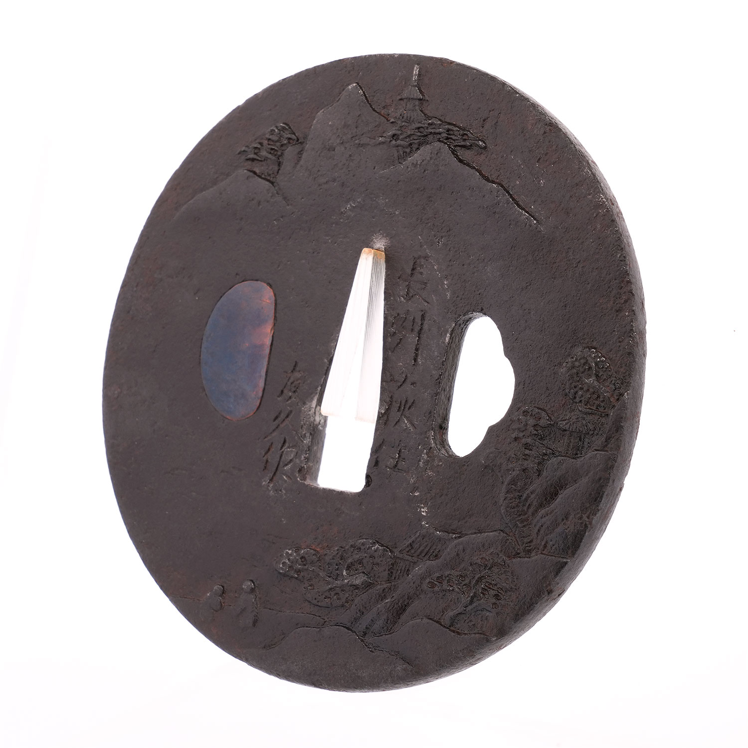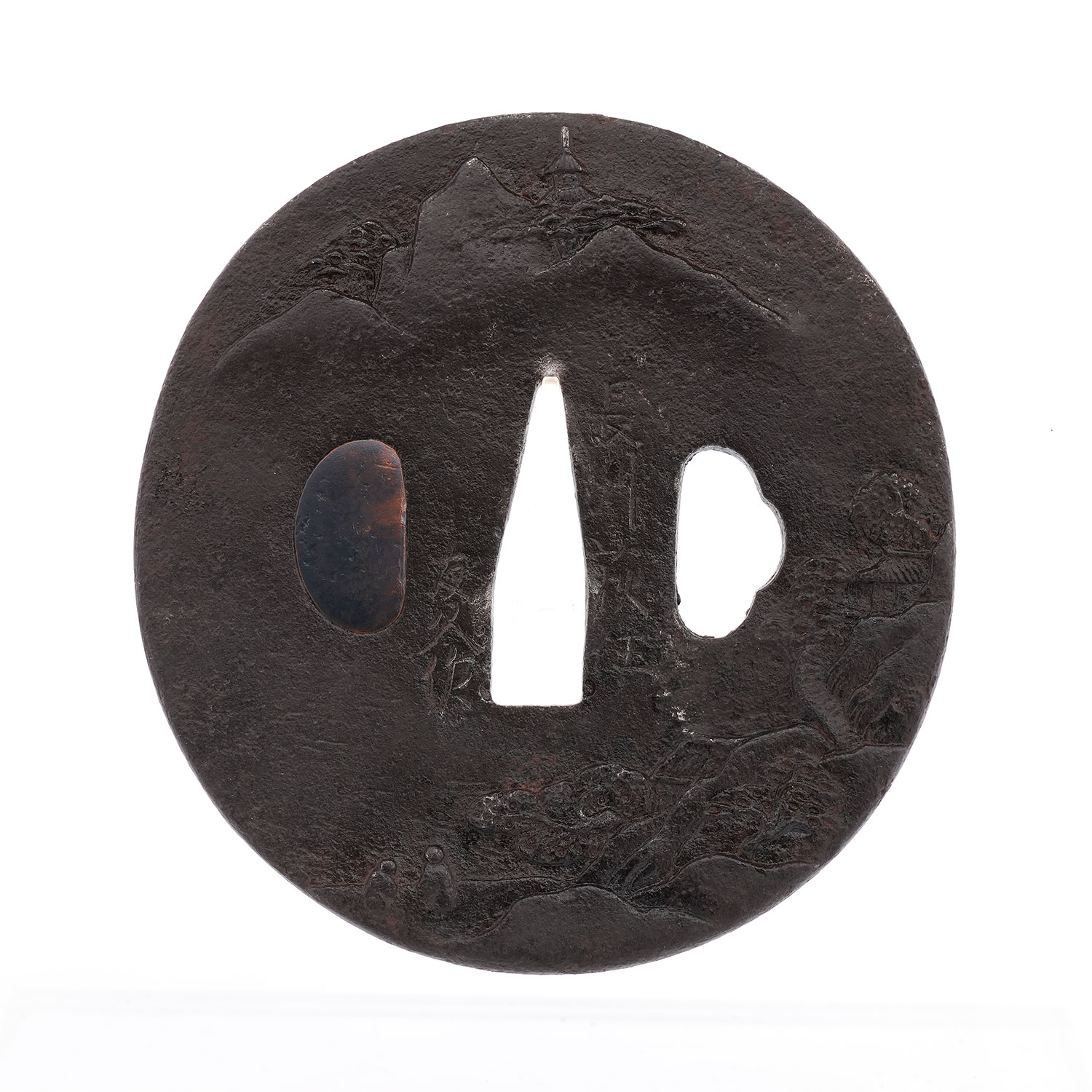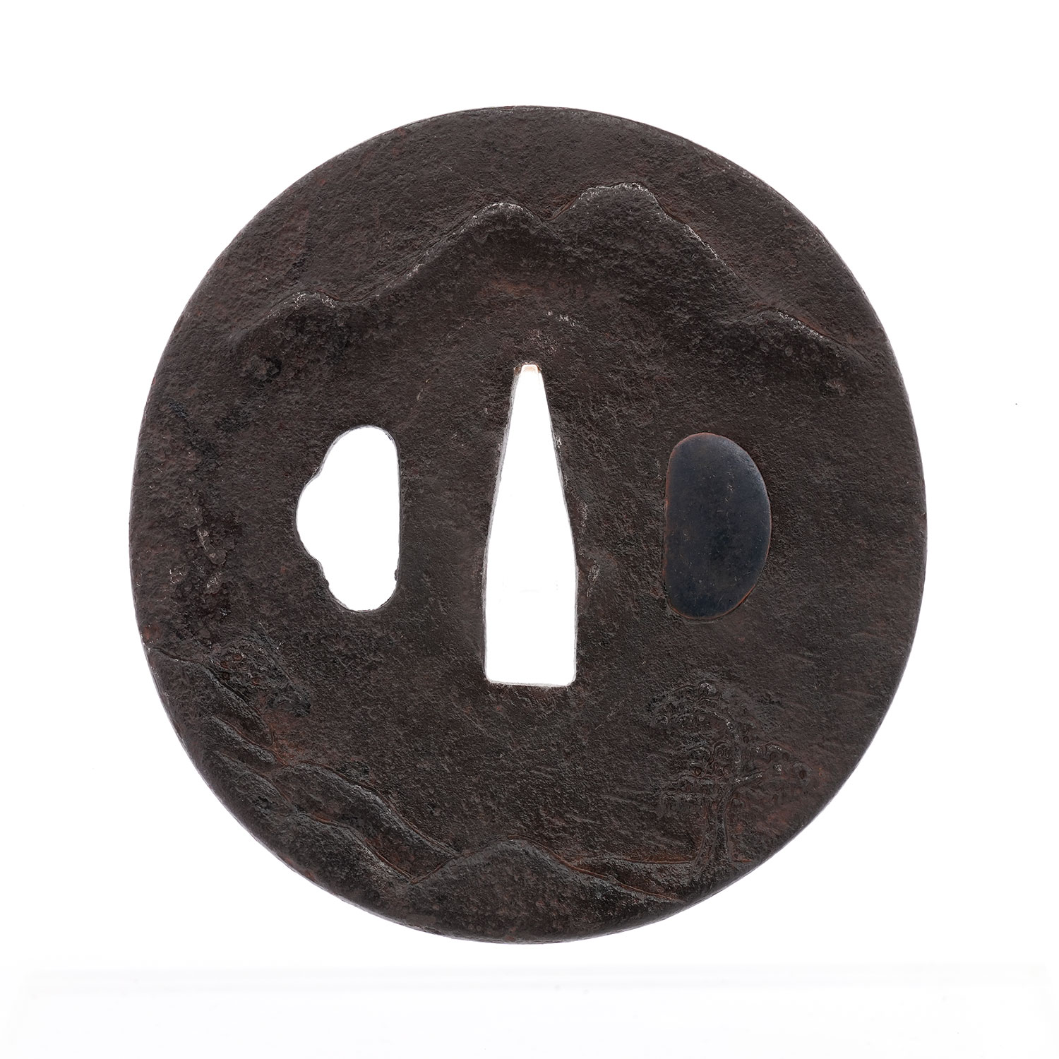 この鐔は、よく鍛えられた鉄地に、中国画を思わせる山水風景を見事に彫り表しており、雄大な自然と静謐な趣を、一枚の鐔に凝縮したその表現は、まさに幽玄の境地。眺めるほどに新たな情景が浮かび上がり、まるで絵画の世界に誘われるかのようです。