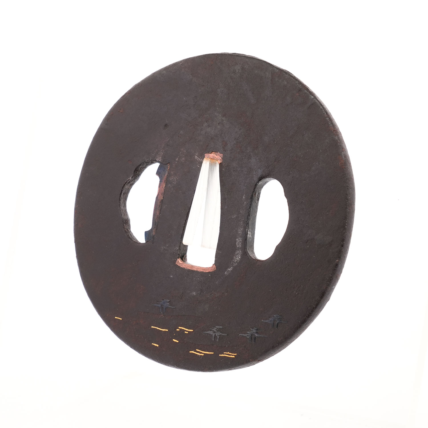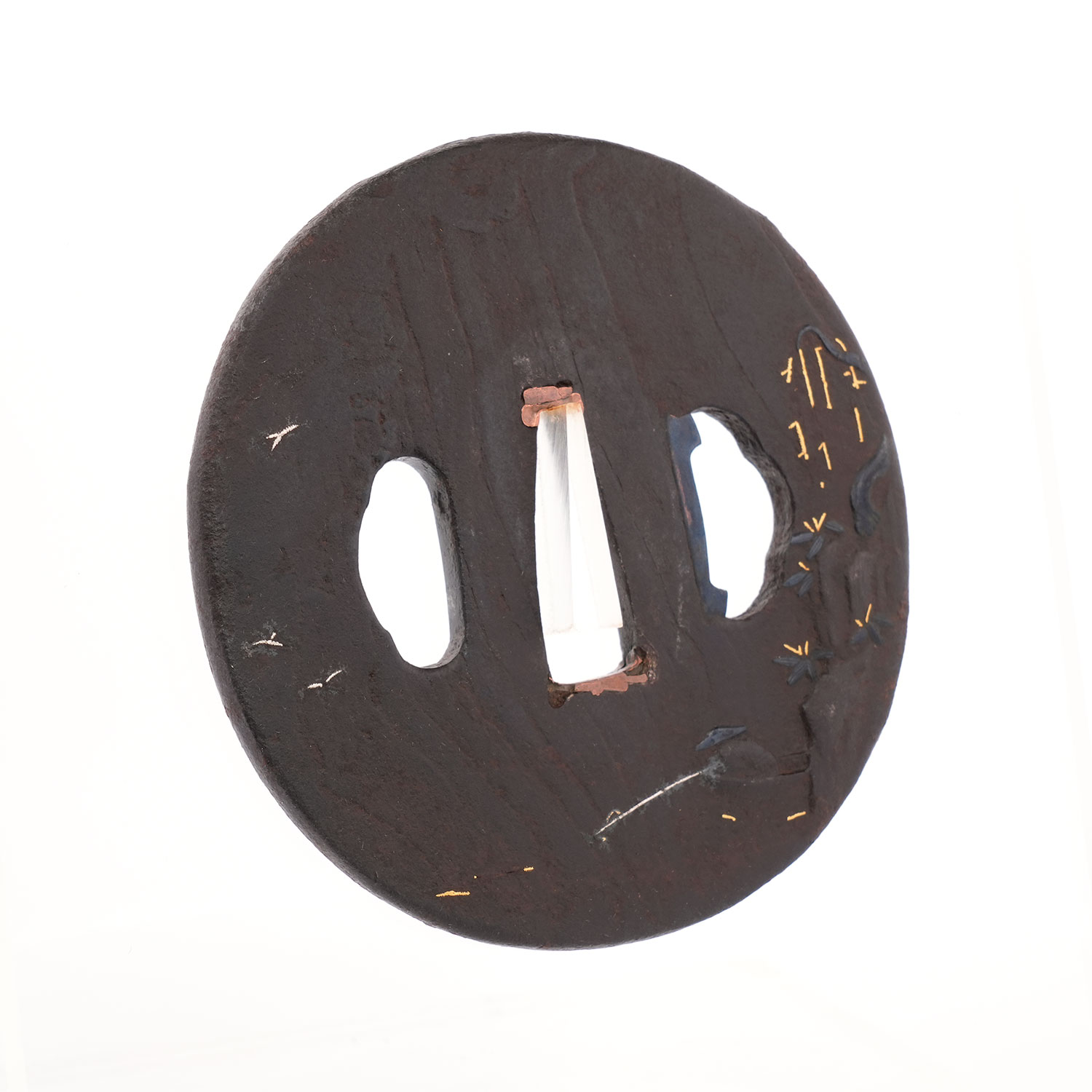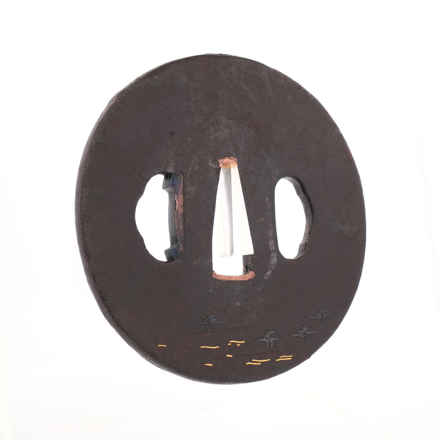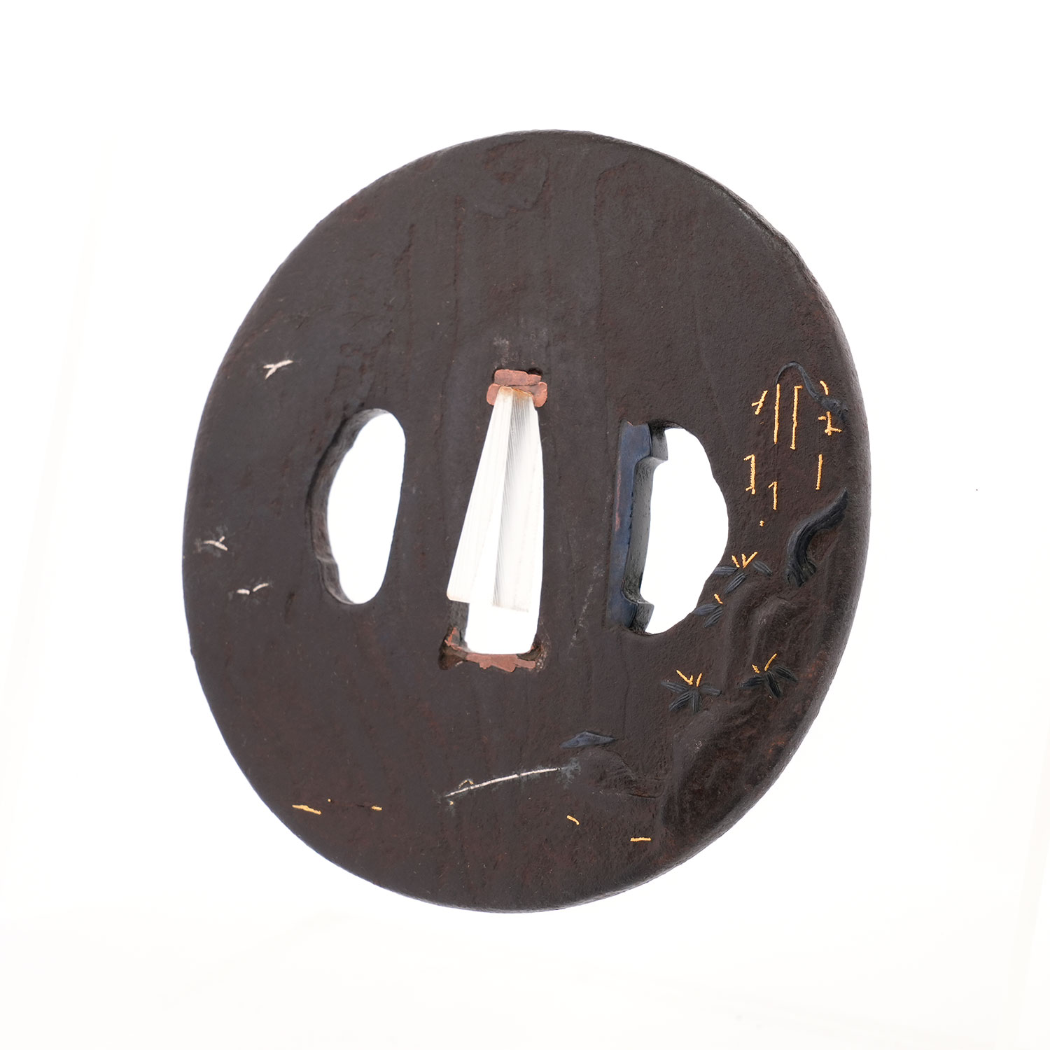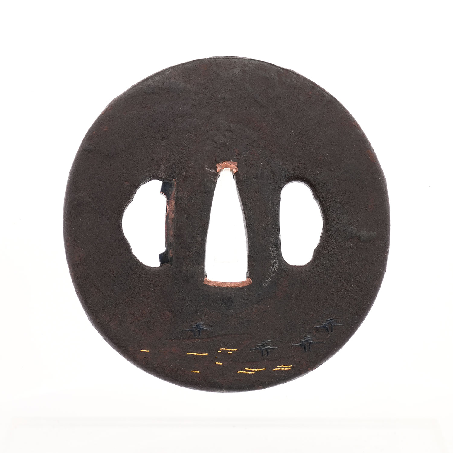 鉄地に、険しい岩場へ力強く根を張る柳の樹と笹を黒味の冴えた赤銅で表し、裏面には松林と浜辺を配した作品。穏やかな波は金象嵌によって巧みに表現され、舟から釣り糸を垂らす人物の姿は、まるで水墨画のように幽玄的です。さらに、その傍らを飛び交う鳥の姿がほのぼのとした情景を添え、観る者をまるで絵画の世界へ誘うかのよう。技術と詩情が見事に融合した一枚です。