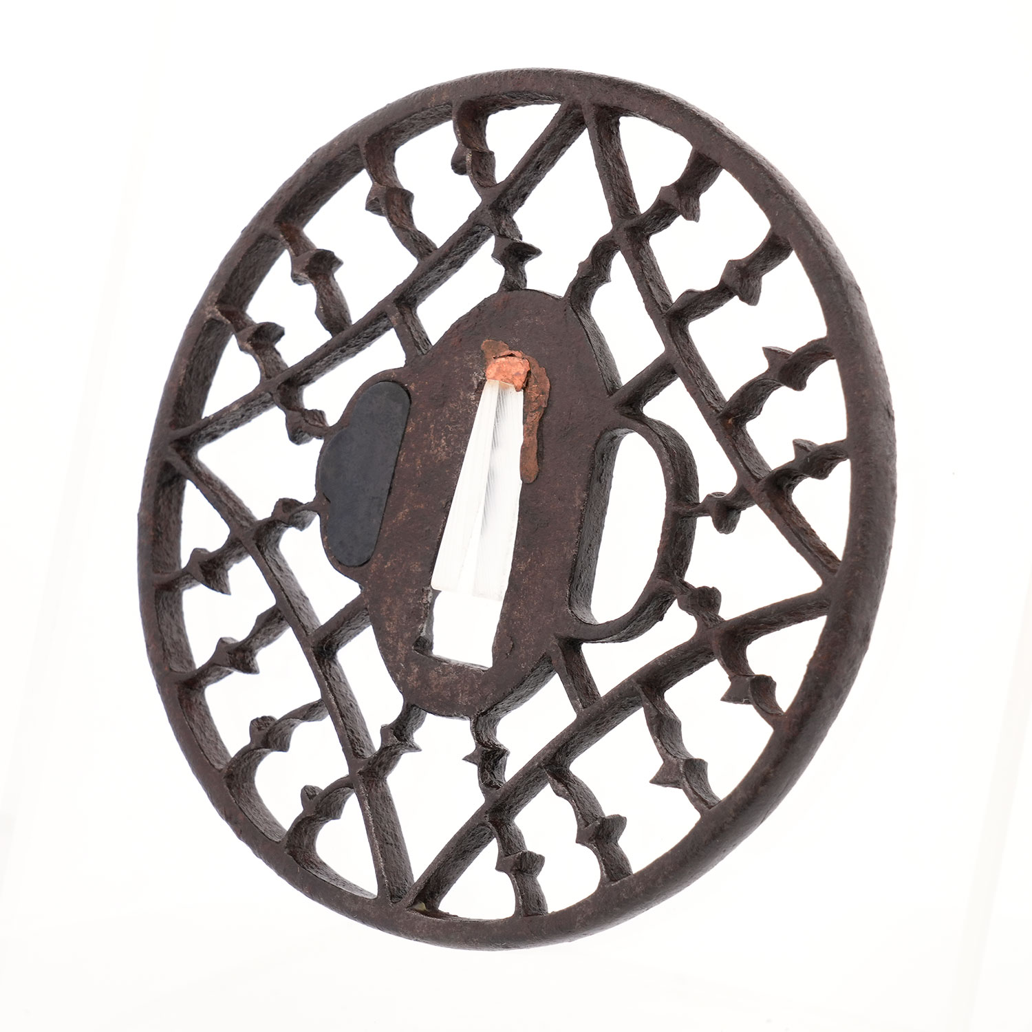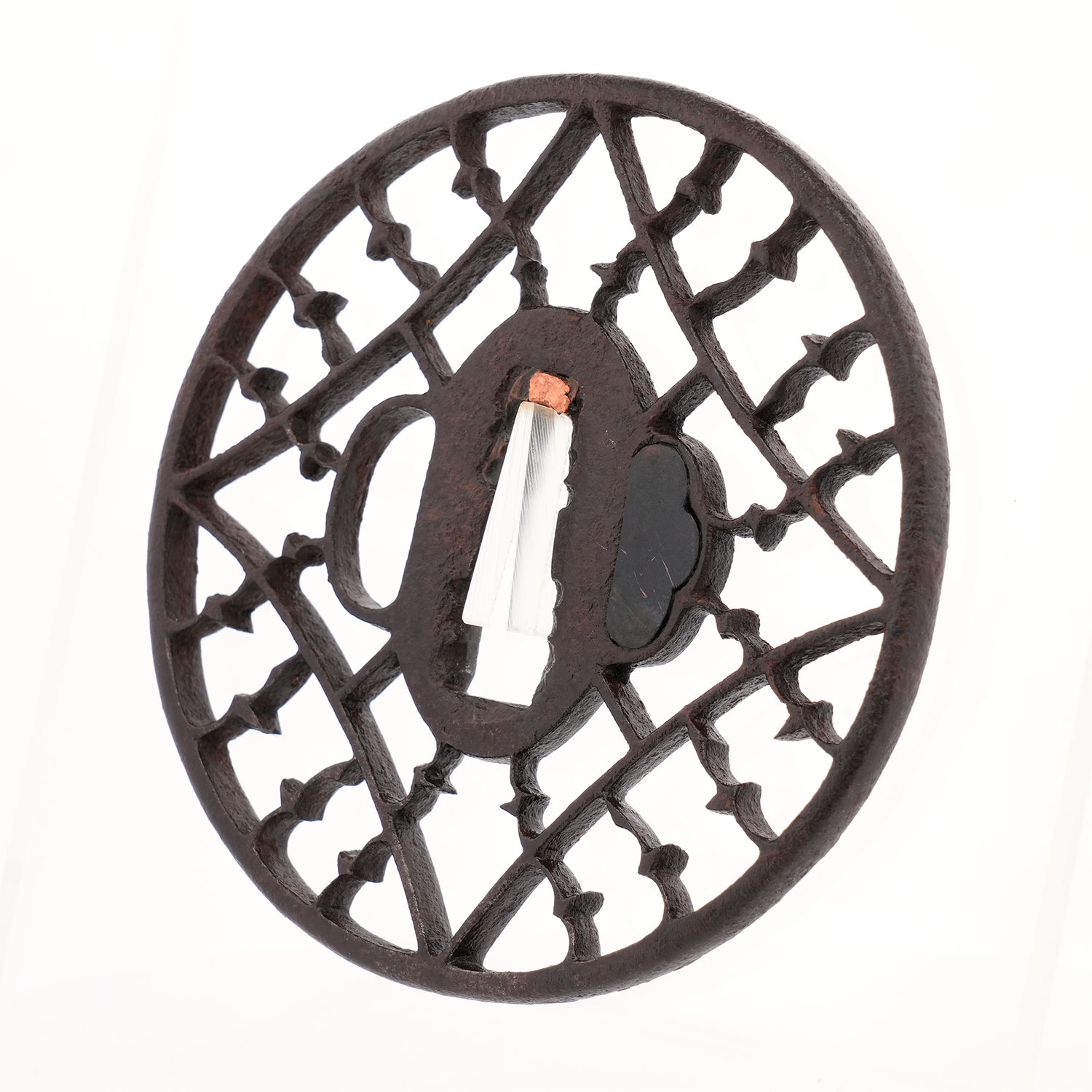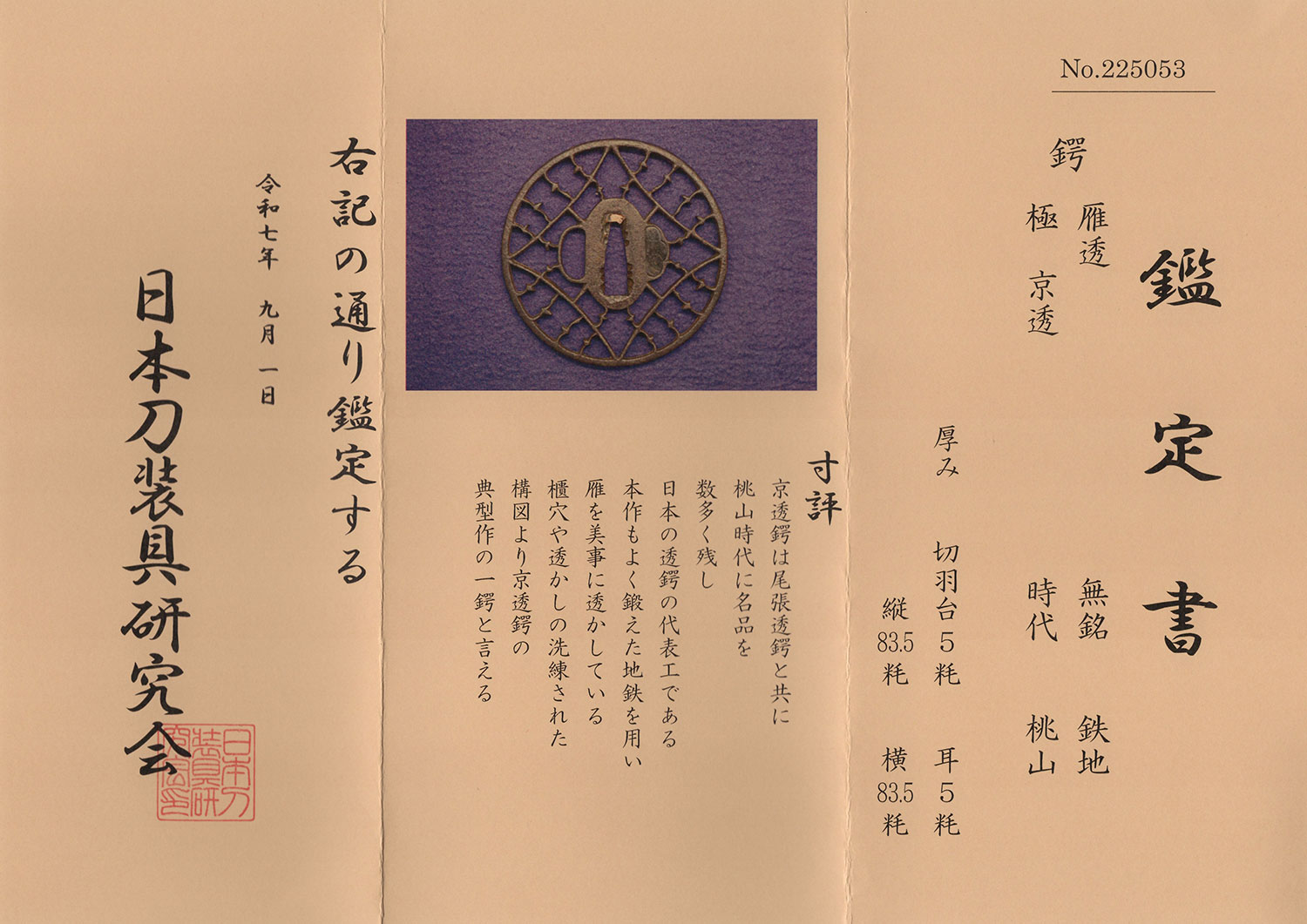 本作も、精緻に鍛え上げられた地鉄を用い、雁を見事に透かし彫りにした逸品。構図や技巧から、京透鐔の典型作として評価される秀作であり、鑑賞・コレクションのどちらにも相応しい価値ある一枚です。