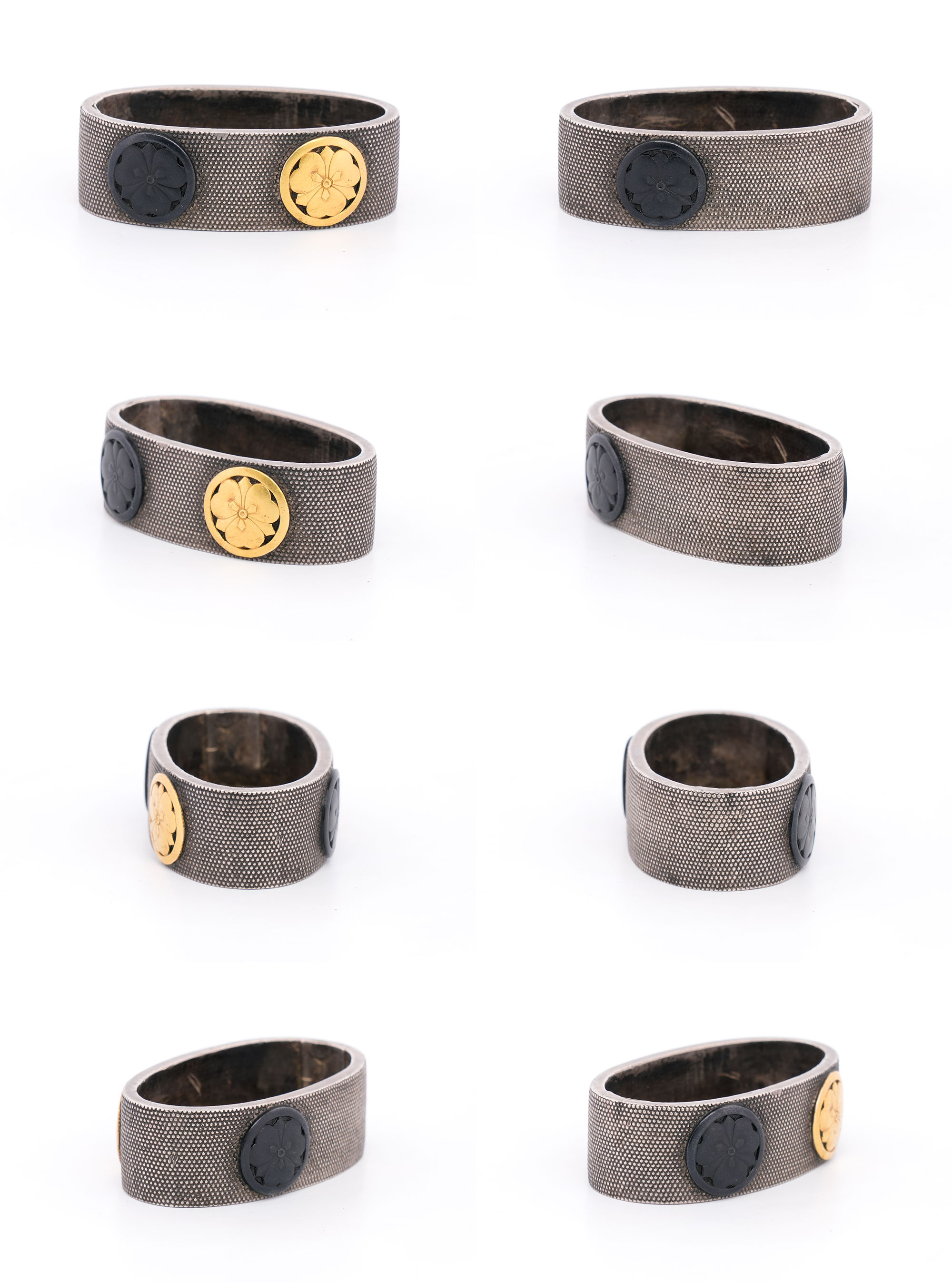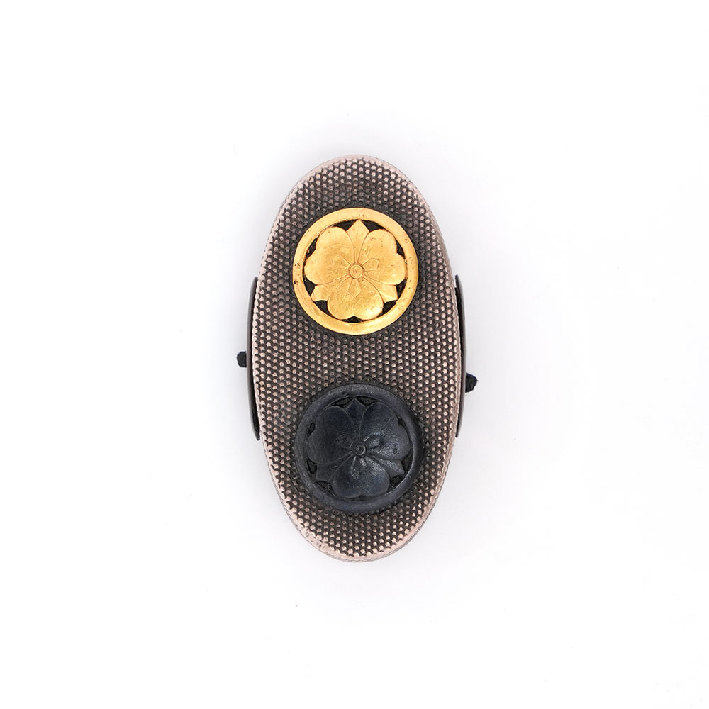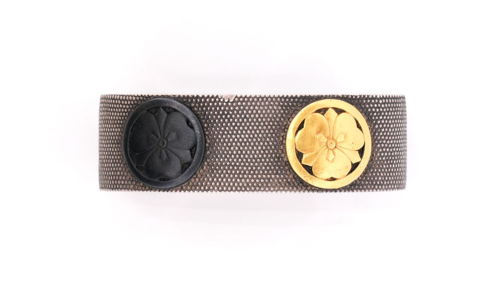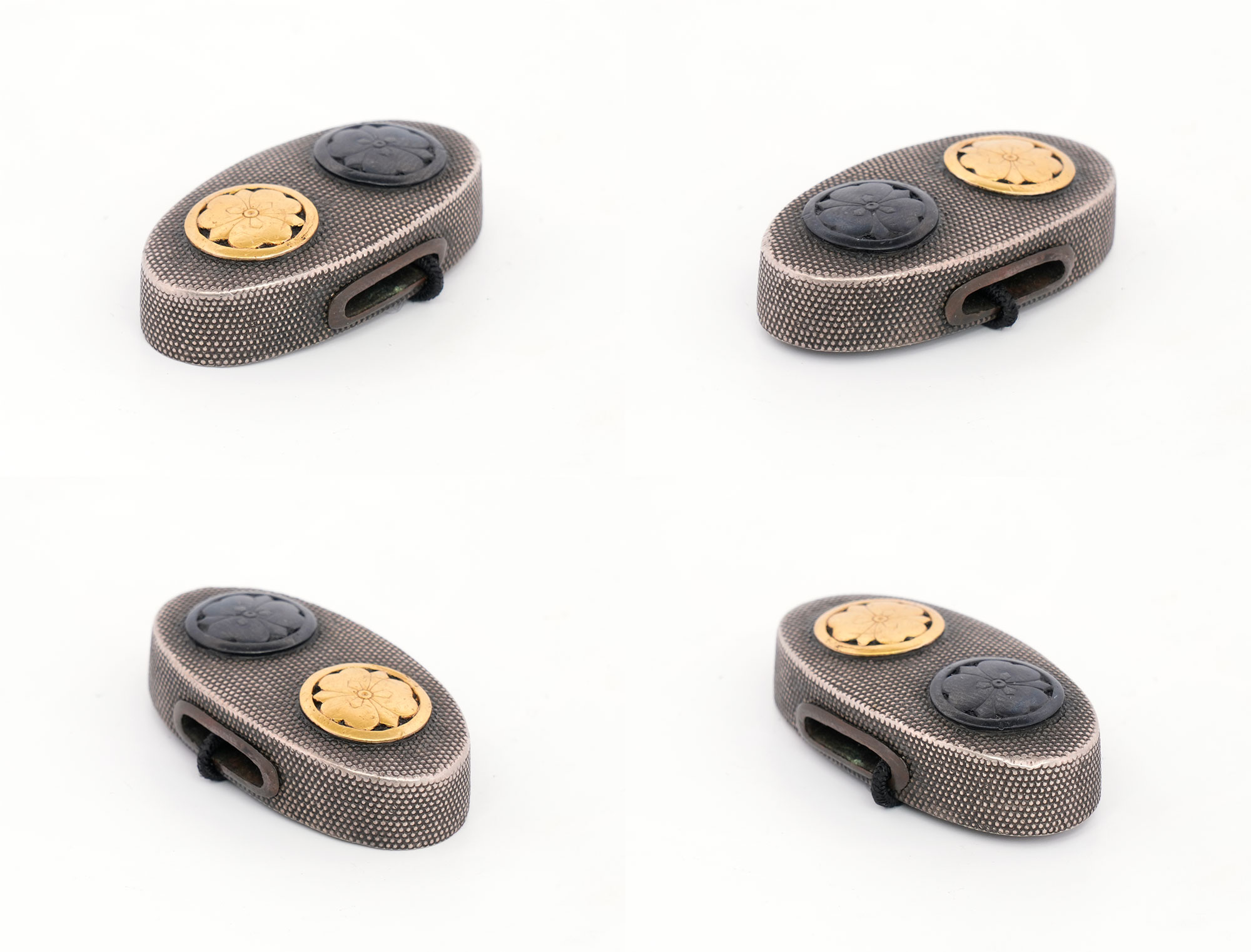 本作は、銀無垢の地鉄に精緻な魚子を細やかに打ち込み、赤銅と金により「丸に剣片喰紋」を堂々と表した気品ある逸品です。僅かなスレや当て傷は経年の証であり、むしろ風格を添えるものとなっています。