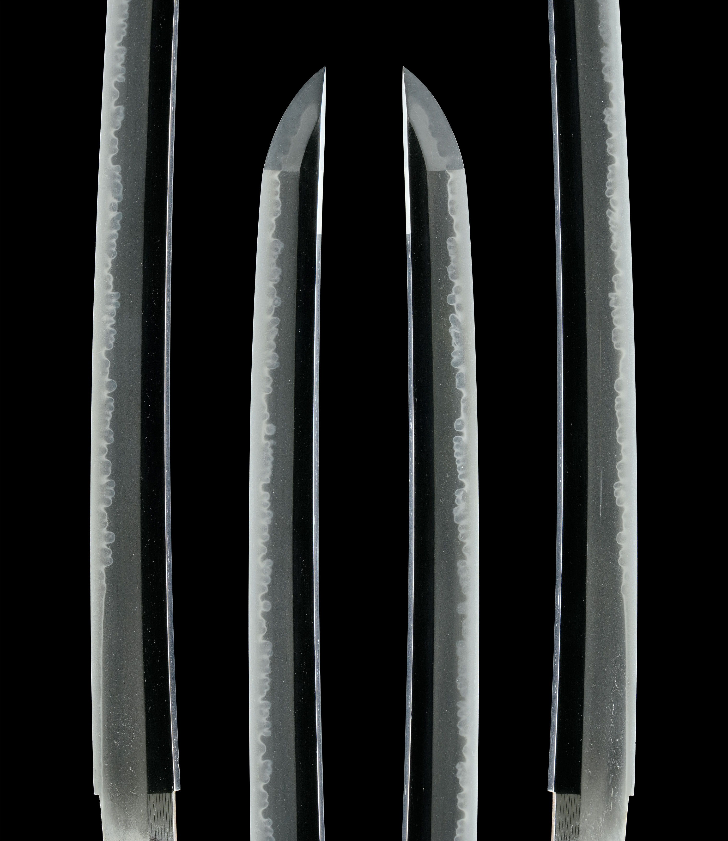 地鉄は板目が流れごころでよく詰み、淡い映りも見られる見事な鍛え。刃文は締まりごころで匂勝ちの長い直焼出しから始まる華麗な丁子乱刃で、表裏共に細かく連続する丁子刃文が揃い、鋩子は乱れ込み小丸へ深く返っています。茎には丁寧な化粧鑢が施され、銘も堂々と刻されており、寿實の作品に対する情熱と誇りが感じられ、高い技量と典型的な作柄を示す、健体で地刃冴えた優品であり、鑑賞・コレクションのいずれにも相応しい逸品です。