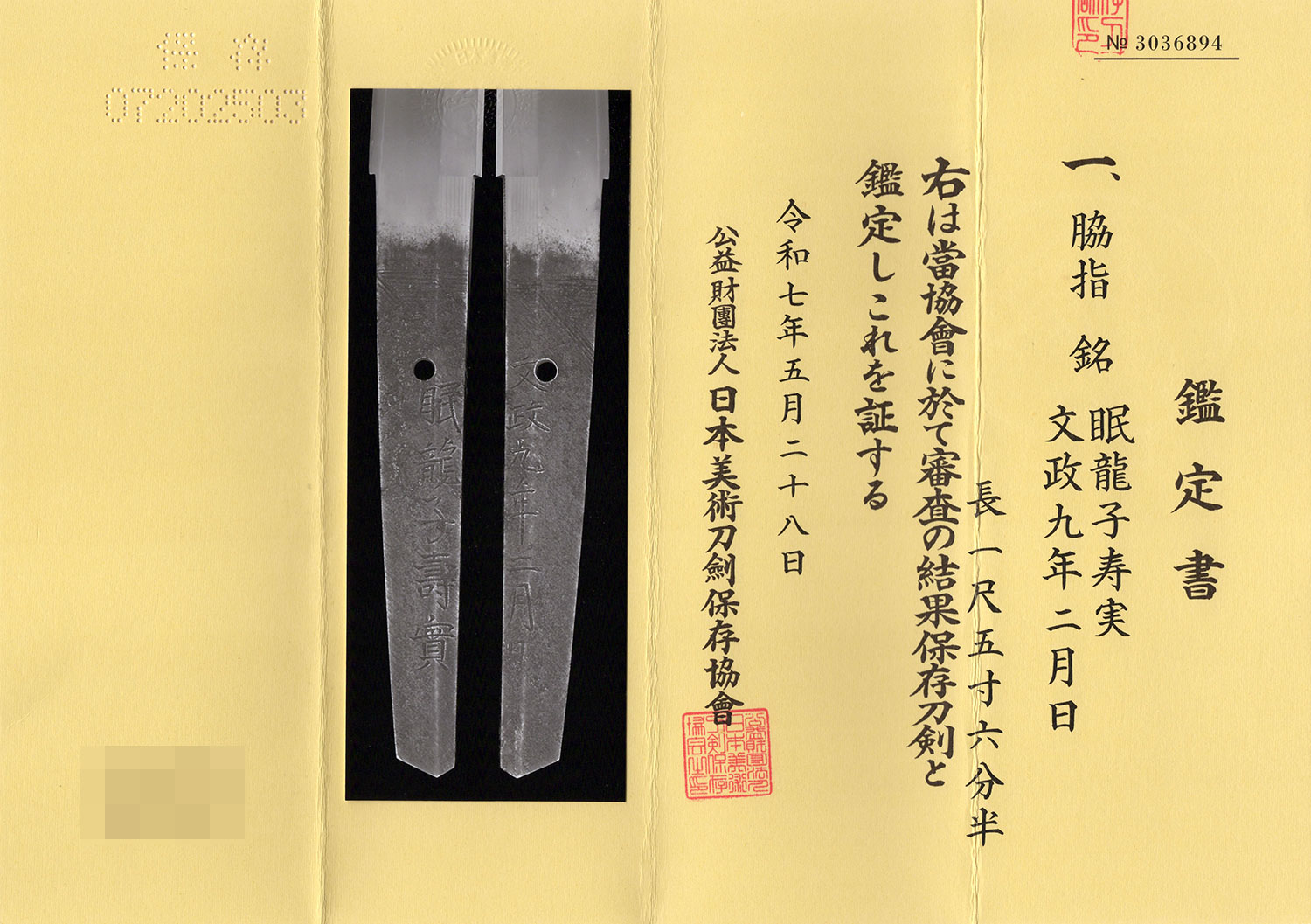 附属 保存刀剣鑑定書、素銅はばき、白鞘