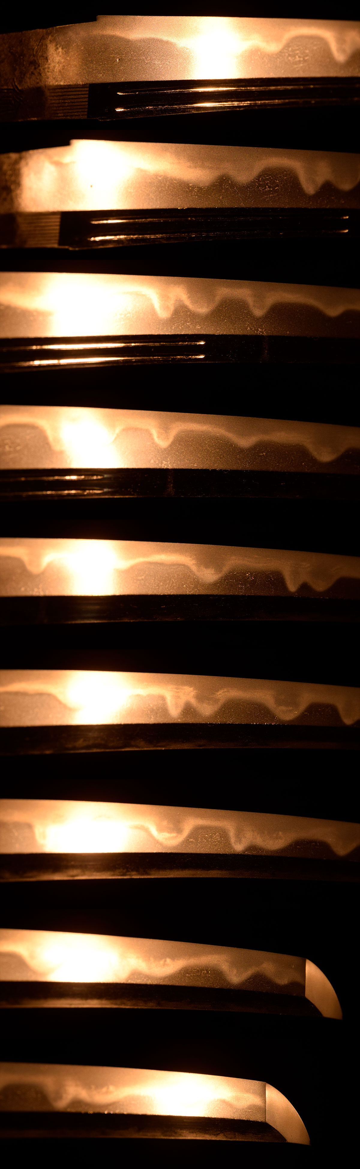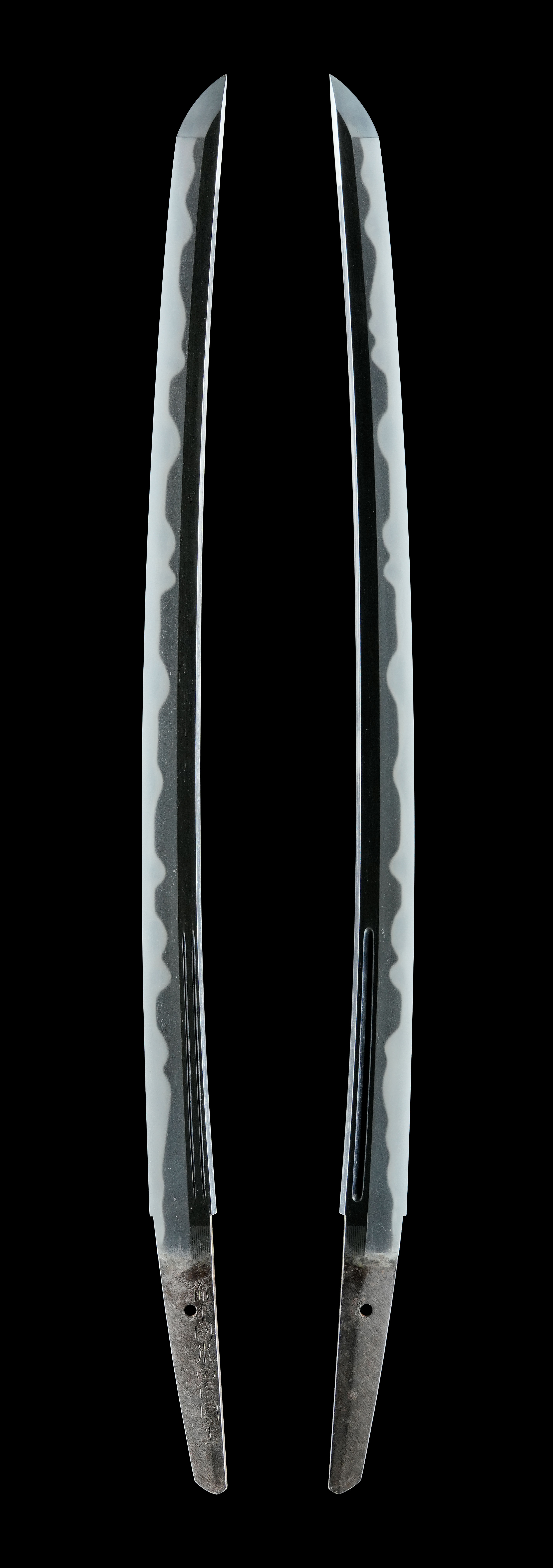 本作の脇指は、身幅広く豪壮で、元先の幅差が頃合いに開き、端正な中切先を備えた堂々たる姿を示しています。腰には二本樋(護摩箸)が掻かれ、力強さとともに精悍な印象を漂わせます。地鉄は小板目がよく練れて詰み、地沸が付いた精美な肌合いを見せ、匂口は明るく冴えて互ノ目を湾れ調子に焼き上げています。