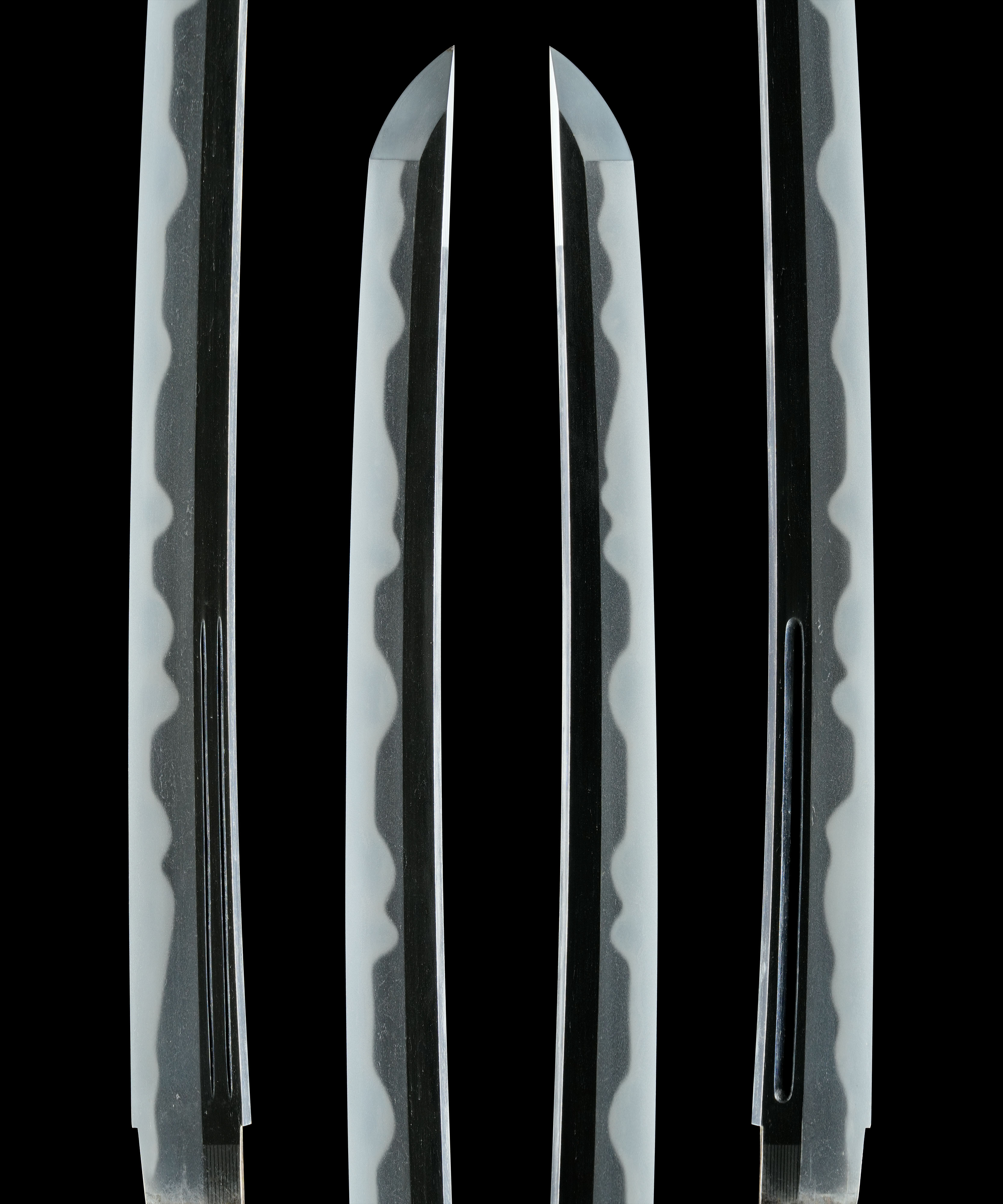 刃縁はよく沸づき、刃中には砂流や細かな足・葉が豊富に働き、いかにも生気に満ちた出来映えです。鋩子は直ぐに先丸く長く焼き下げ、棟焼きを形成し、全体として力感と気迫にあふれる姿を呈しています。