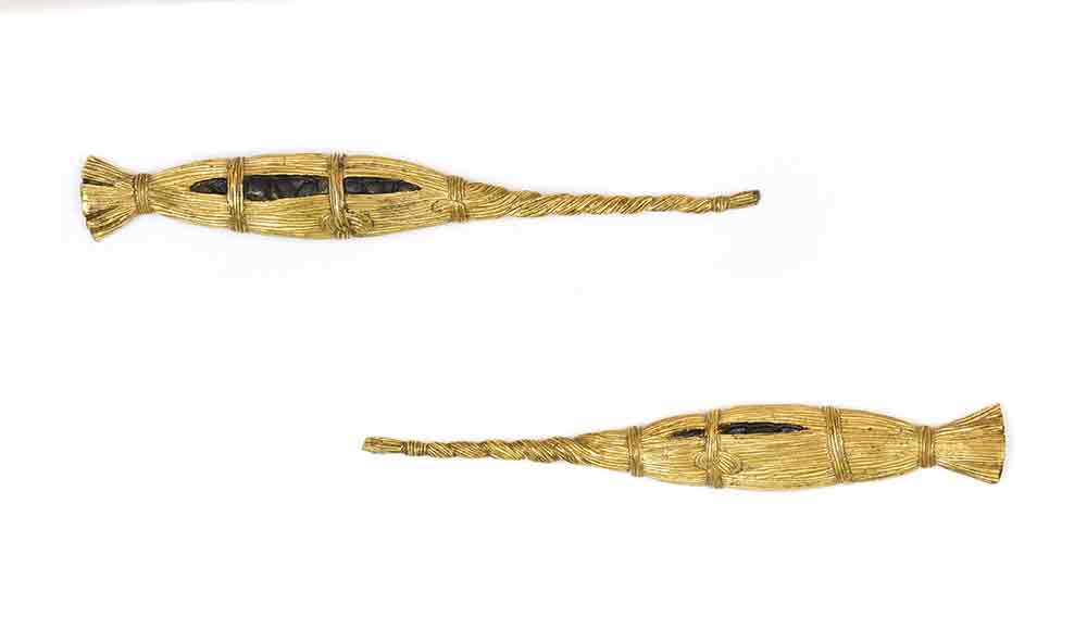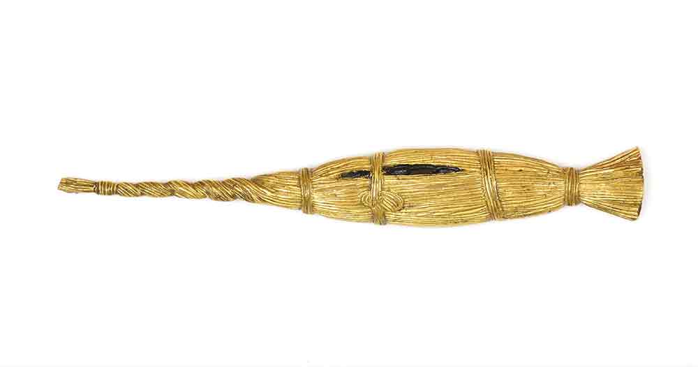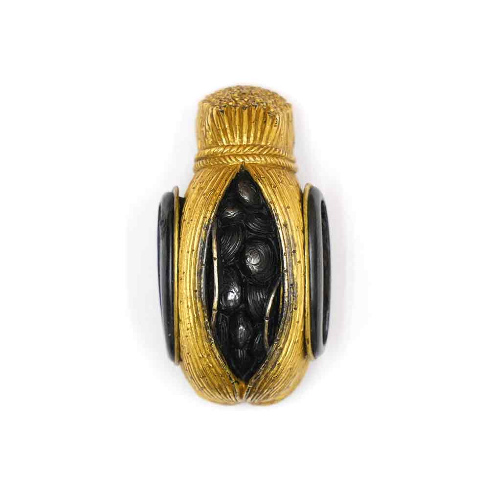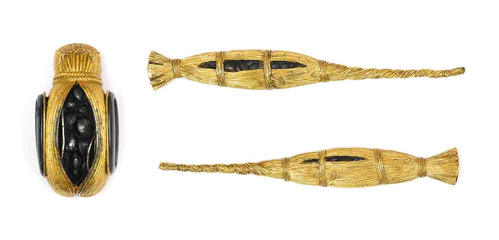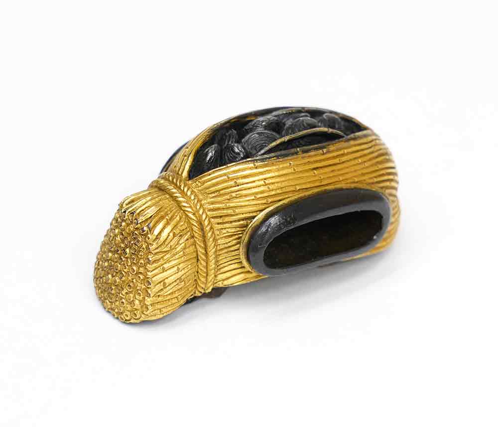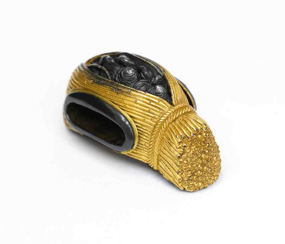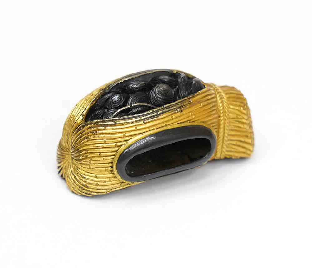 この二所は、江戸時代の風物を忠実に再現した、京金工の名品です。藁苞(わらづと)で包まれた蜆の姿を容彫で巧みに表現しており、藁苞は金、蜆は深い黒色の赤銅で仕上げられています。