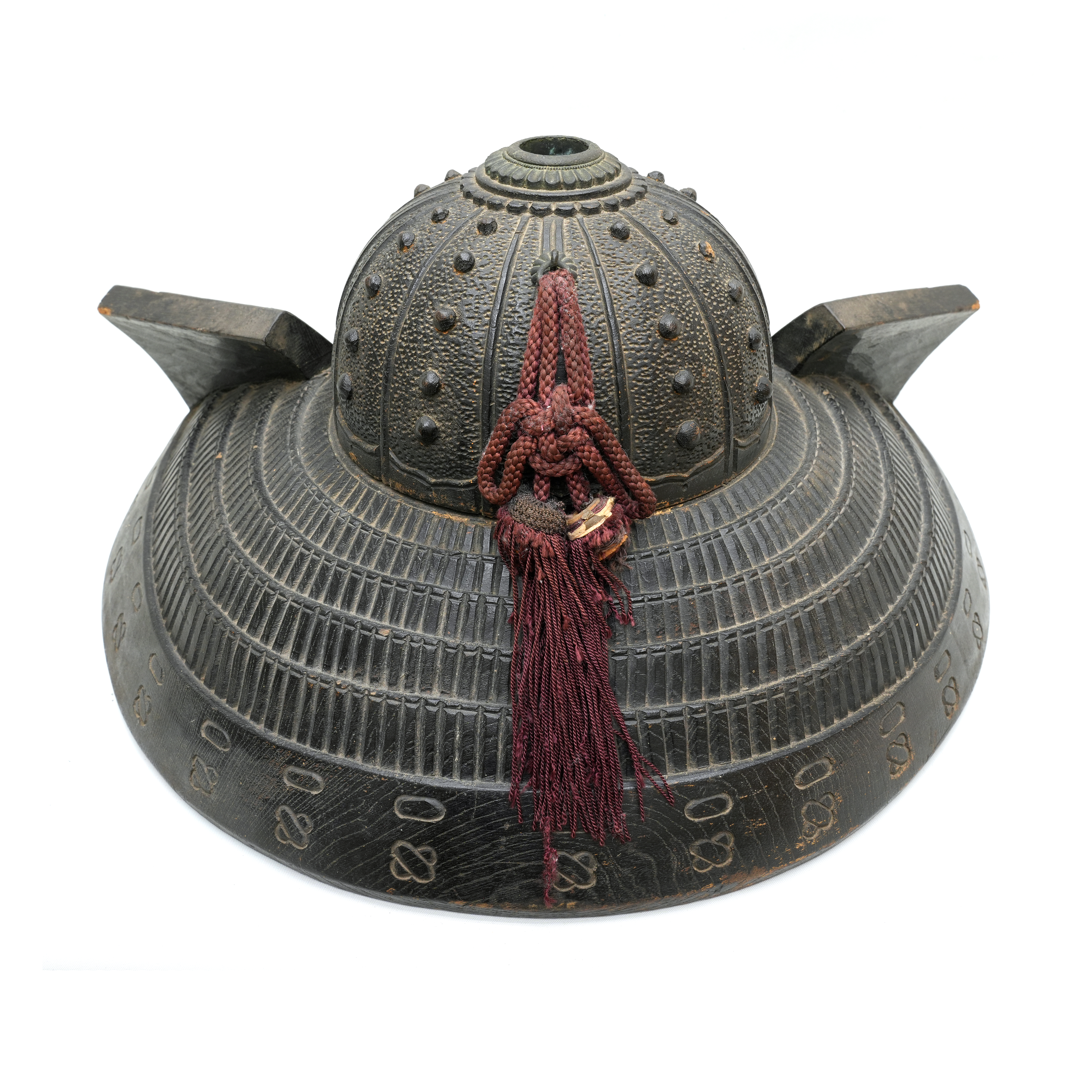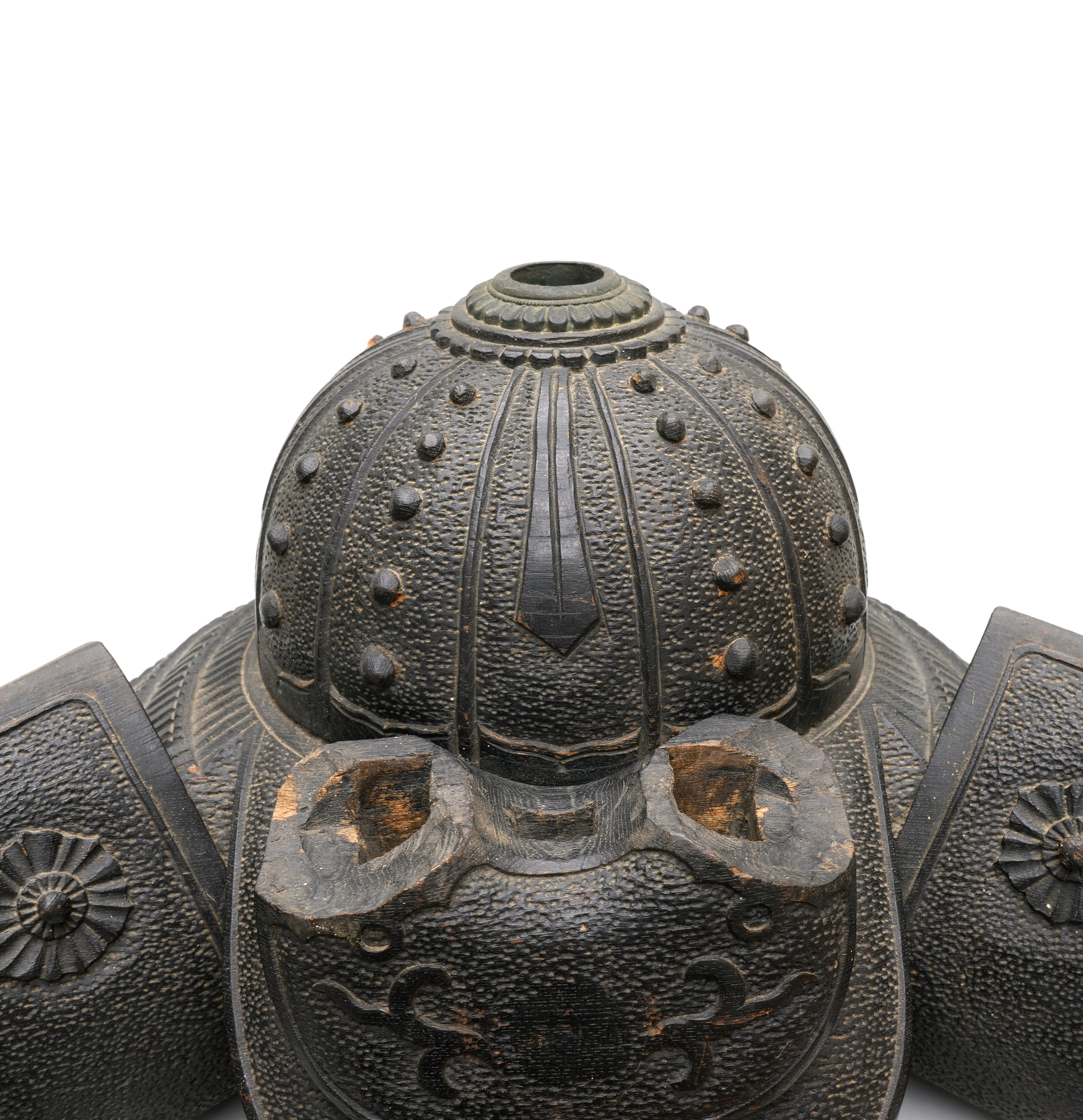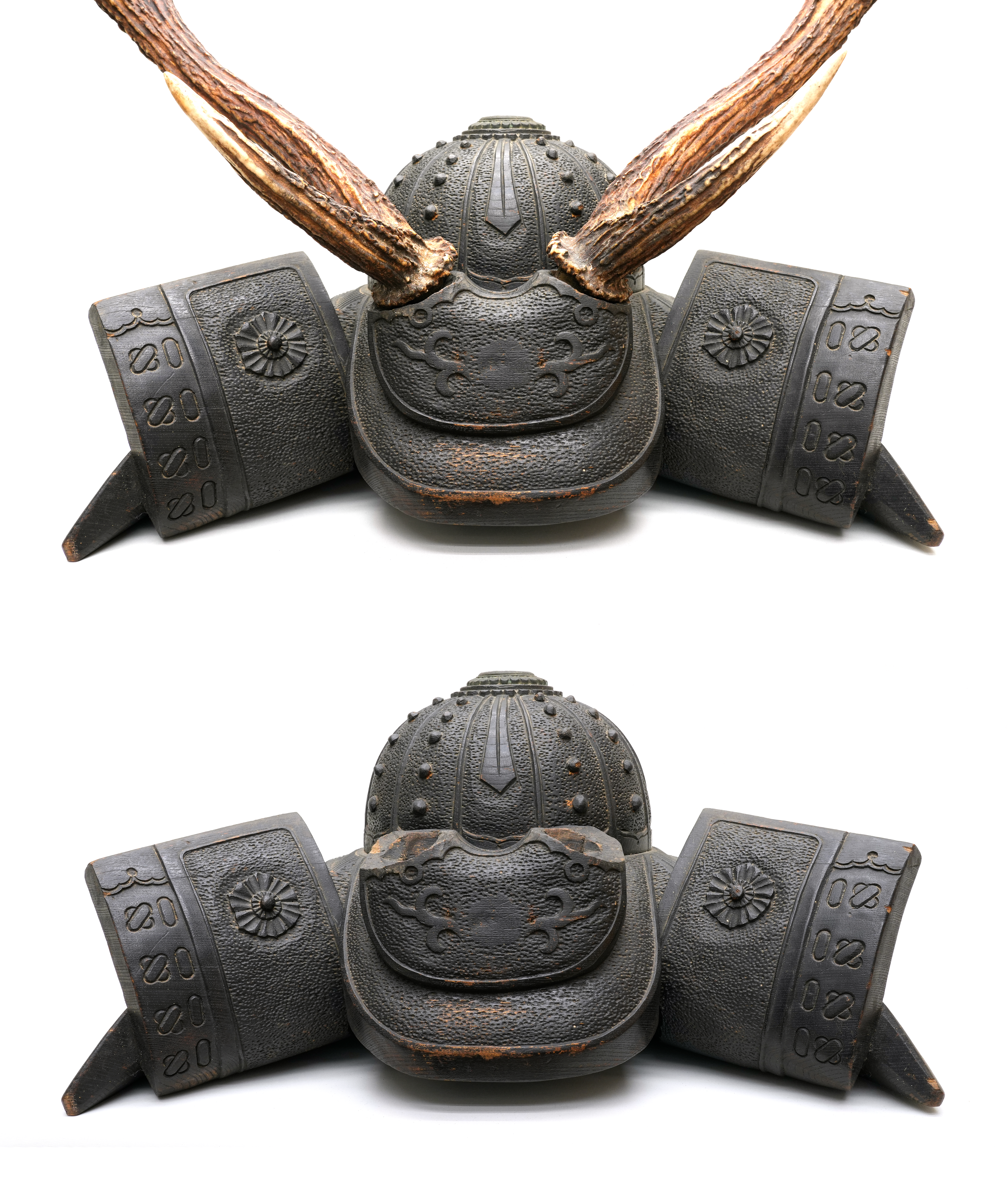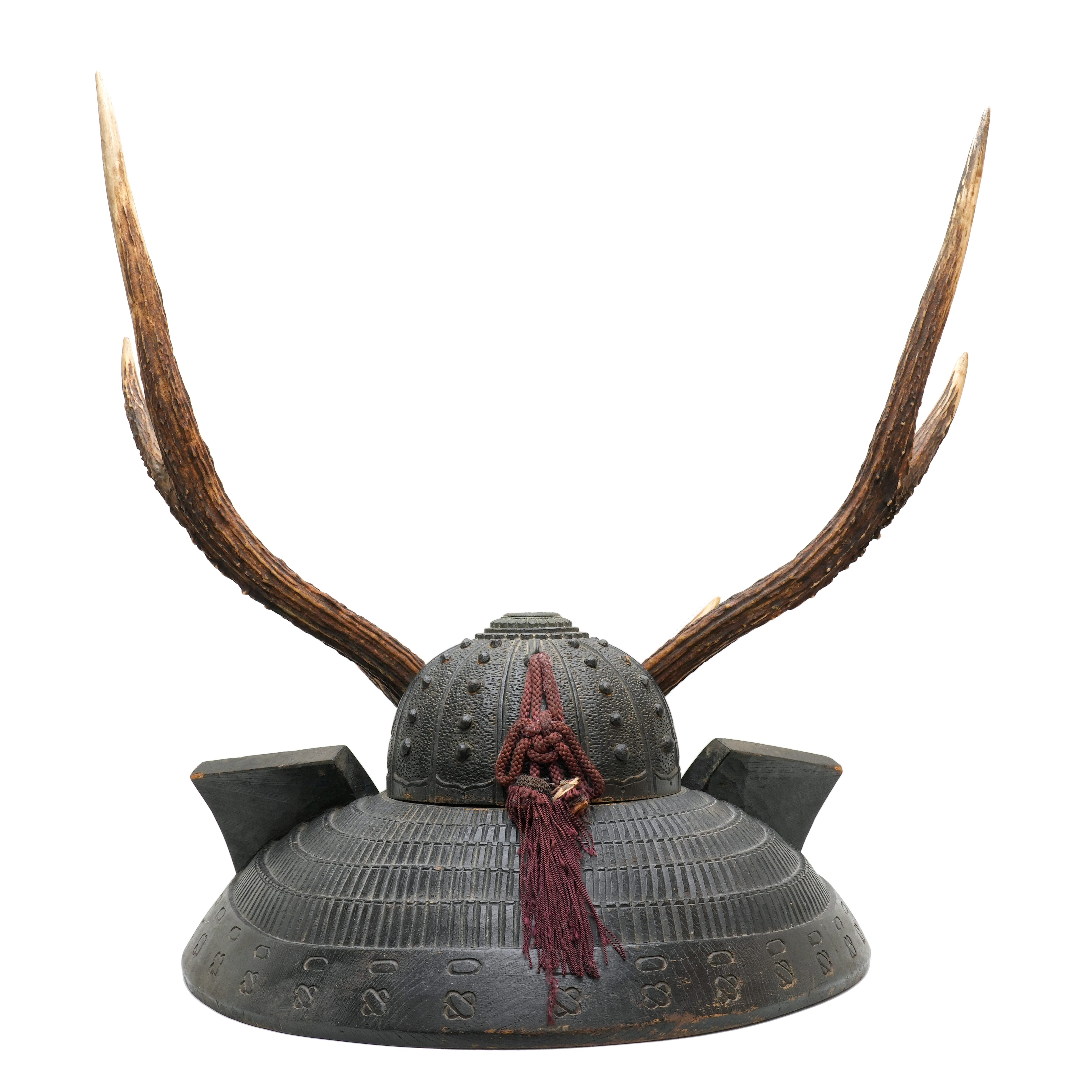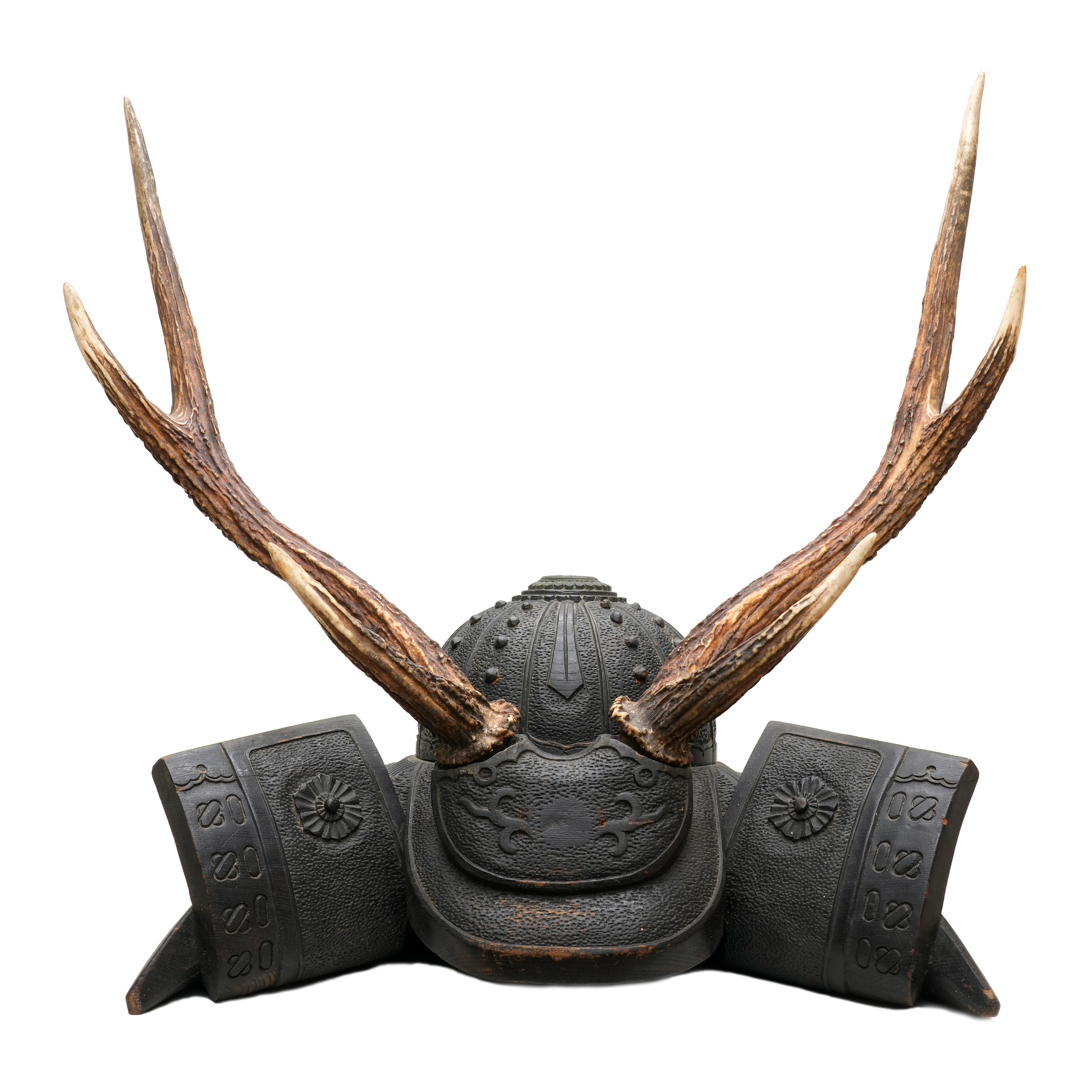 本作は木彫りで仕上げられた兜形の刀掛で、重厚感と風格を兼ね備えた逸品です。特筆すべきは、本物の日本鹿の角を使用している点で、自然の質感と力強さが巧みに表現されています。床の間に飾れば、見る者に確かな存在感と雅趣を与えことでしょう。前立を刺す穴が設けられているので、御家紋を制作して添えることも可能です。