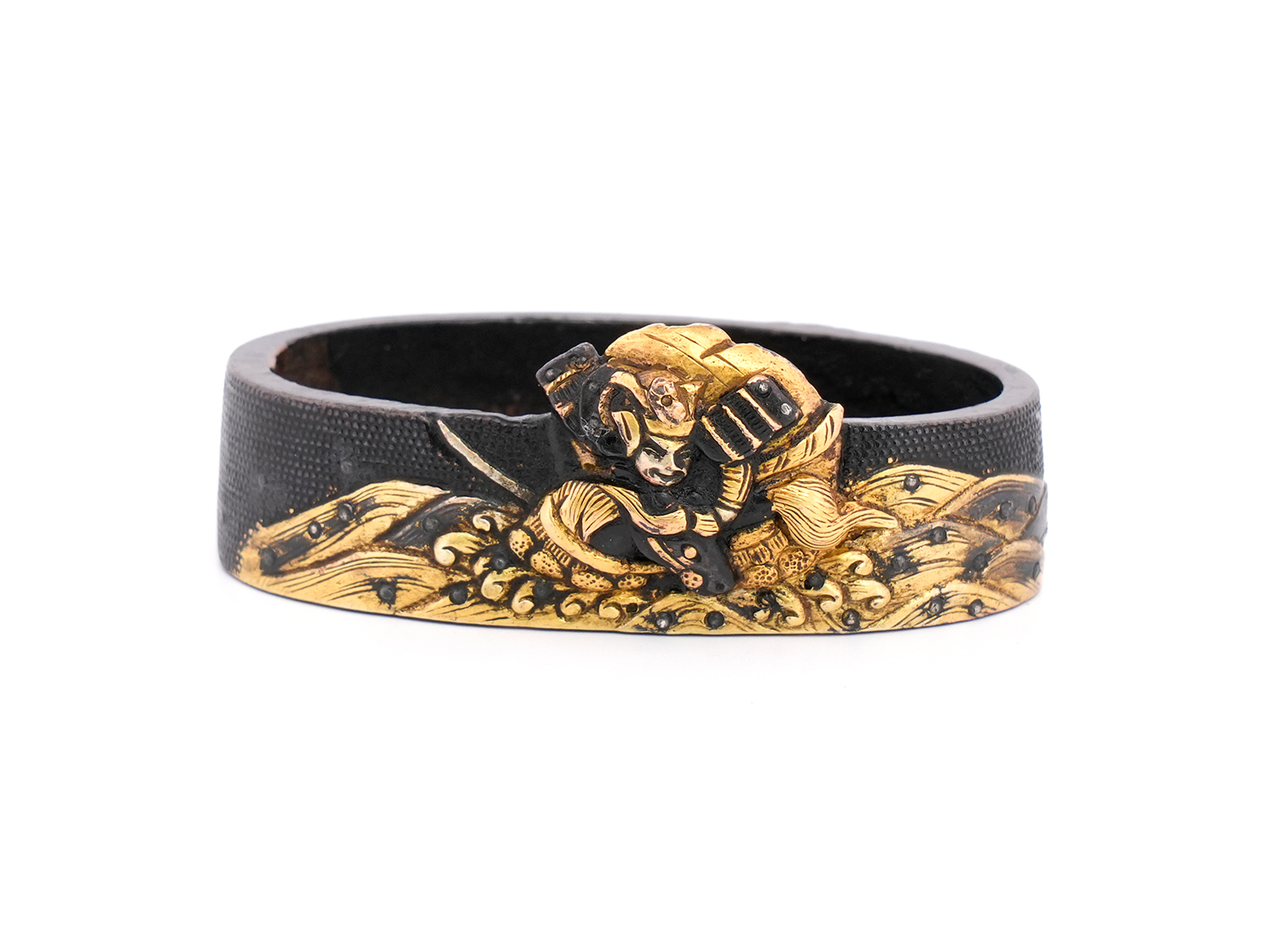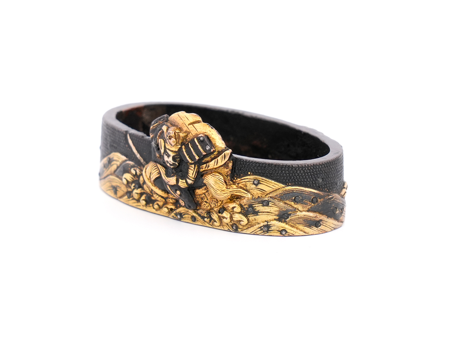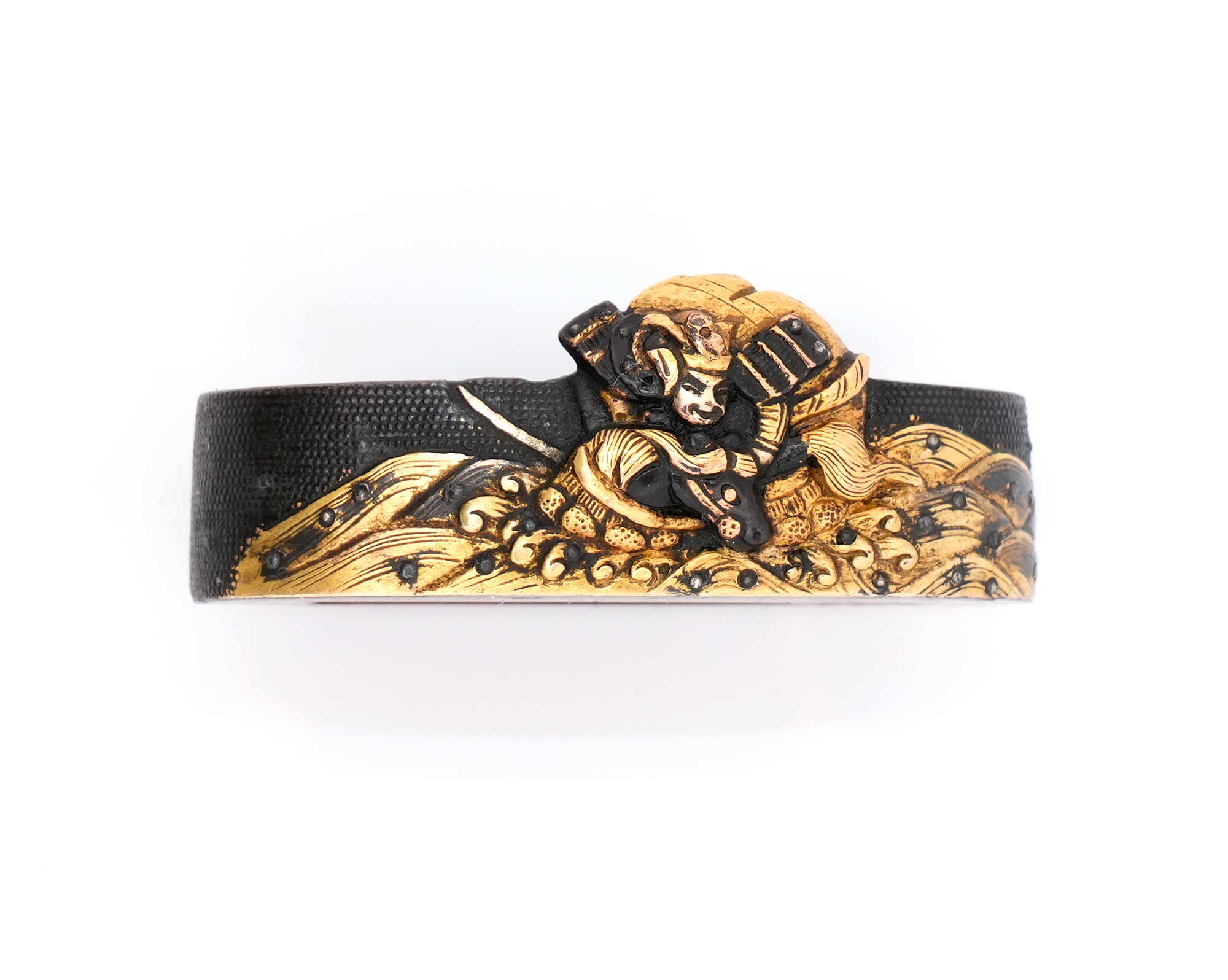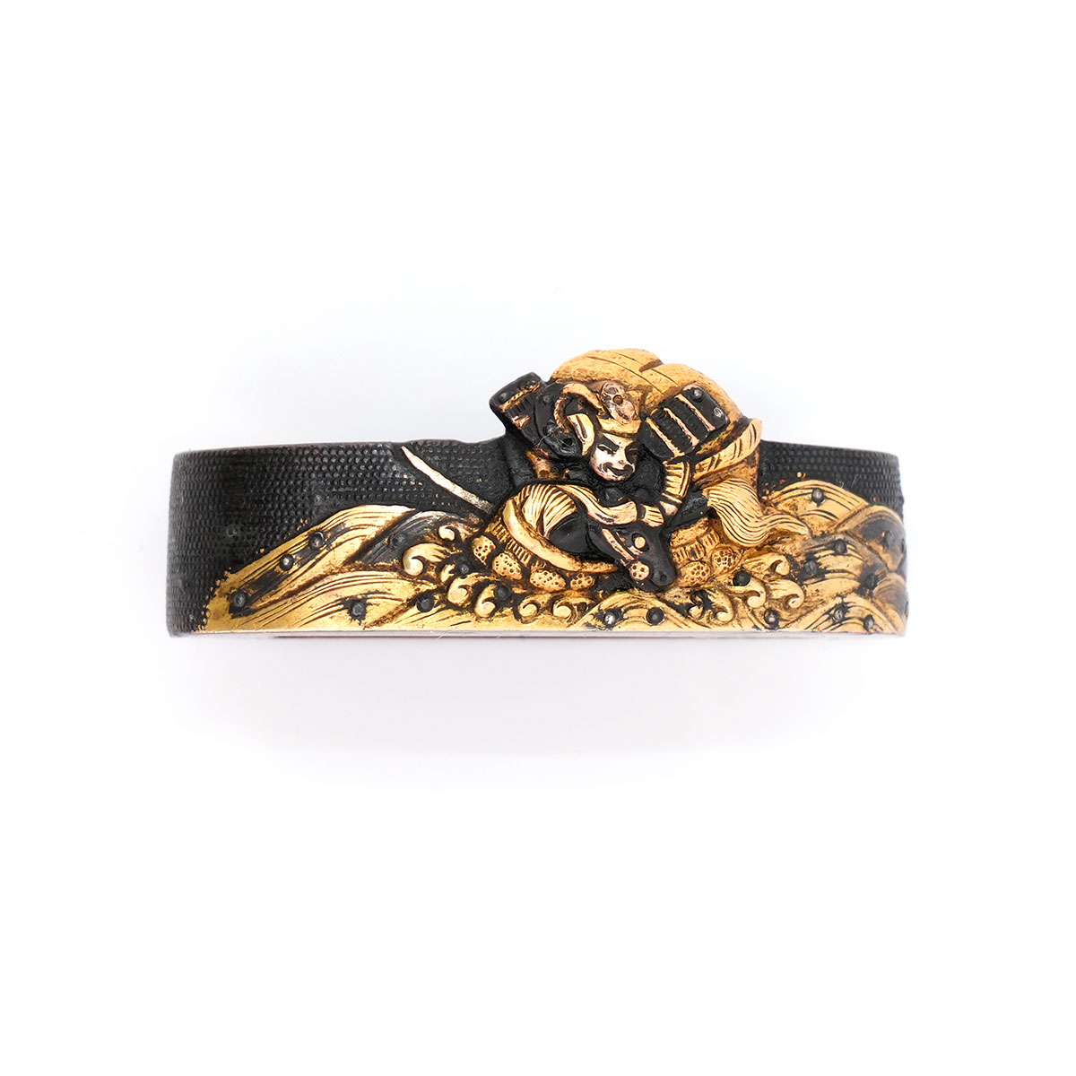 本作は赤銅地に『平家物語』屋島合戦の名場面、熊谷直実に呼び止められる平敦盛の姿を巧みに描いた作品です。武士の情と無常の哀を象徴する名場面を、精緻な彫技によって見事に表現しており、。静と動が交錯する構図が見る者の心を打つ一作です。