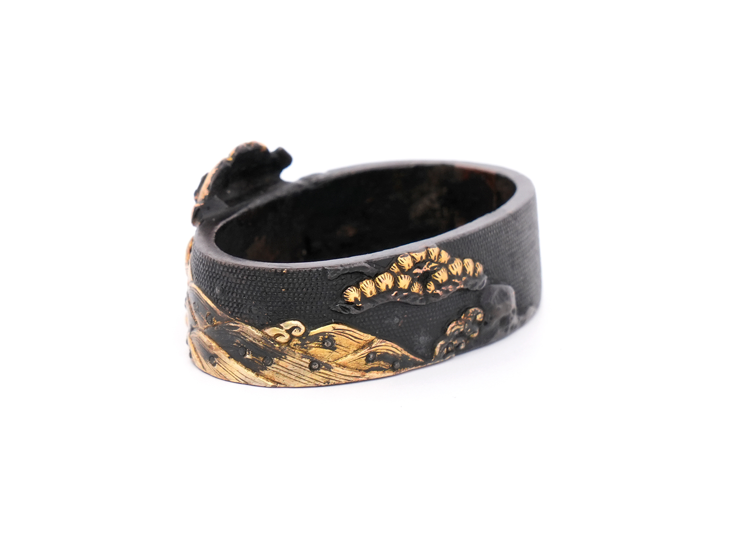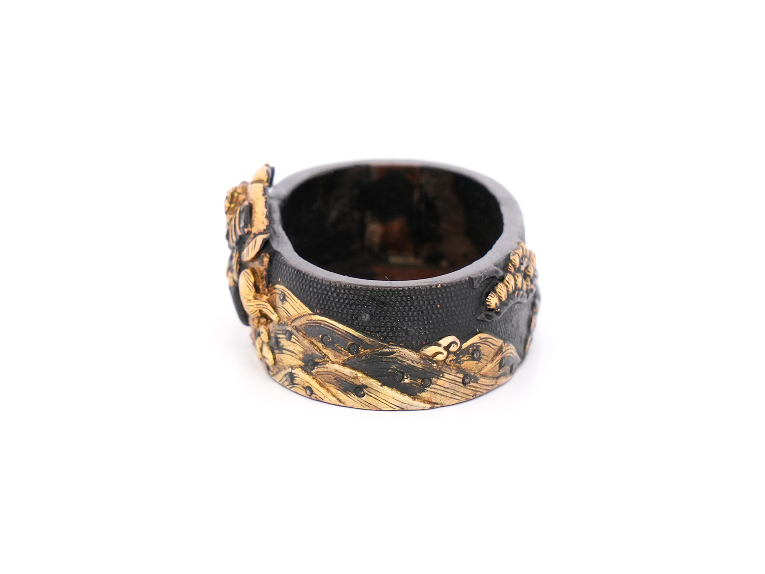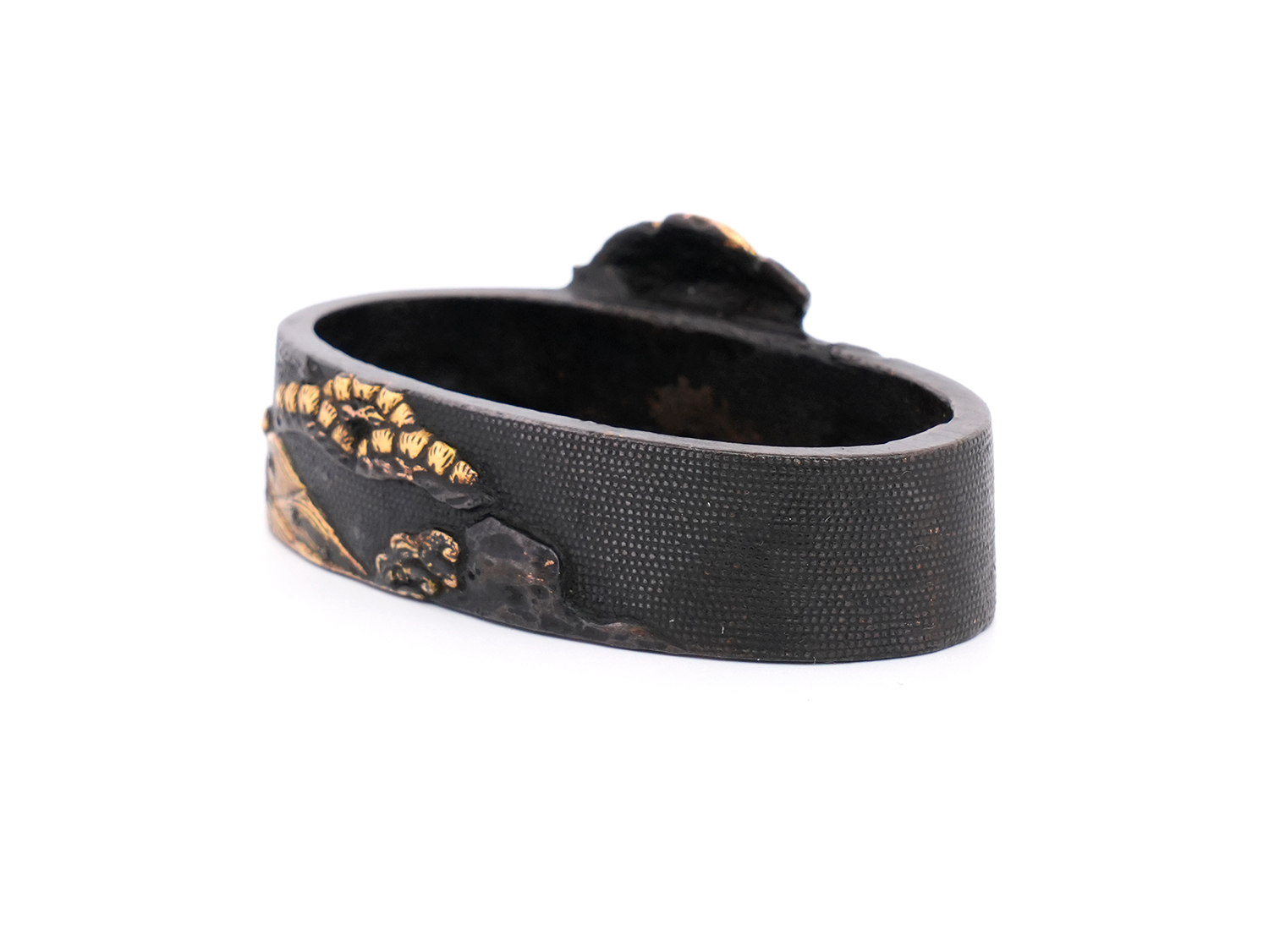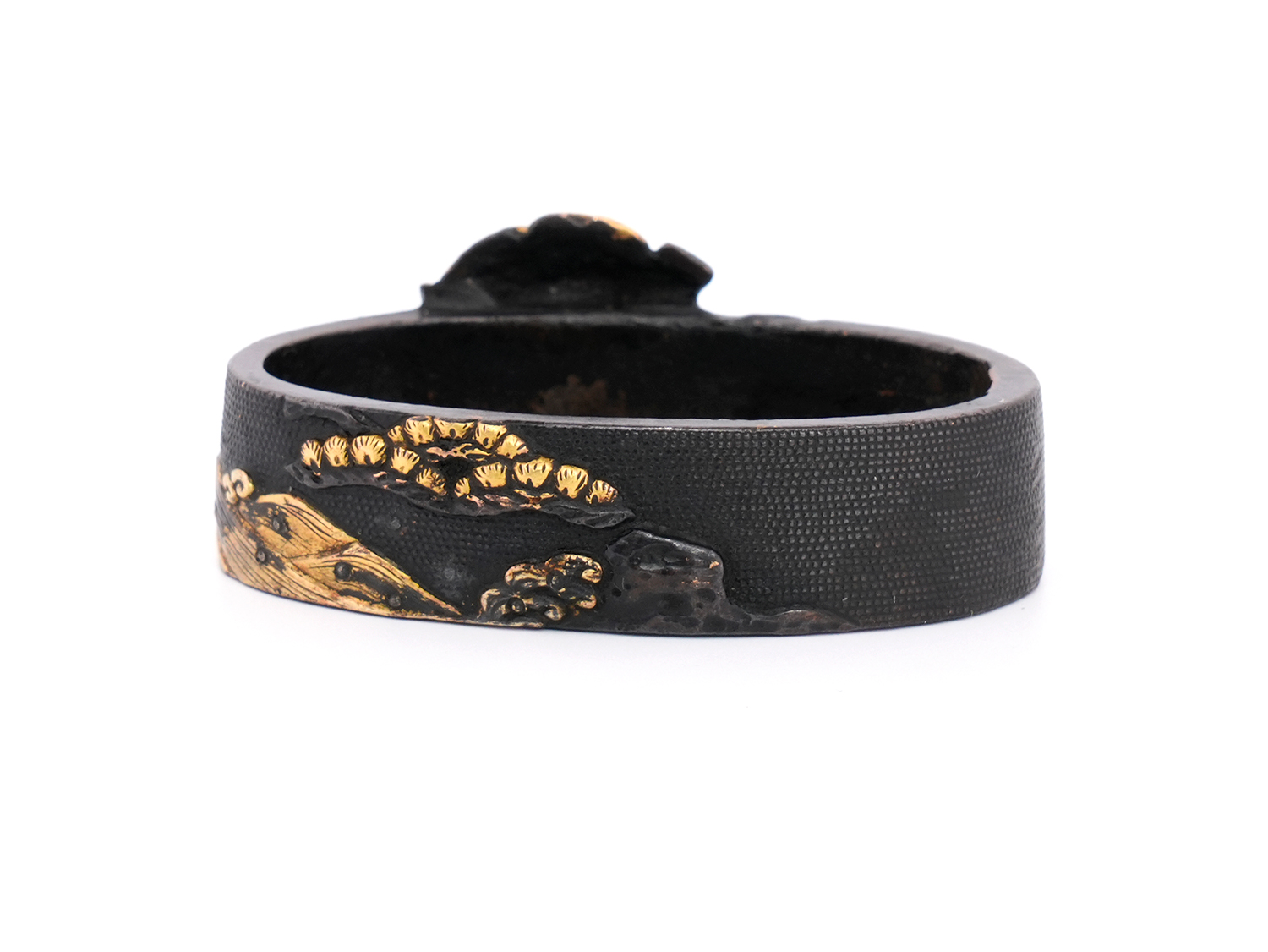 本作は赤銅地に『平家物語』屋島合戦の名場面、熊谷直実に呼び止められる平敦盛の姿を巧みに描いた作品です。武士の情と無常の哀を象徴する名場面を、精緻な彫技によって見事に表現しており、。静と動が交錯する構図が見る者の心を打つ一作です。