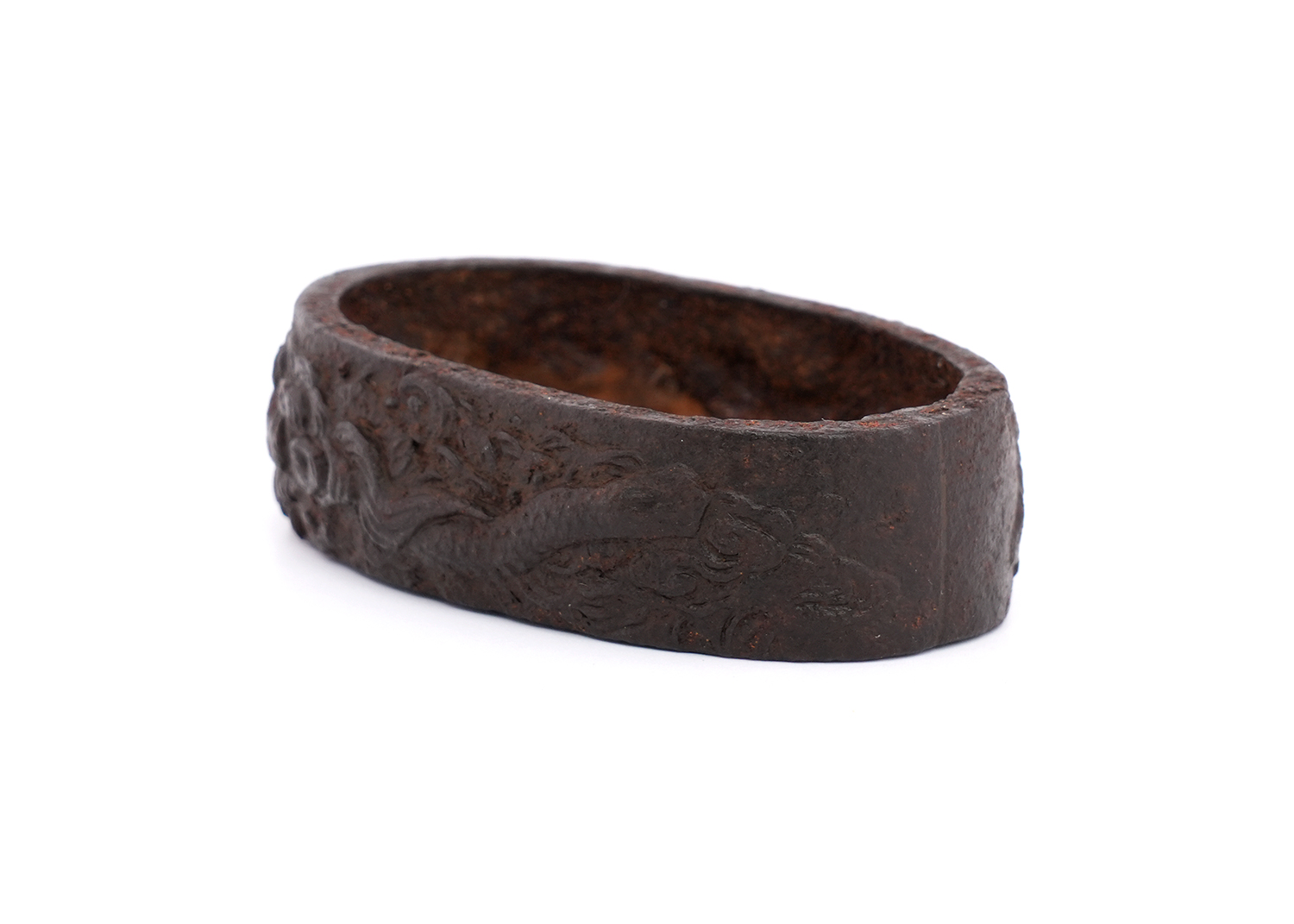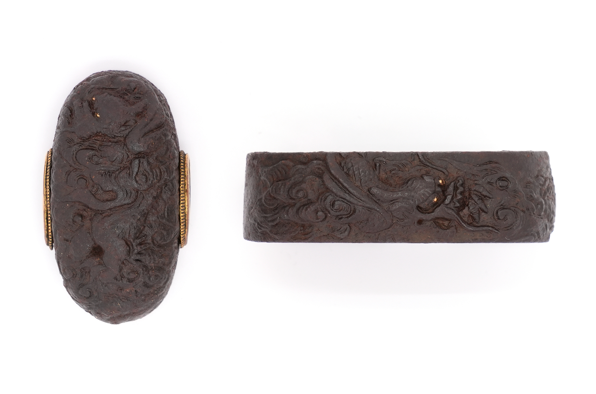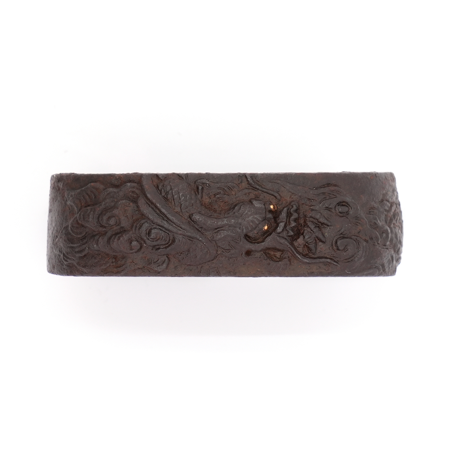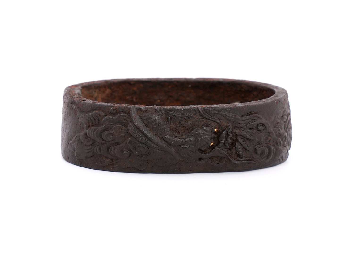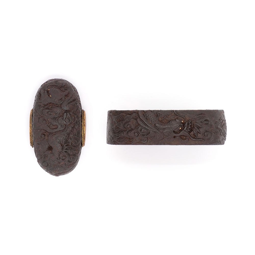 本作は鉄地に雲龍を精緻に彫り上げた縁金具です。龍の躍動感ある姿が立体的に表現され、力強さと雅趣を兼ね備えています。縁の直径は40.25ミリと大ぶりで、刀の拵に取り付けるのに適しており、鐔や目貫など他の金具との組み合わせもしやすく、幅広く重宝する逸品です。