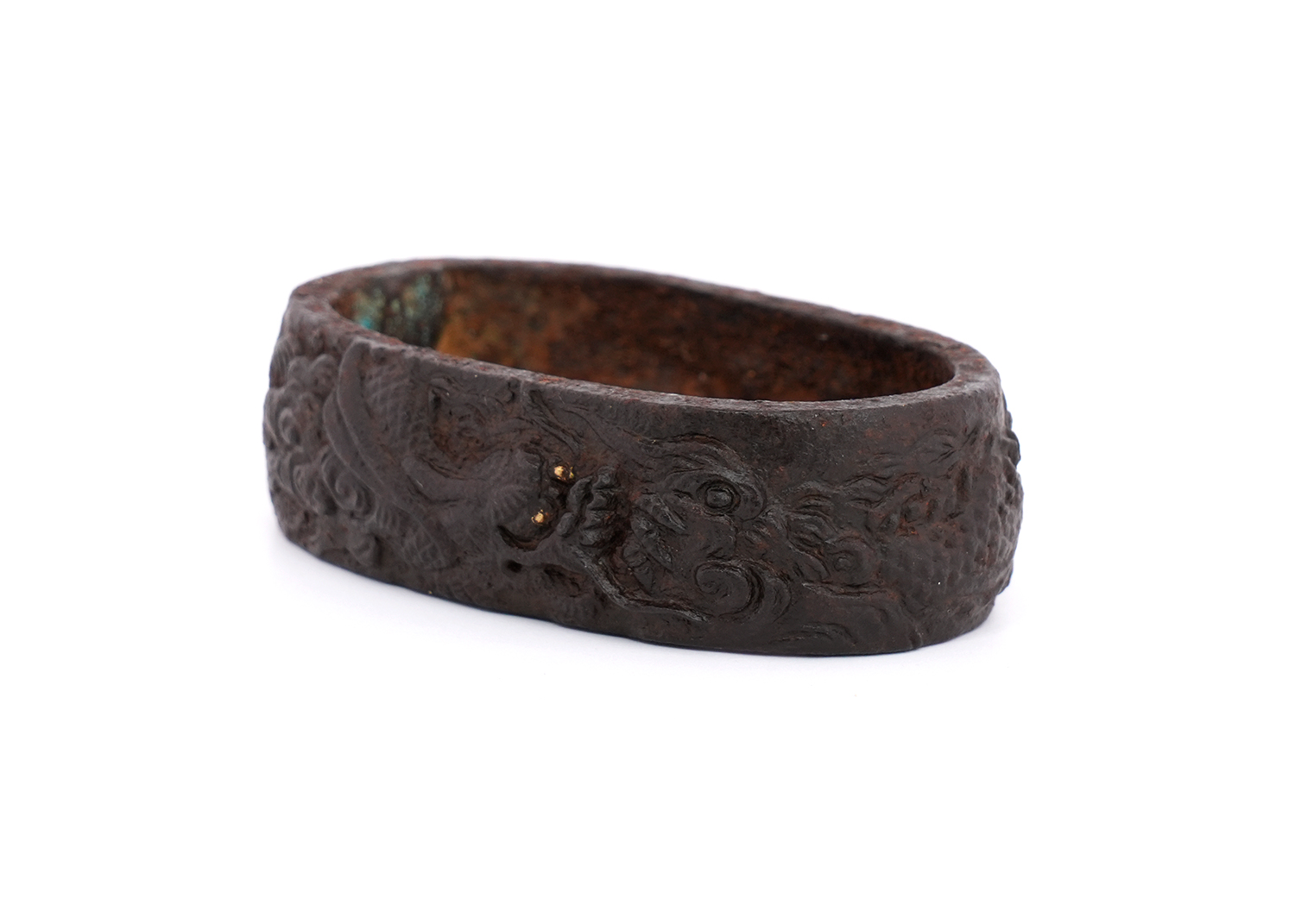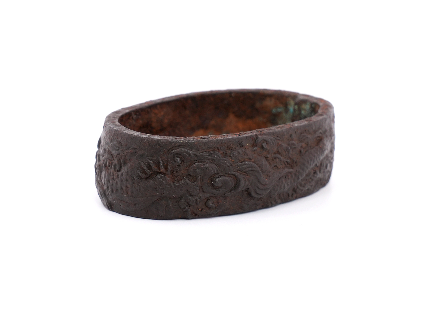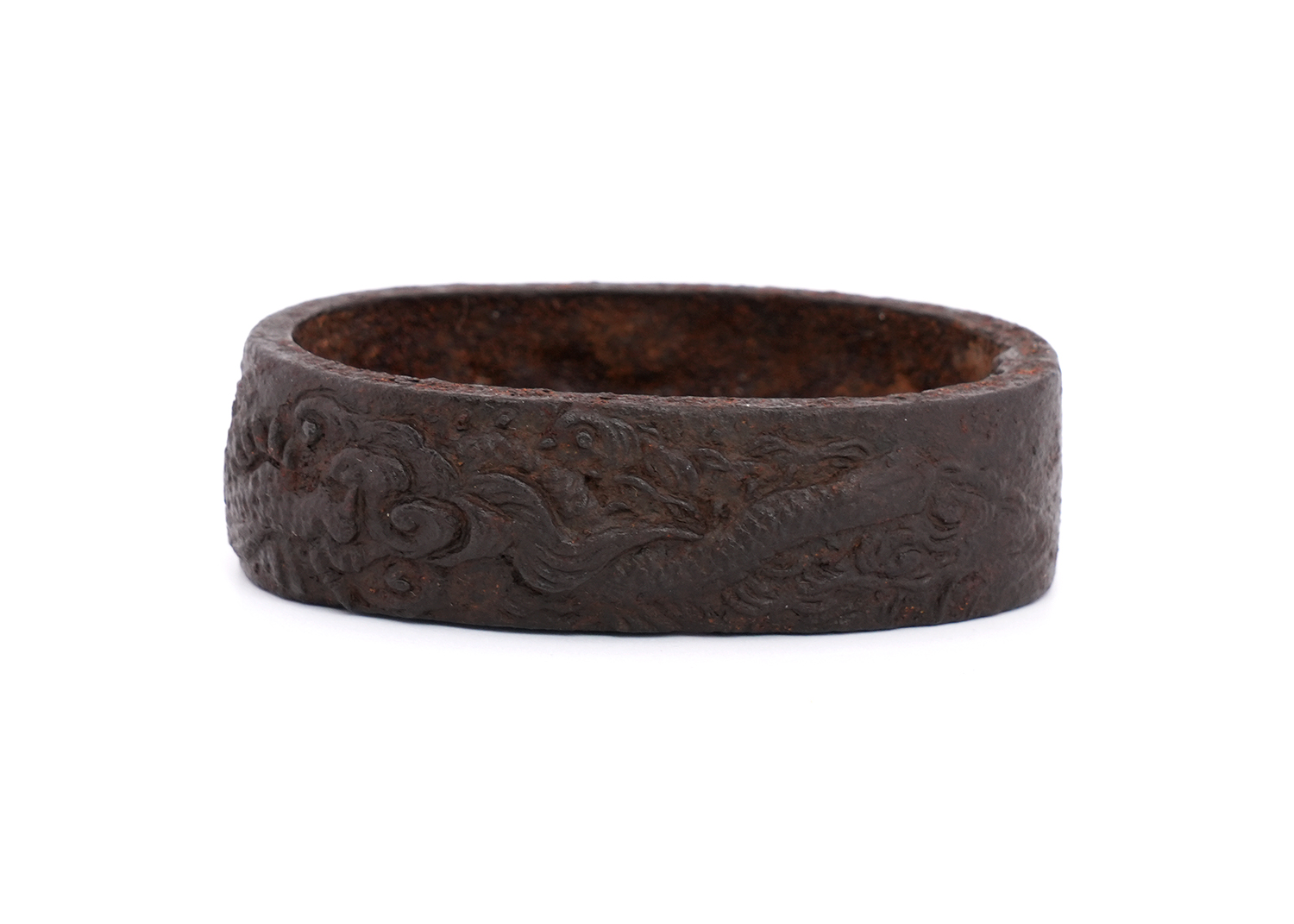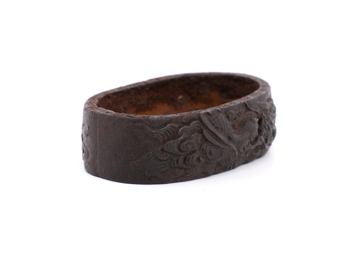 本作は鉄地に雲龍を精緻に彫り上げた縁金具です。龍の躍動感ある姿が立体的に表現され、力強さと雅趣を兼ね備えています。縁の直径は40.25ミリと大ぶりで、刀の拵に取り付けるのに適しており、鐔や目貫など他の金具との組み合わせもしやすく、幅広く重宝する逸品です。