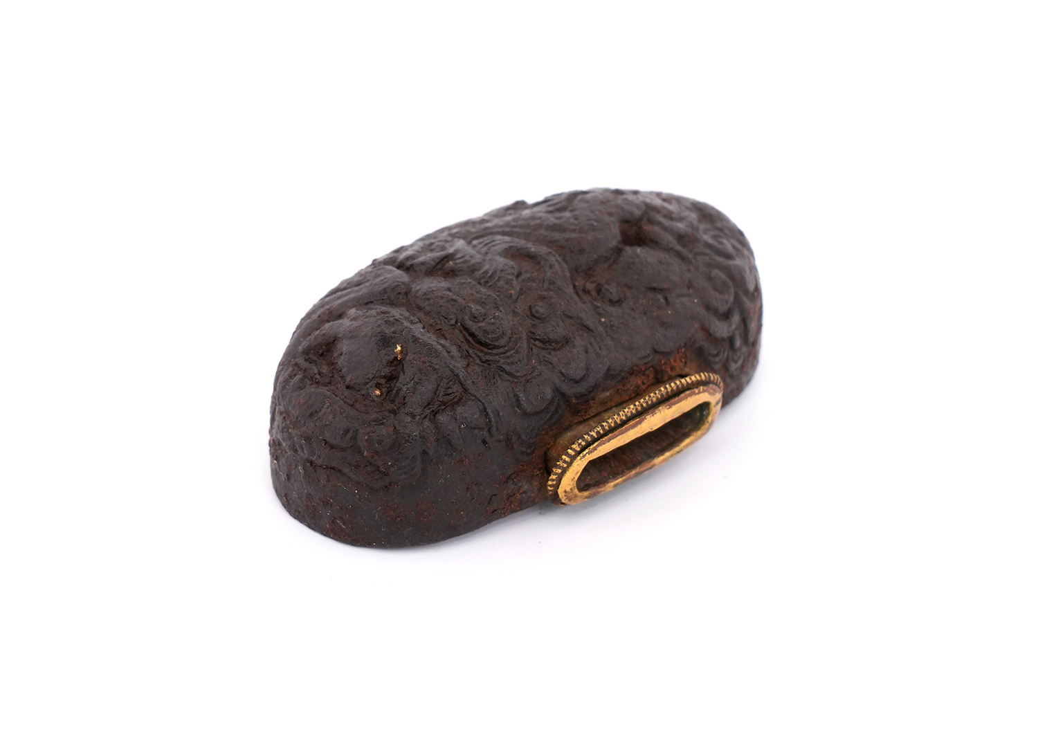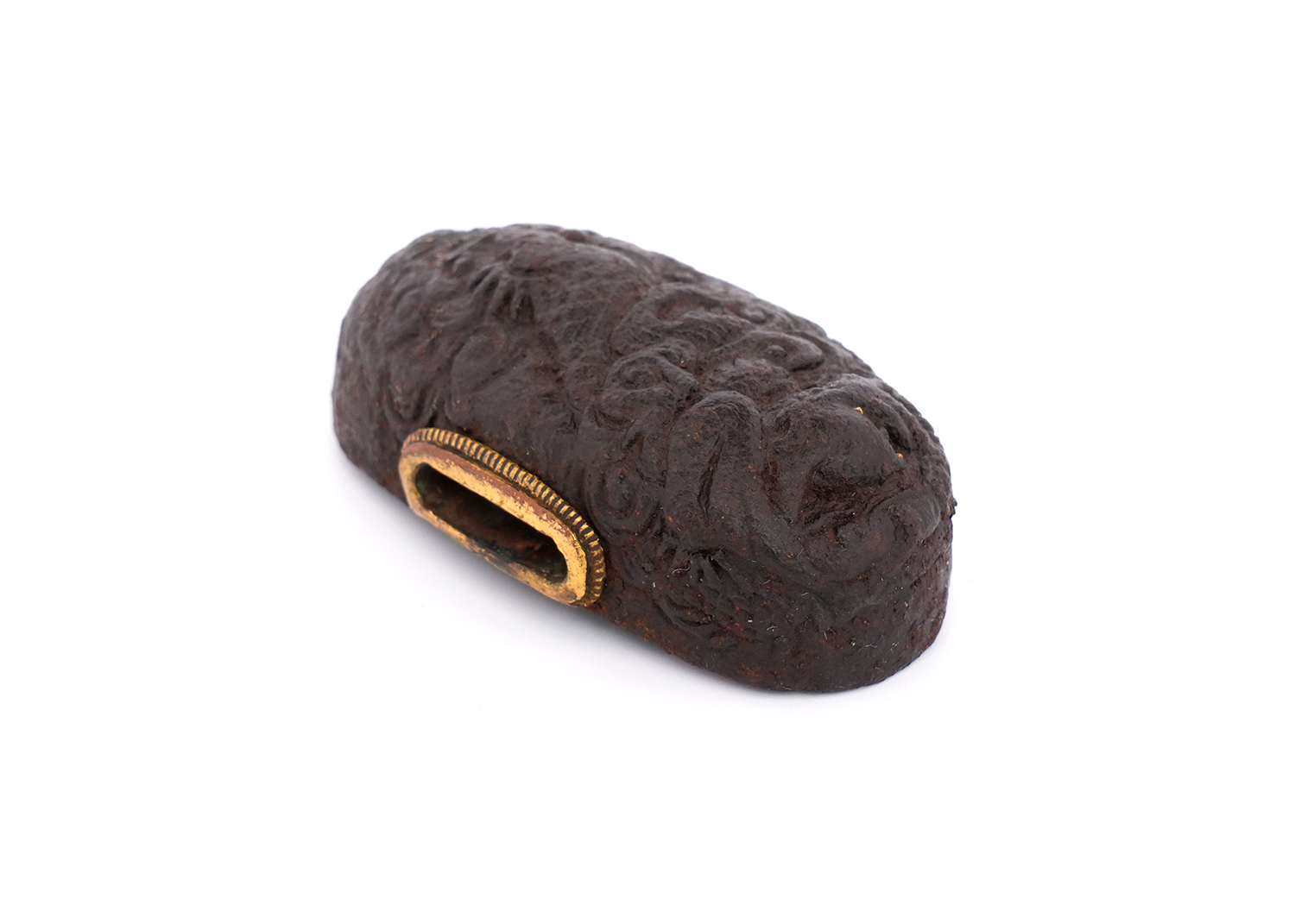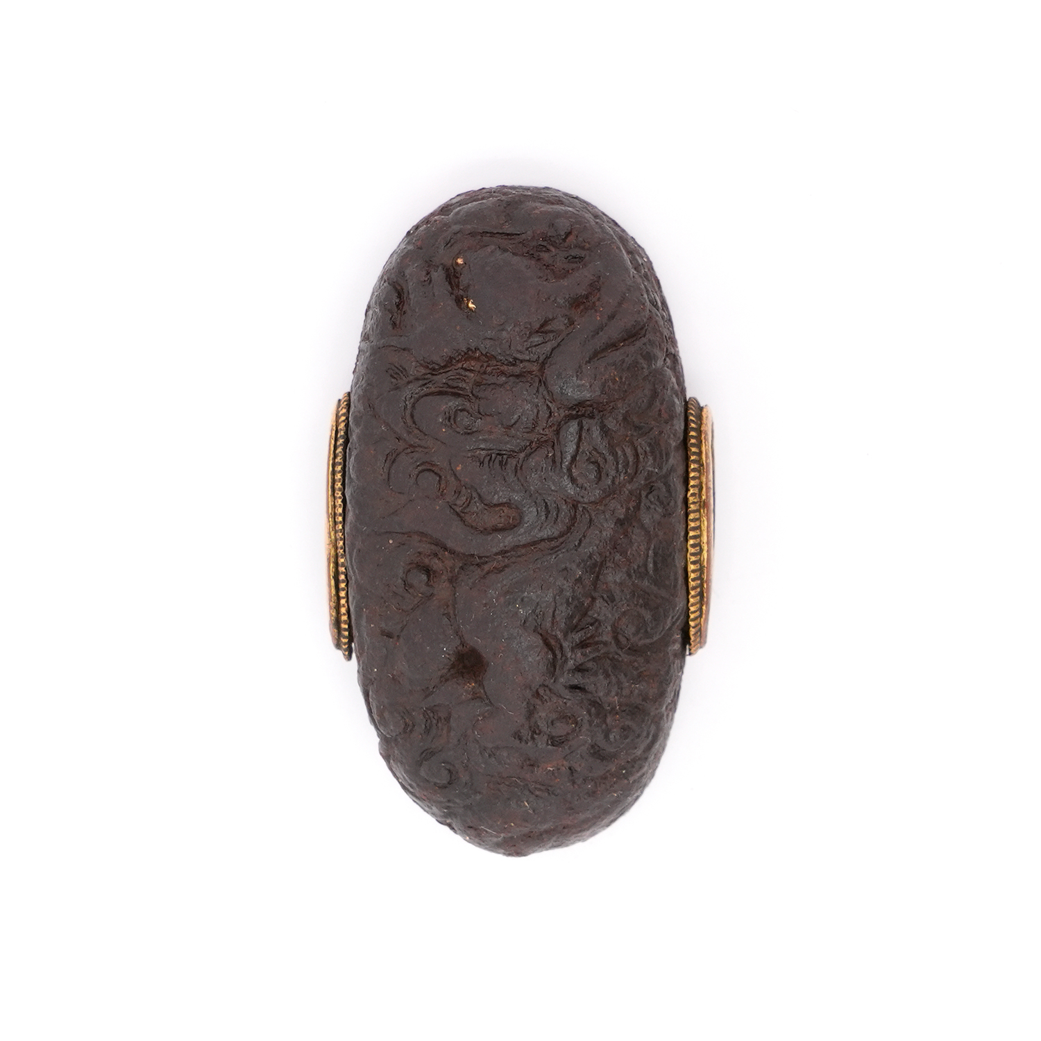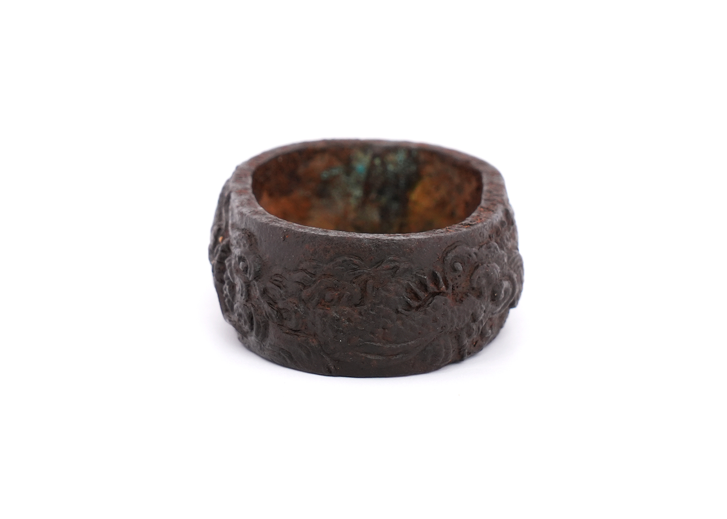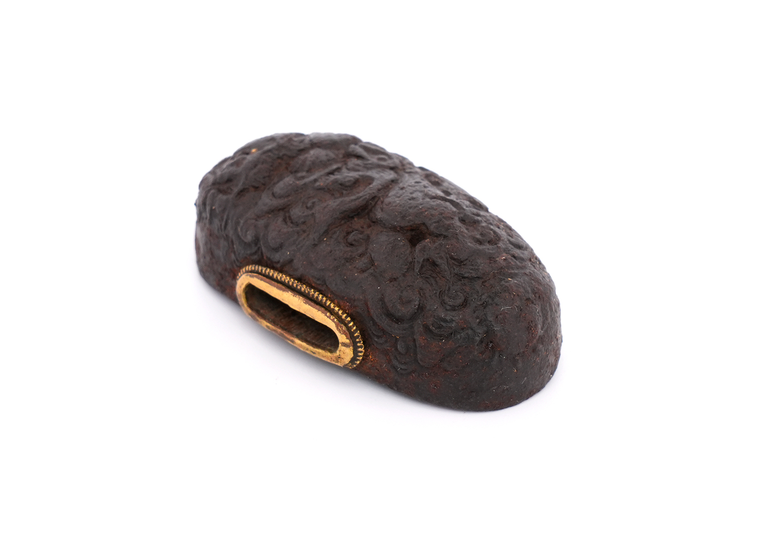 本作は鉄地に雲龍を精緻に彫り上げた縁金具です。龍の躍動感ある姿が立体的に表現され、力強さと雅趣を兼ね備えています。縁の直径は40.25ミリと大ぶりで、刀の拵に取り付けるのに適しており、鐔や目貫など他の金具との組み合わせもしやすく、幅広く重宝する逸品です。