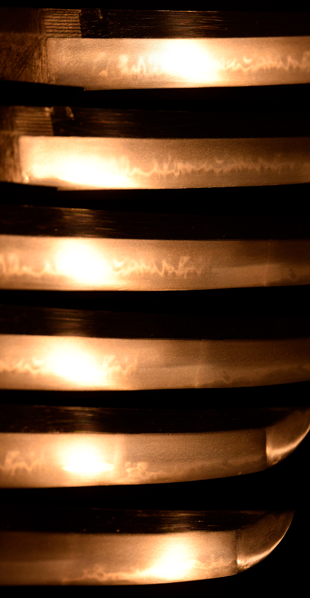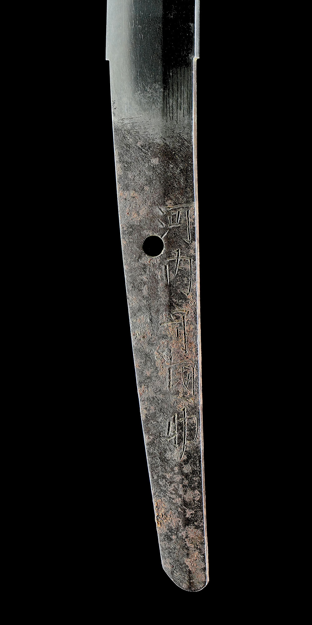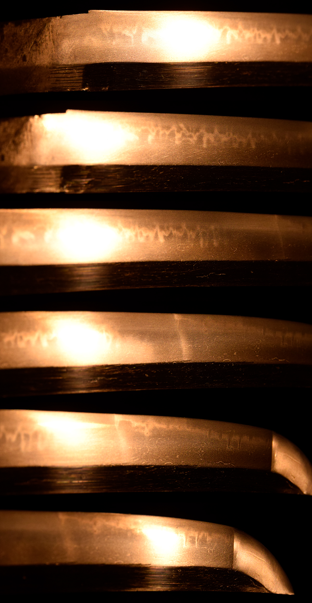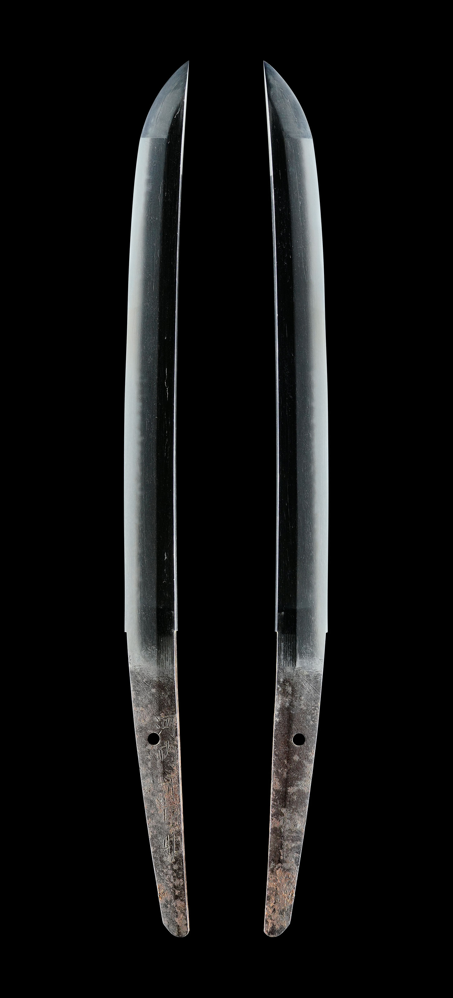 溶接の際の熱処理により、接合部付近の焼刃は消失していますが、それ以外の部分では地刃の鑑賞が可能で、匂口明るく冴えた丁字乱れは見応えがあり、往時の作風を十分に楽しむことができます。