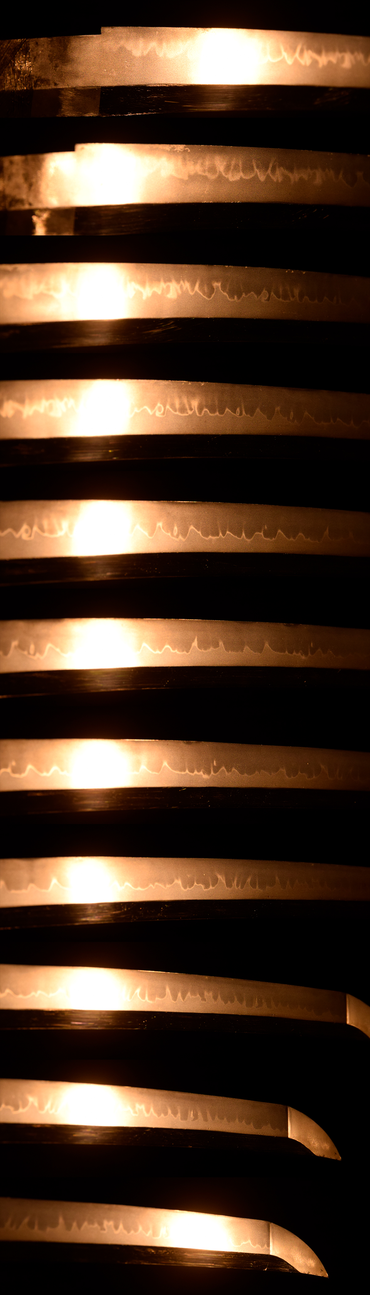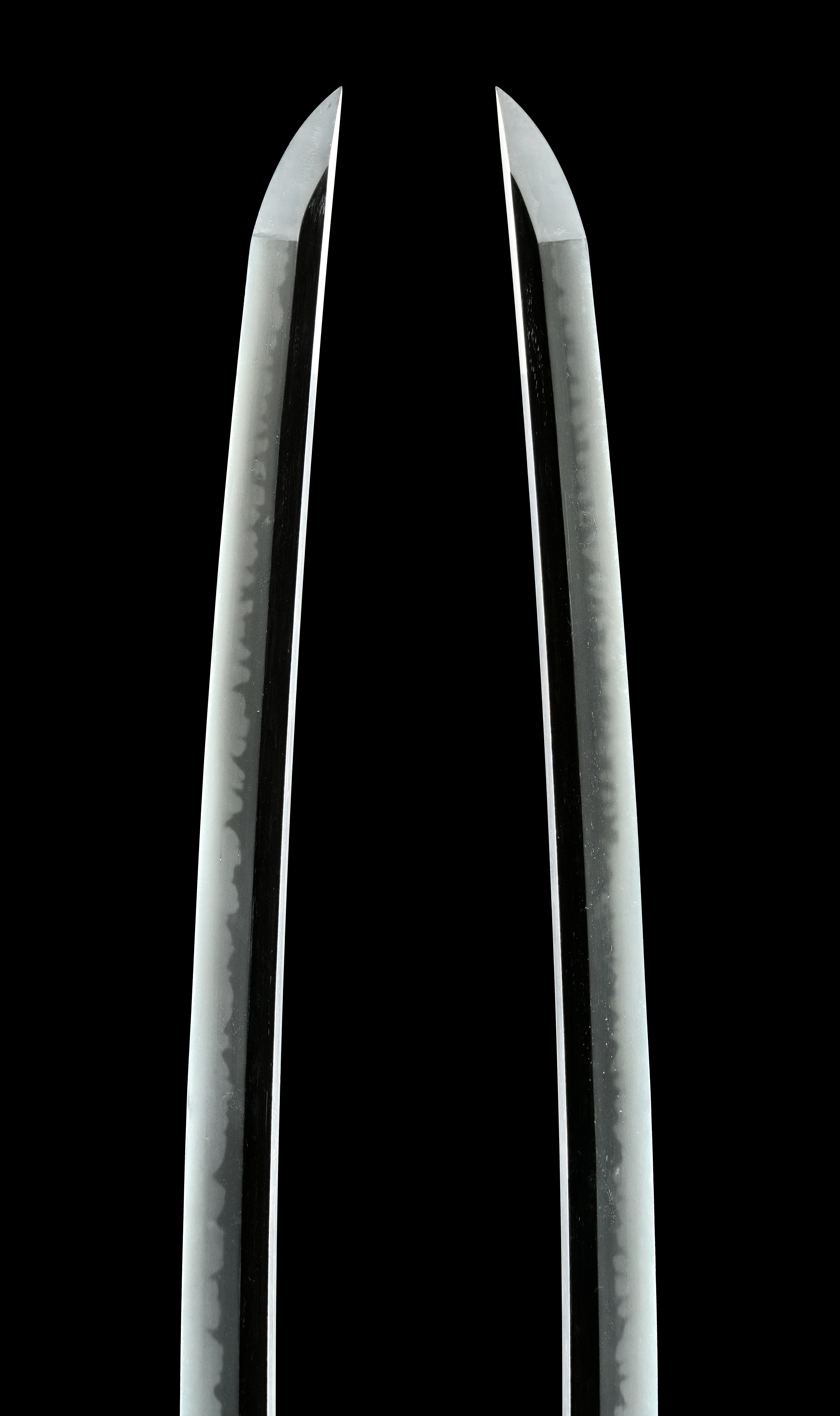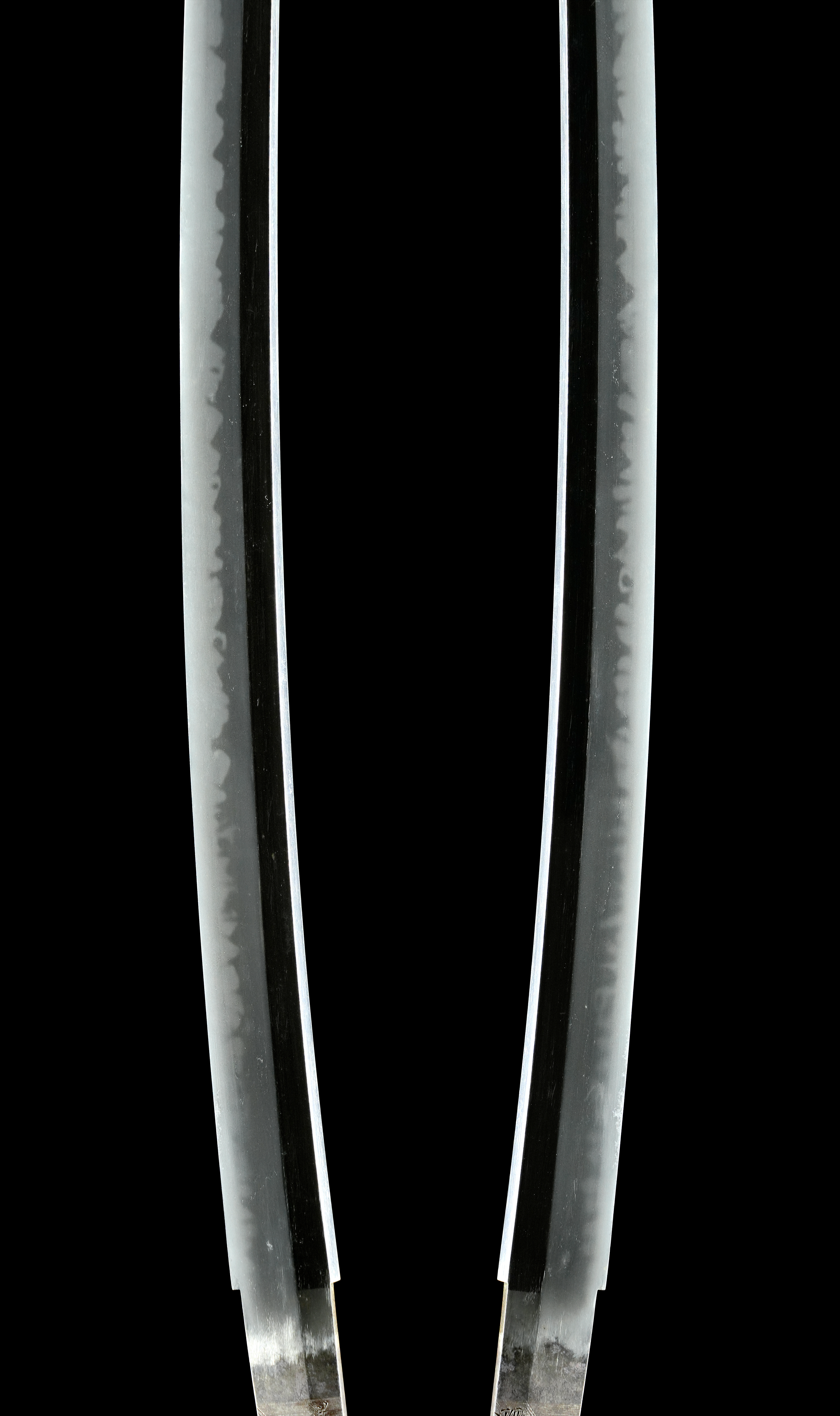 本刀は、元先の幅差頃好く開き、切先延びて反りやや深く、豪壮にして雅趣を備えた堂々たる姿を誇る。地鉄は小板目肌がよく練れて詰み、無地風に見えるほど精良。刃文は匂口明るく冴えた互ノ目を基調に、互ノ目丁字や丁字を交え、刃中には足が長く頻りに入り、葉や蛇の目風の刃も交じるなど、変化豊かで見応え十分。鋩子は乱れ込んで焼きたっぷりと一枚風になり、先丸く返る。津山藩刀工の気迫と洗練が見事に調和した出来映えである。