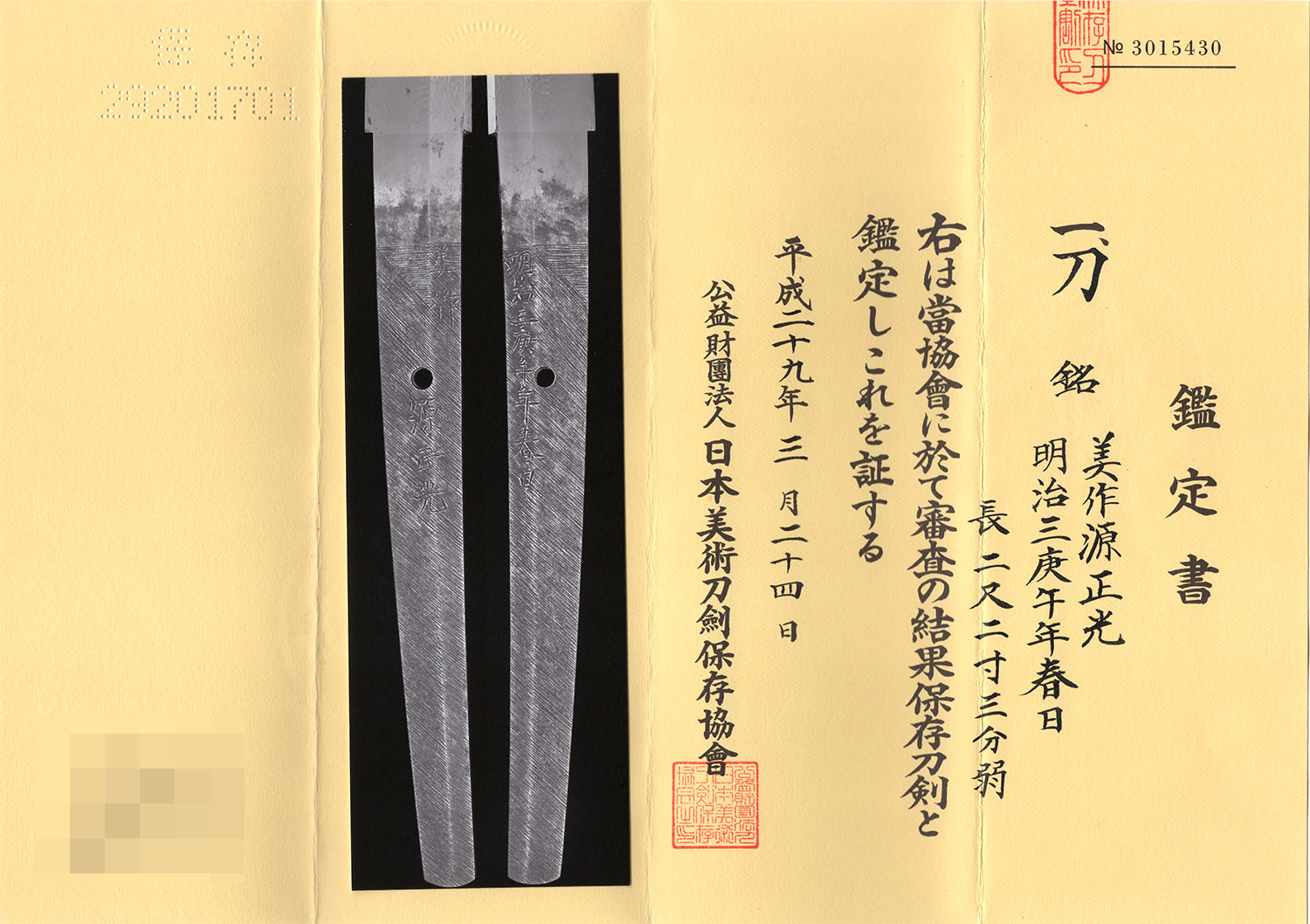 附属 保存刀剣鑑定書、銀無垢金鍍金はばき、白鞘