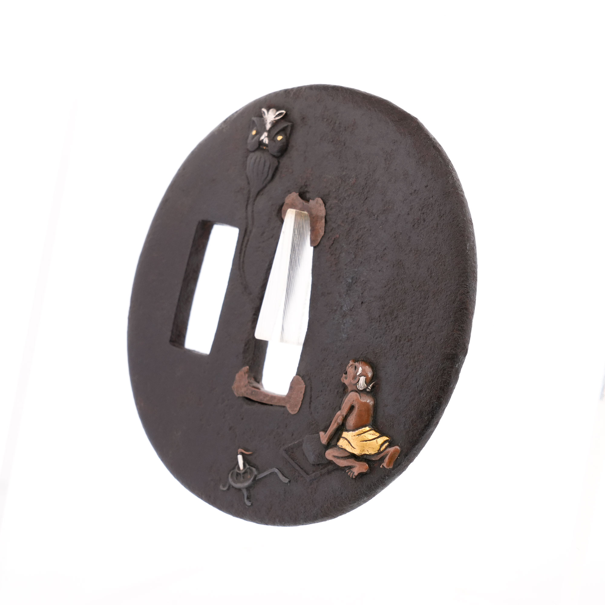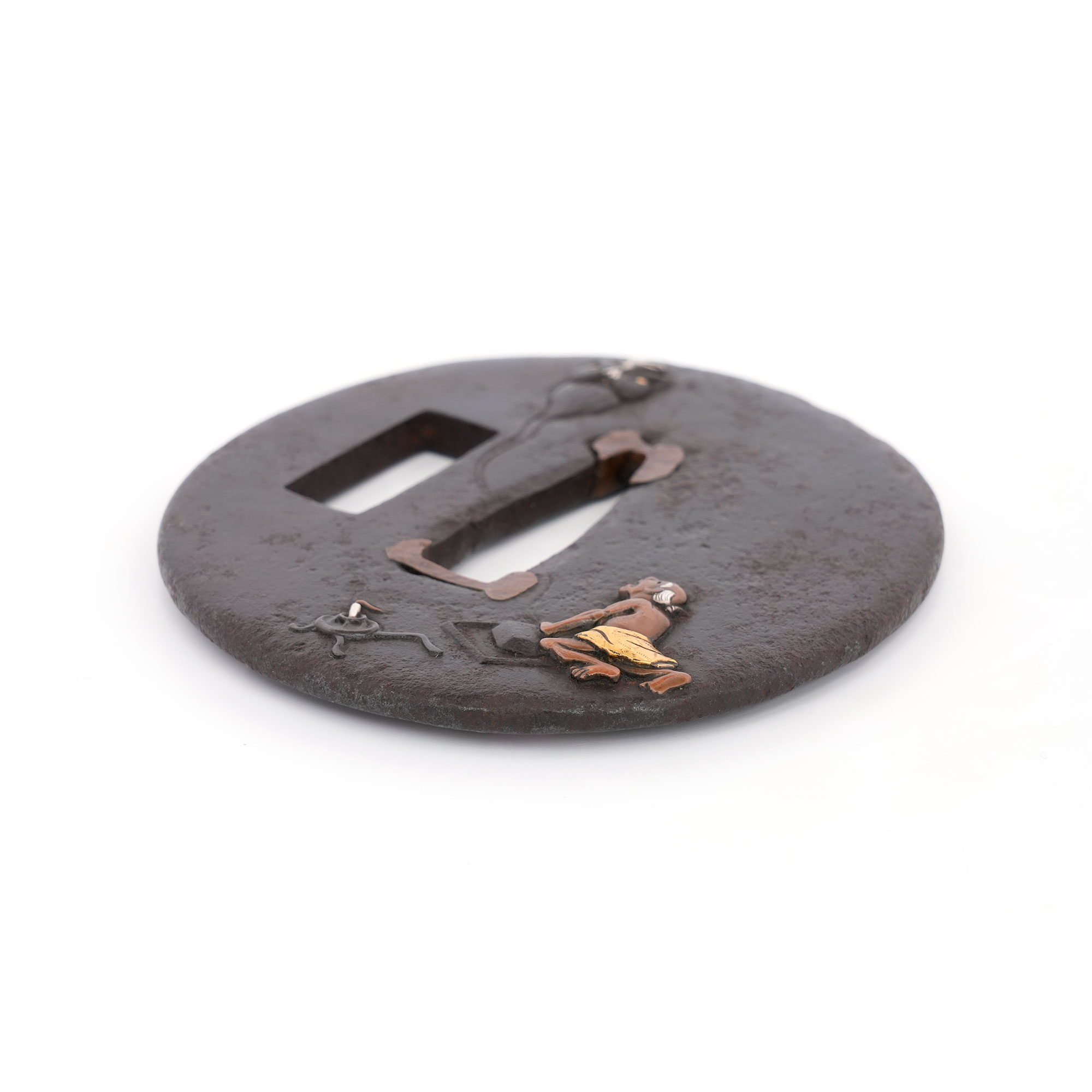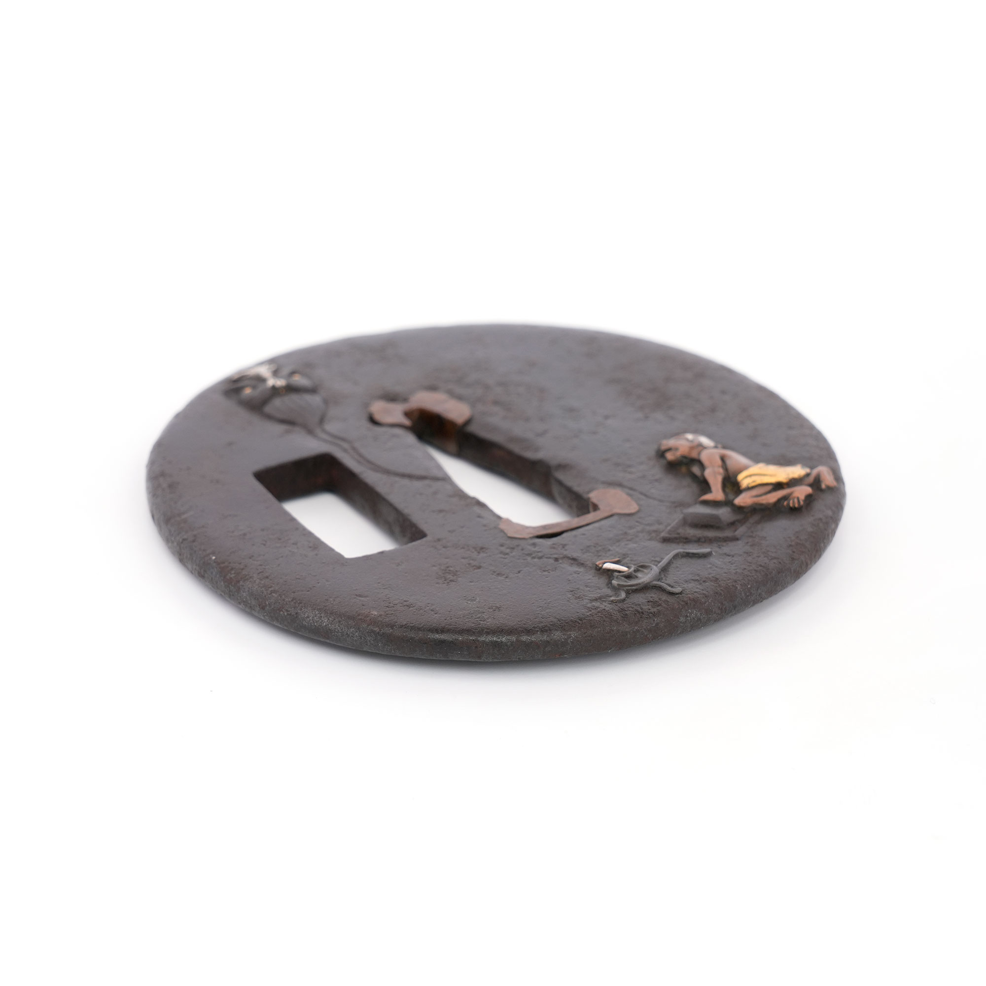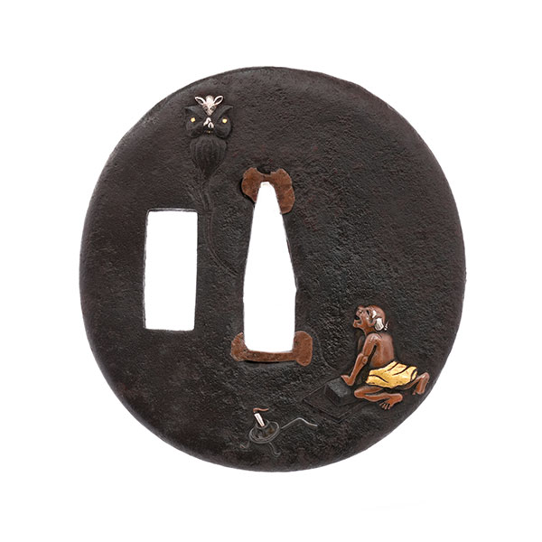 この鐔は、鉄地に上述の『鼠の恩返し』の伝承を描いた作品です。老人と鼠の幽霊を巧みな彫りで表しており、細部にまで行き届いた彫技によって、幽玄な物語性と静かな気配が見事に表され、まるで民話『鼠の恩返し』の一場面が目の前に広がるかのようです。