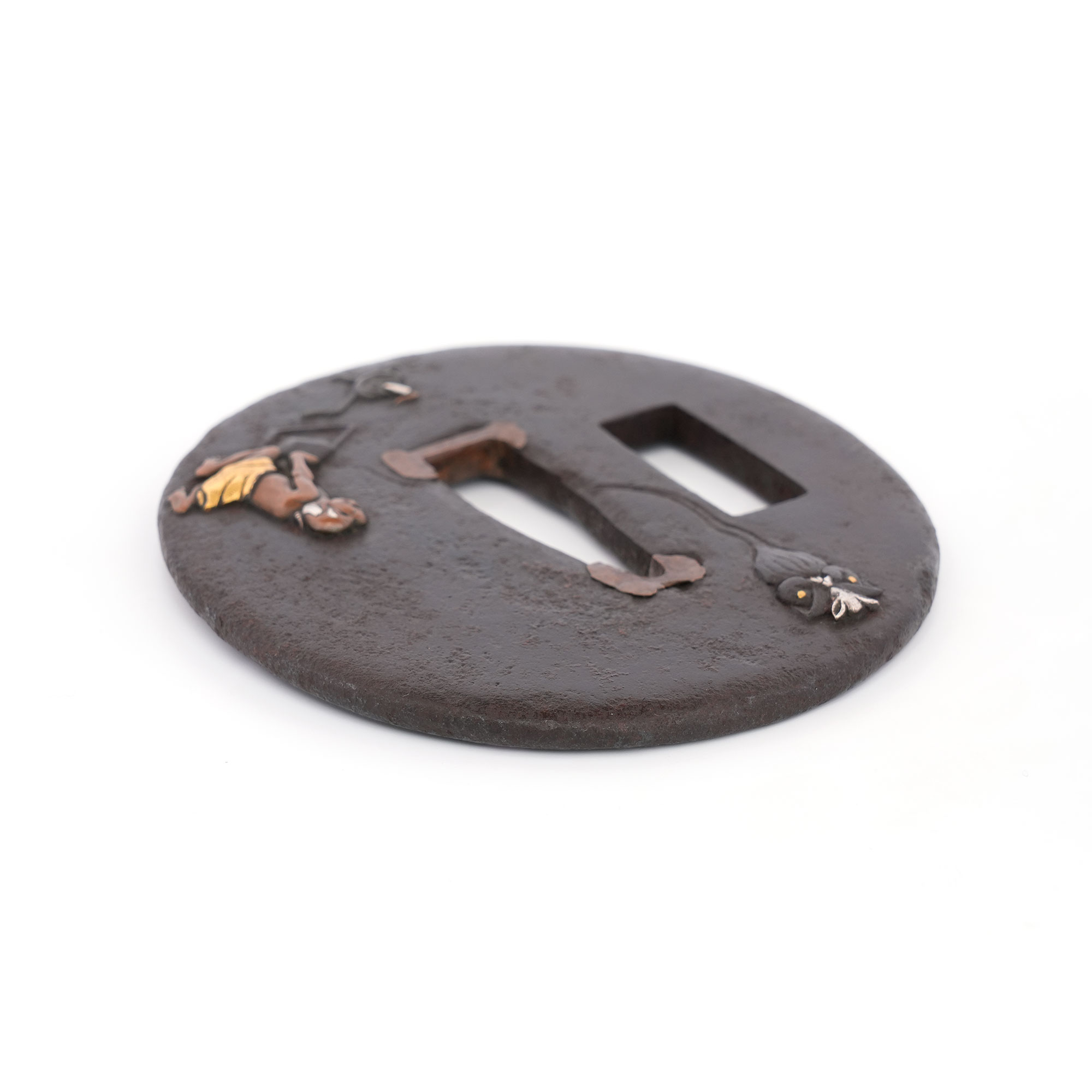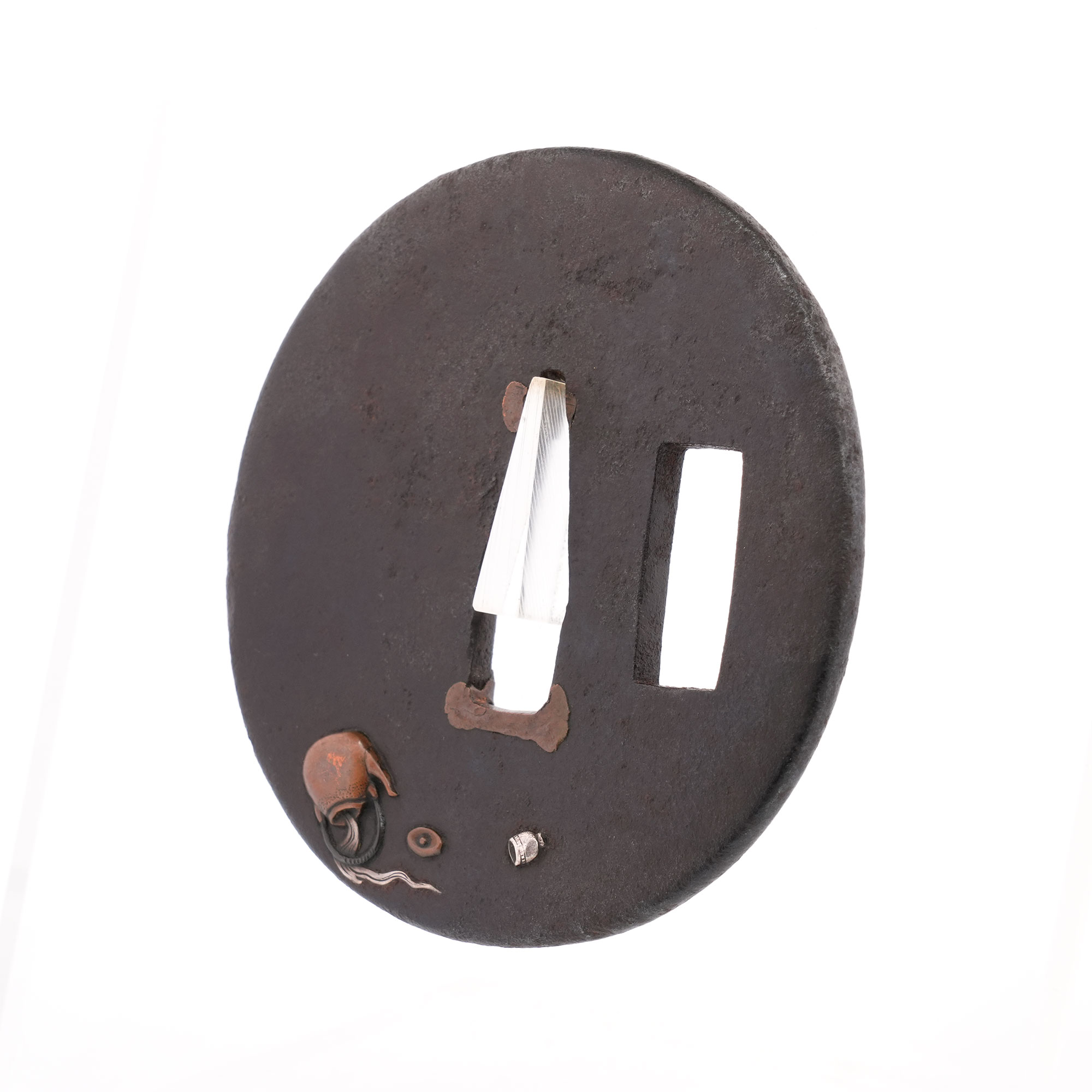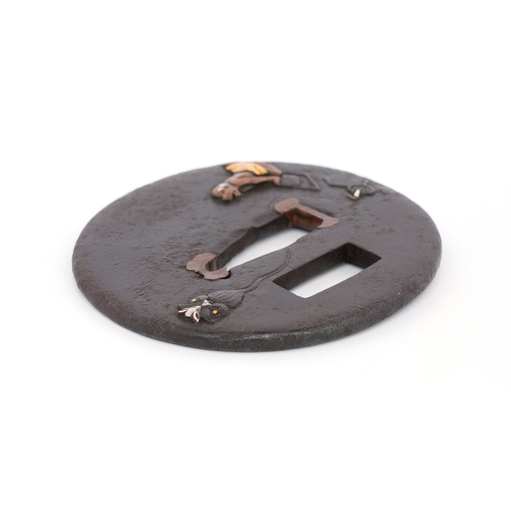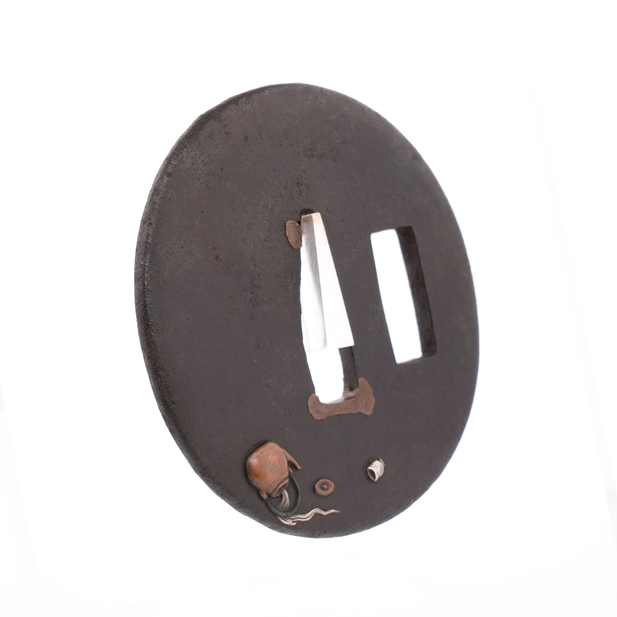 この鐔は、鉄地に上述の『鼠の恩返し』の伝承を描いた作品です。老人と鼠の幽霊を巧みな彫りで表しており、細部にまで行き届いた彫技によって、幽玄な物語性と静かな気配が見事に表され、まるで民話『鼠の恩返し』の一場面が目の前に広がるかのようです。