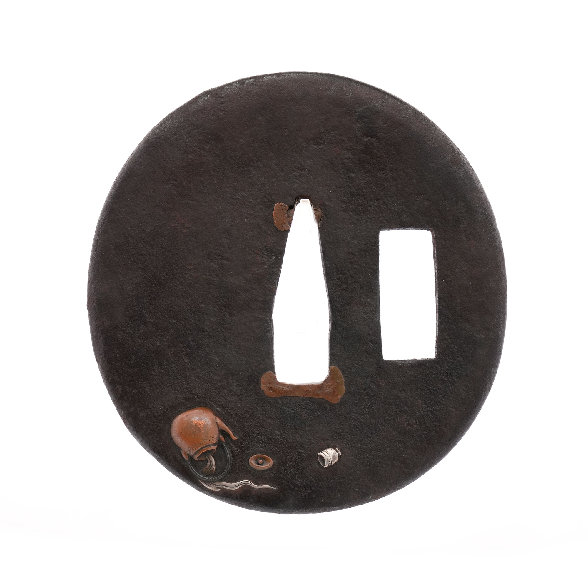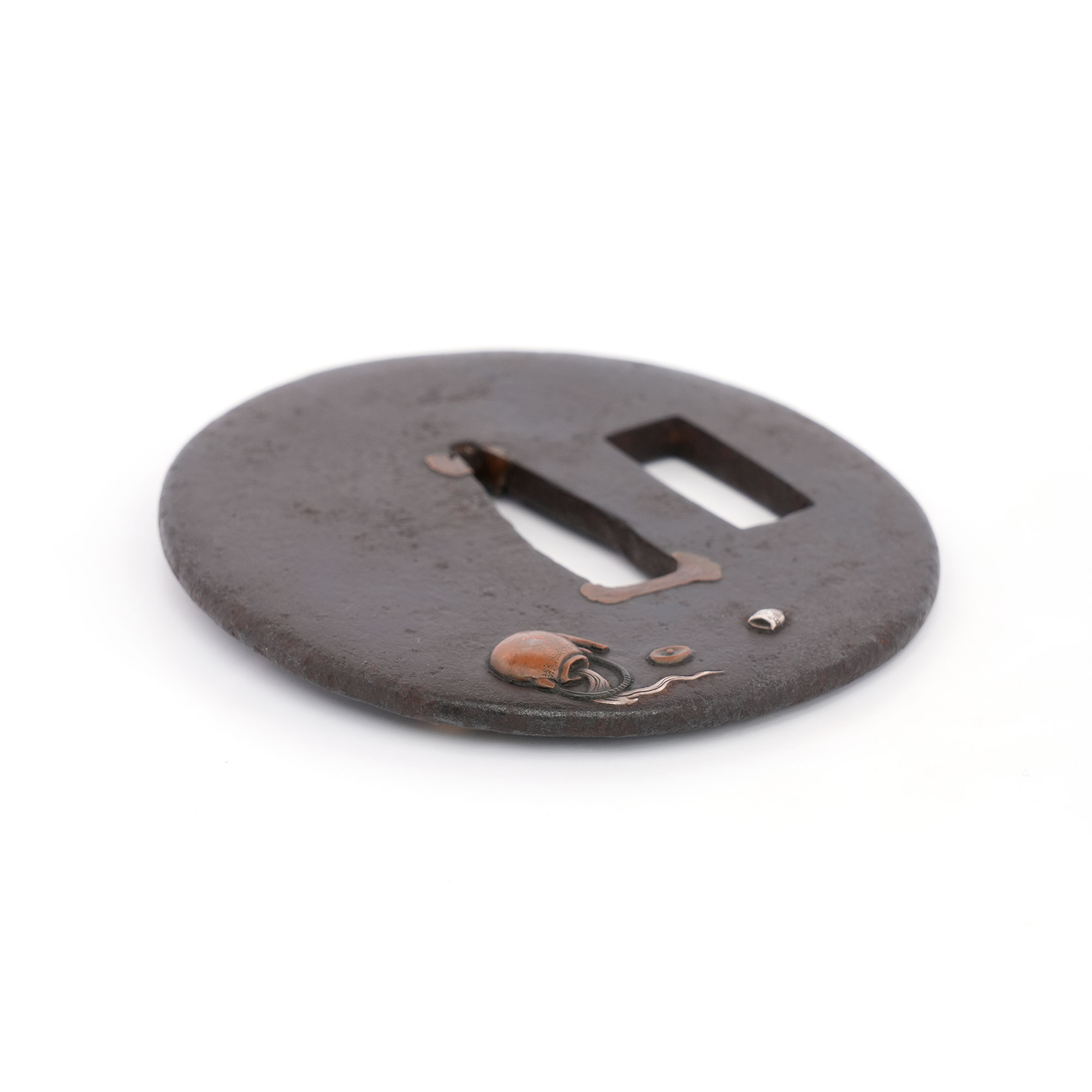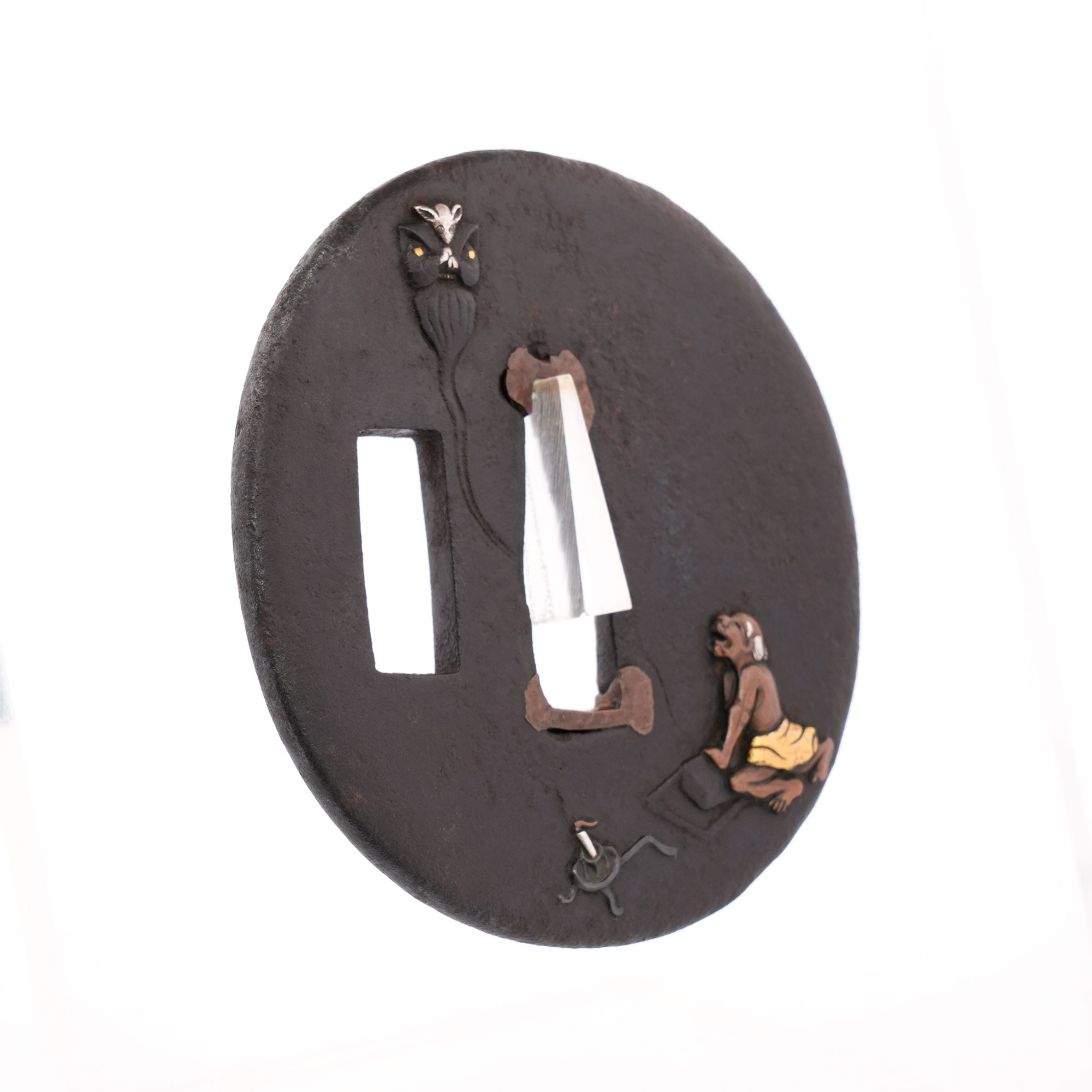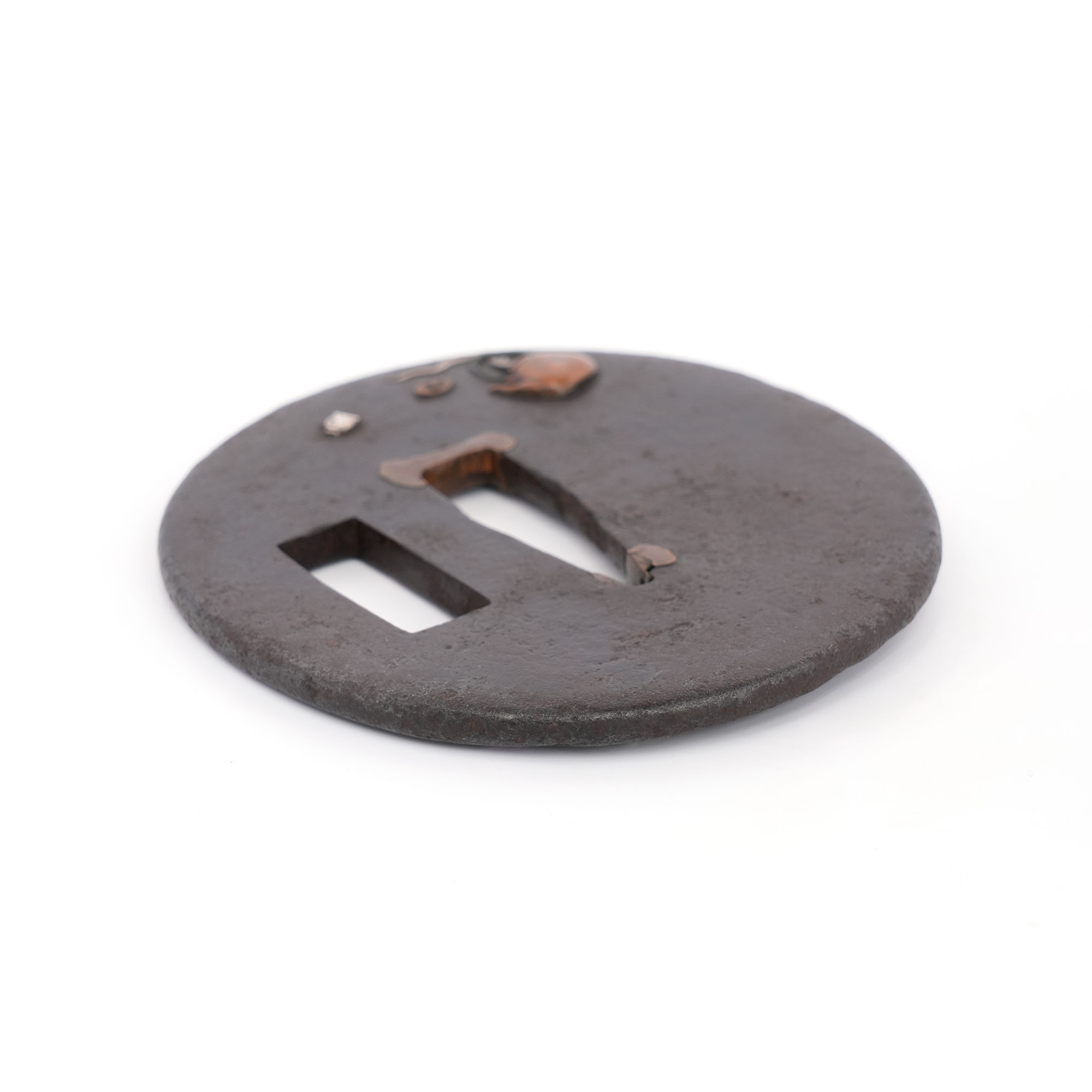この鐔は、鉄地に上述の『鼠の恩返し』の伝承を描いた作品です。老人と鼠の幽霊を巧みな彫りで表しており、細部にまで行き届いた彫技によって、幽玄な物語性と静かな気配が見事に表され、まるで民話『鼠の恩返し』の一場面が目の前に広がるかのようです。