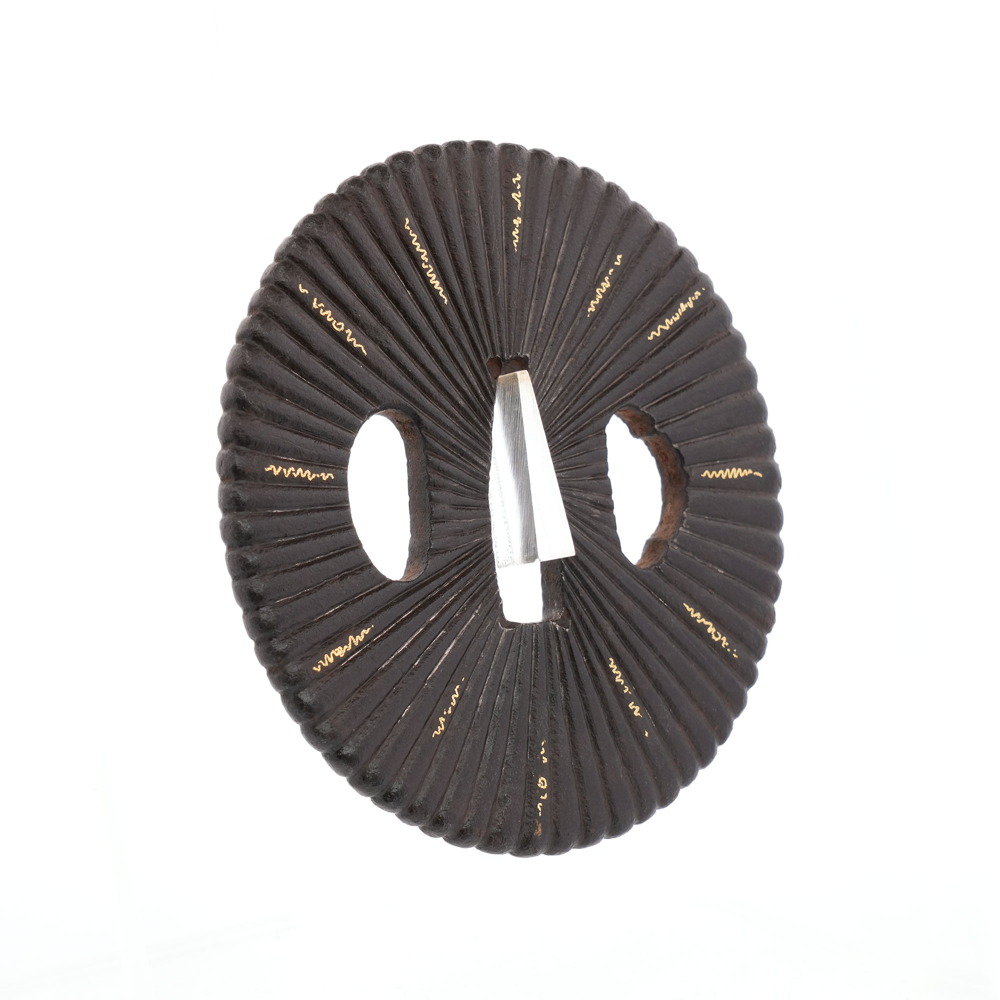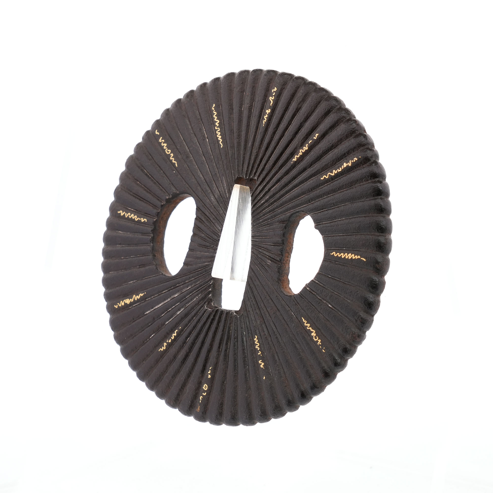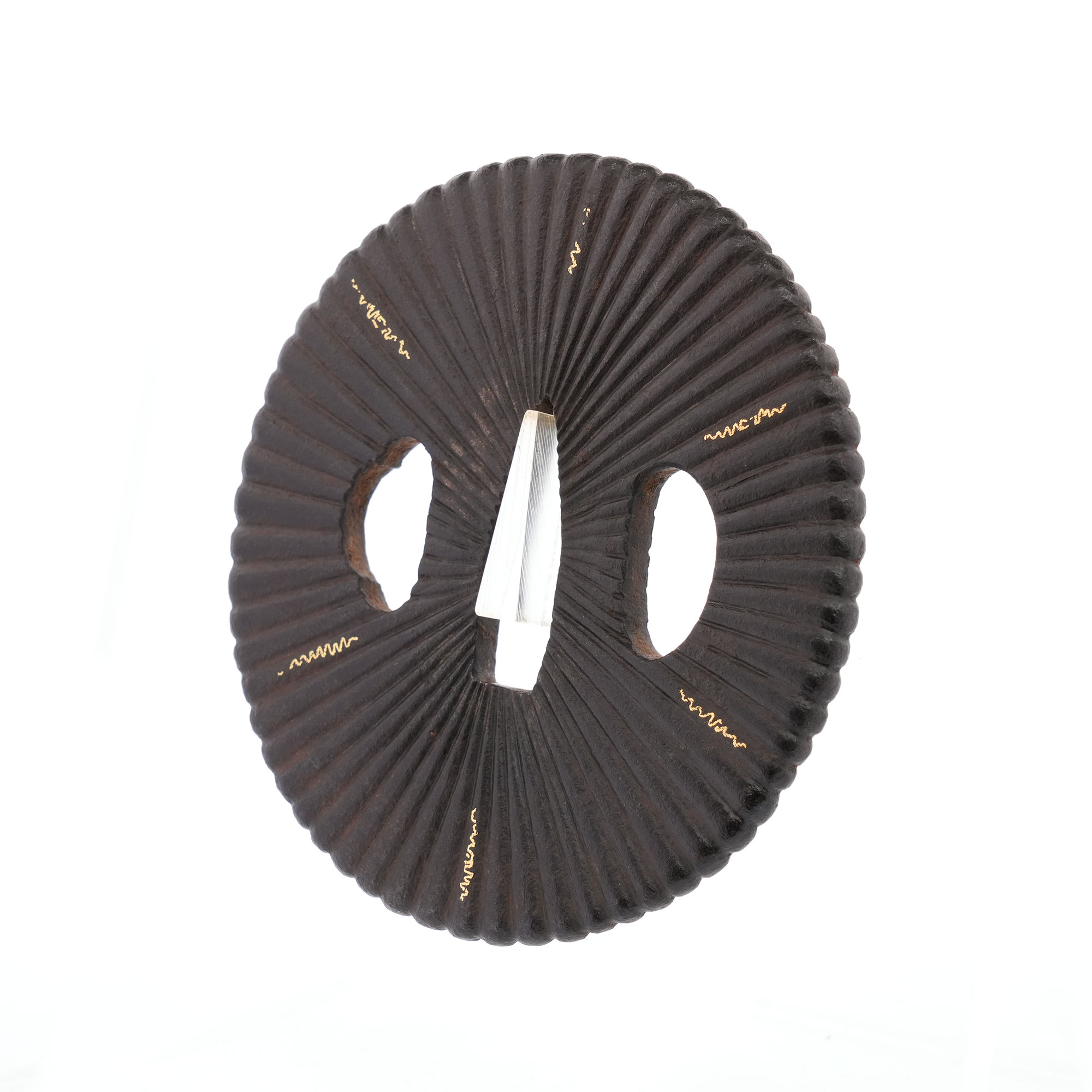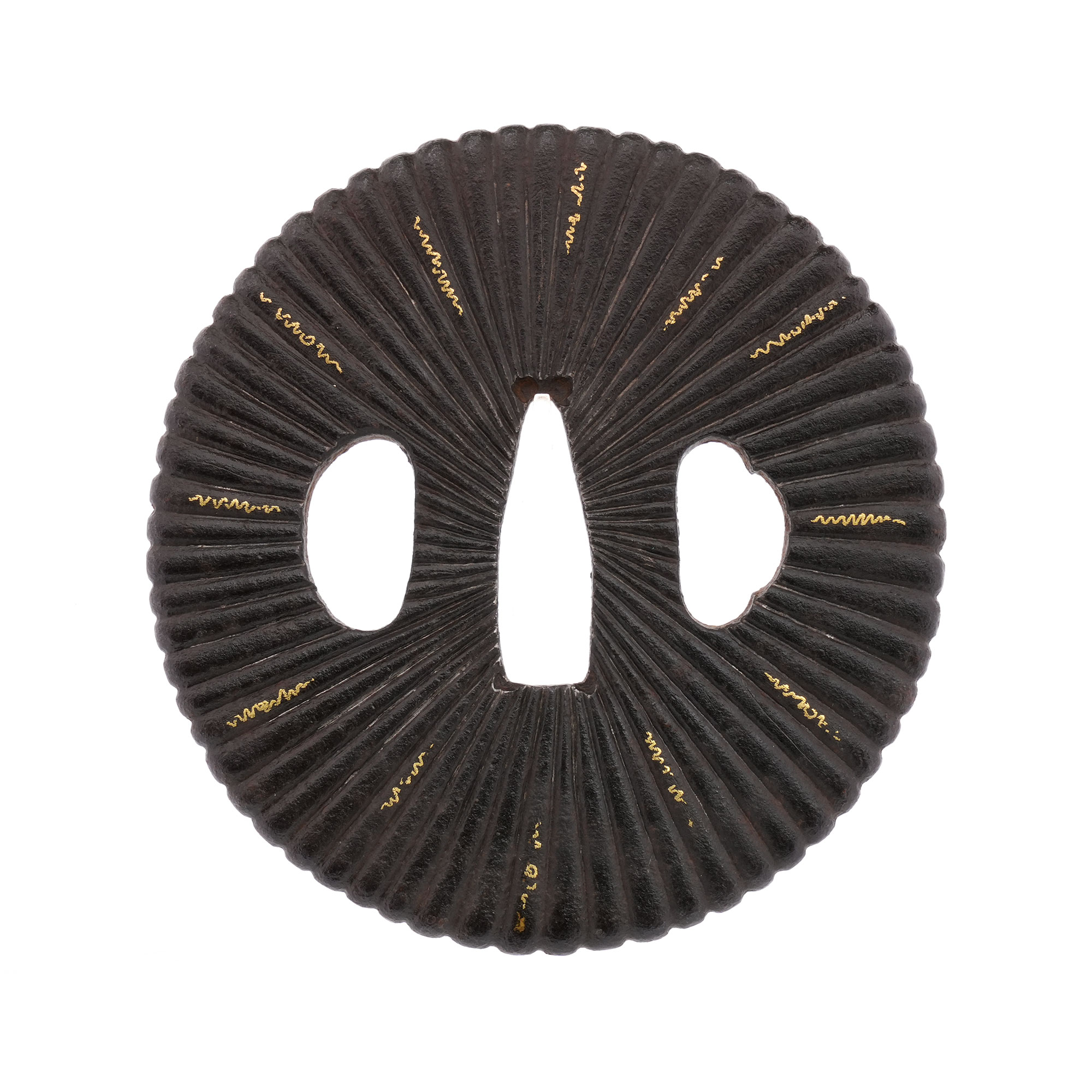 鍛えのよい鉄地に放射状の鑢目を精緻に施し、菊花を想わせる優美な姿に仕上げた鐔。大小いずれの象嵌にも剥離は殆ど認められず、往時の風趣を今に伝える健全な佳作である。